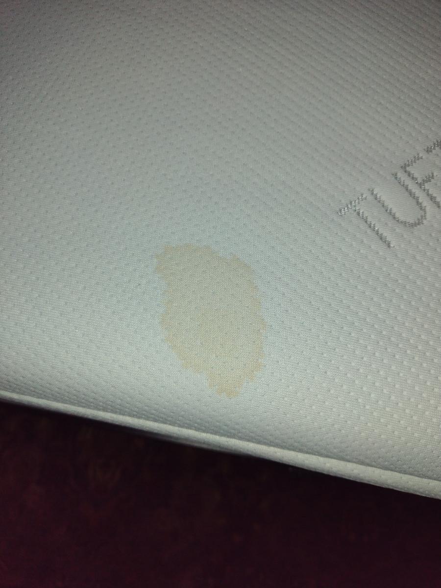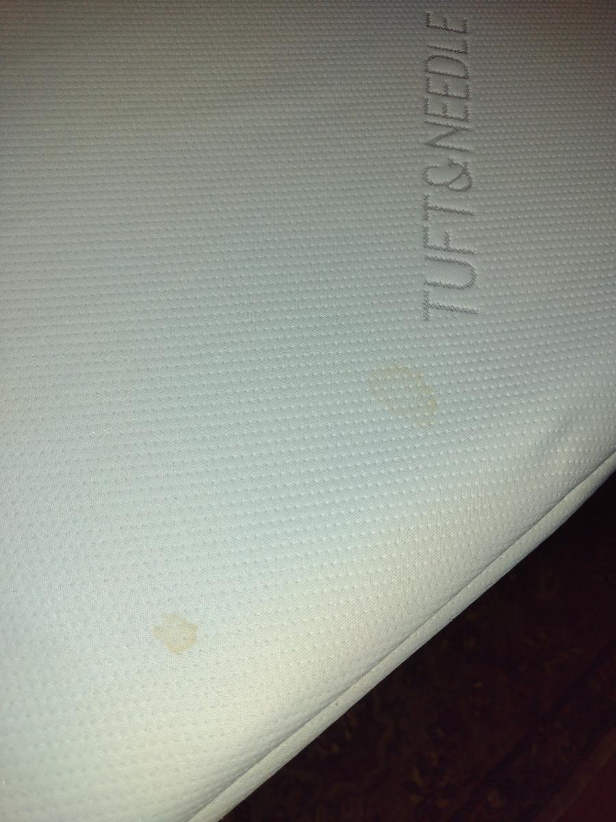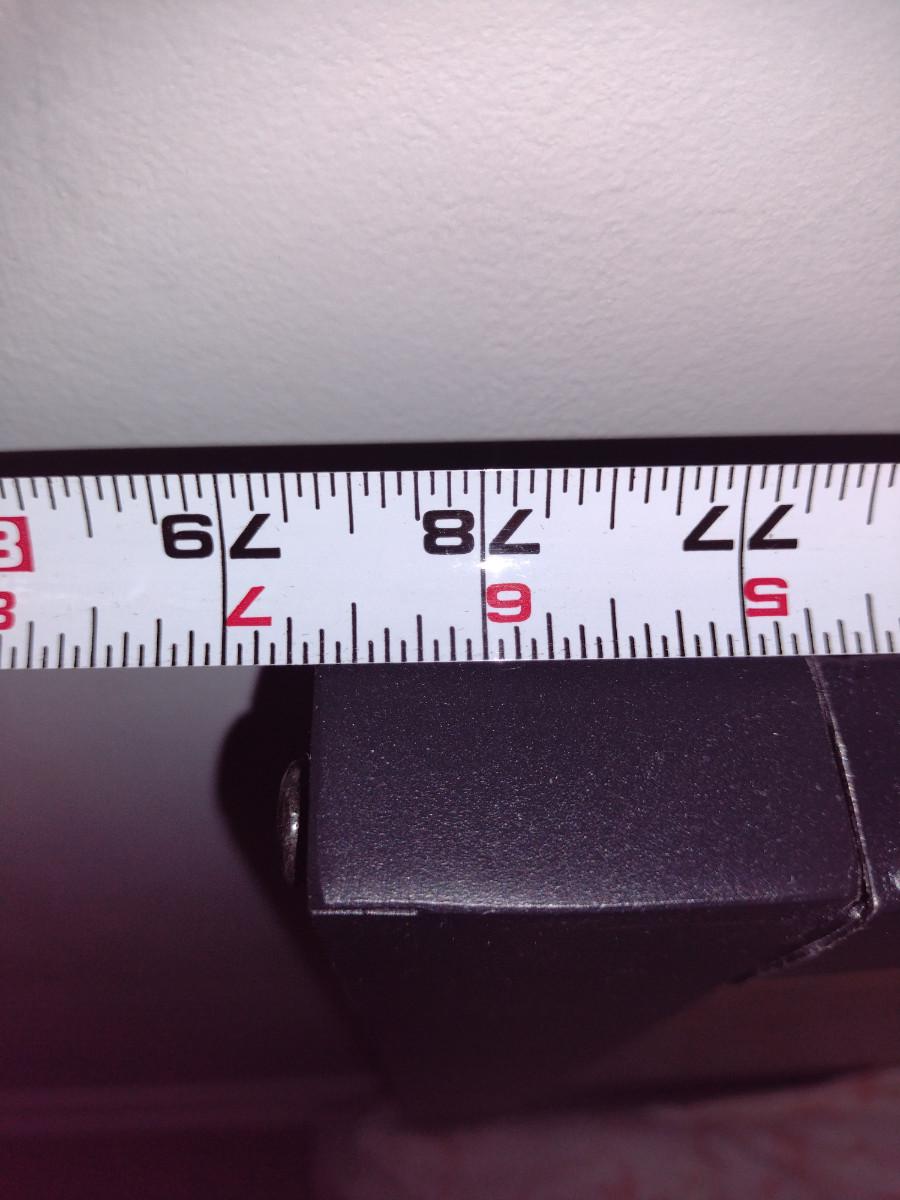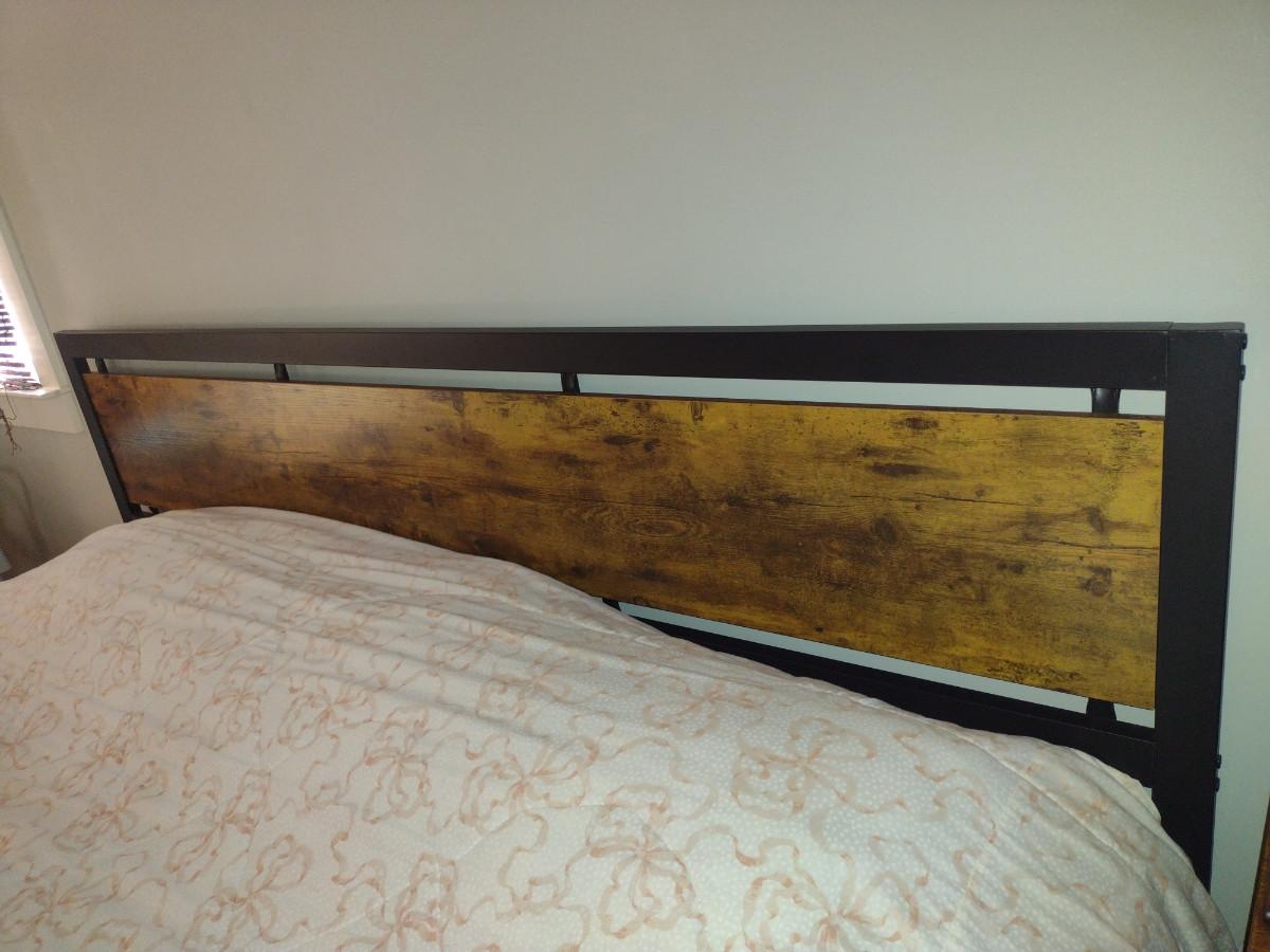 King Size Metal and Wood Bed Set with Mattress. Bedding not included. Mattress is Tuft & Needle and has some spotting- please see all pictures. Item measures approx 79" across, 82" long.