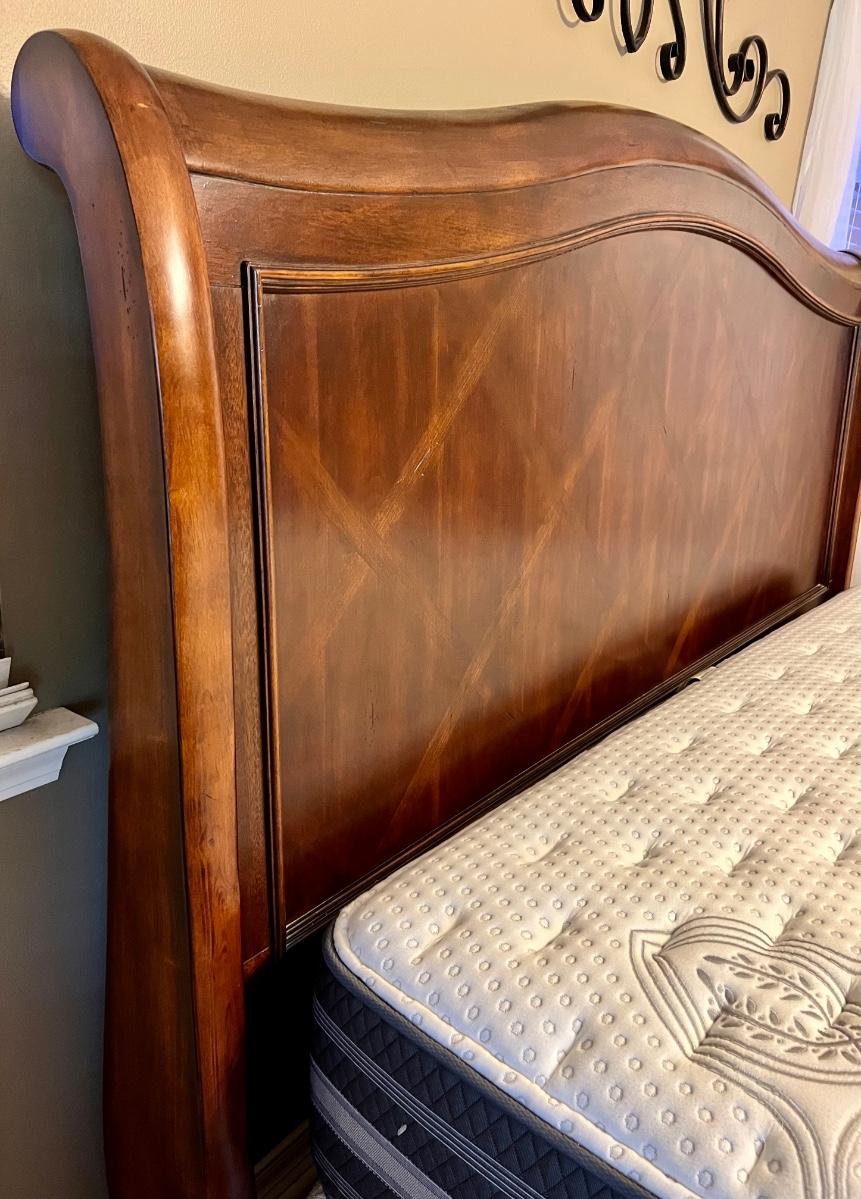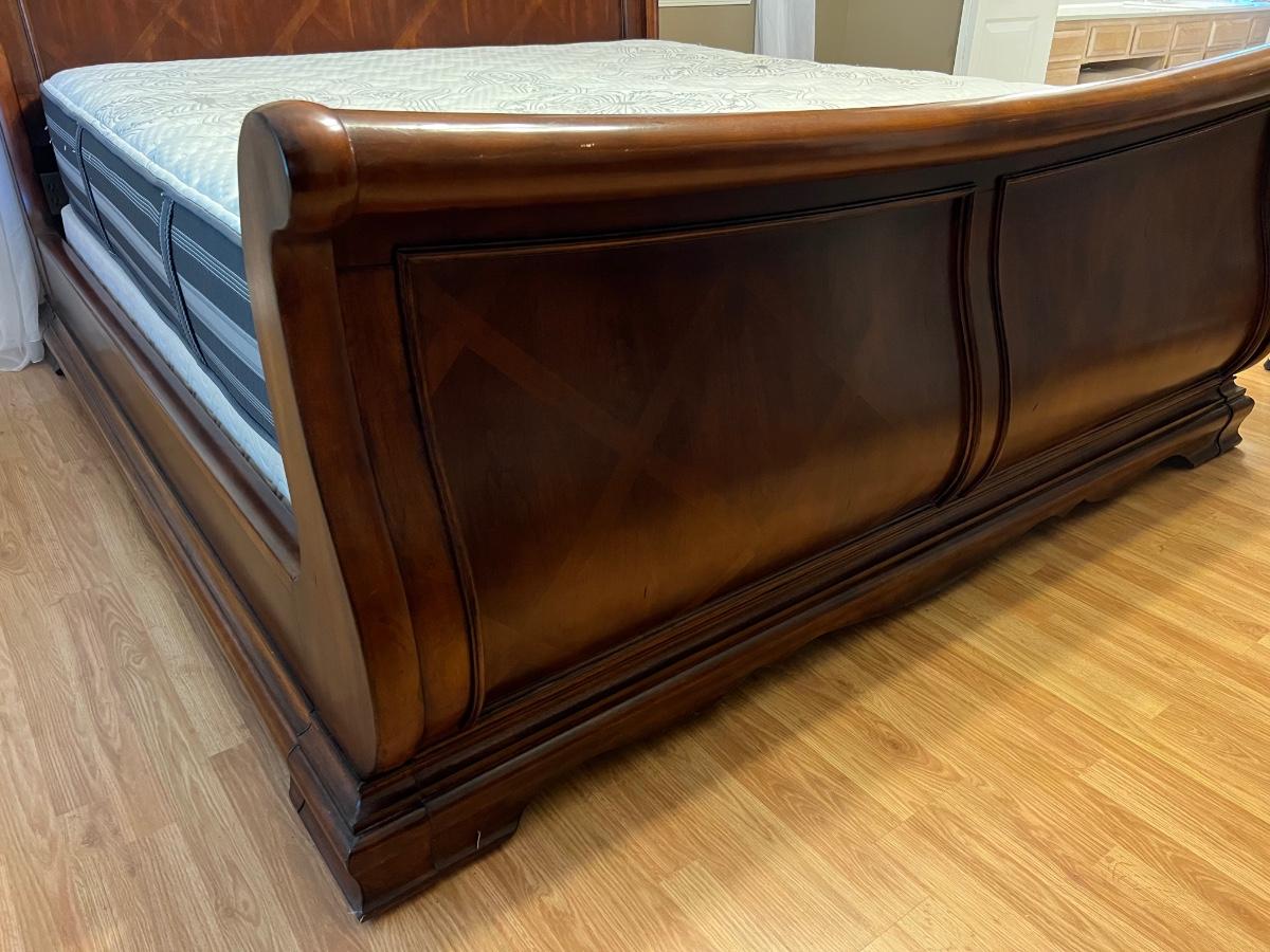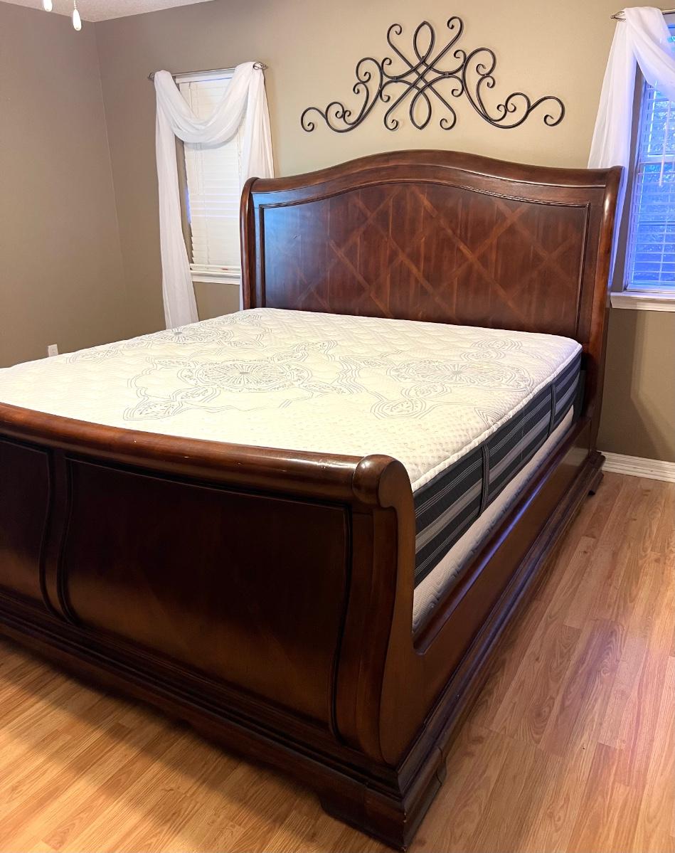 This thing is Solid! King size sleigh set. Included headboard, footboard, side rails, BEAUTYREST BLACK mattress and box spring. Headboard measures 62 inches tall and footboard measures 36 inches tall. Mattress has a few small spots that will require you to spot clean. Winner can leave the mattress and box spring if desired.