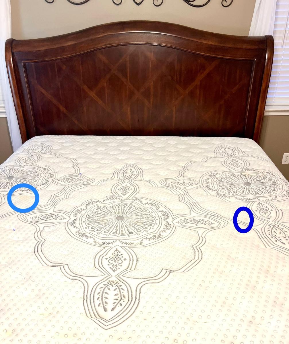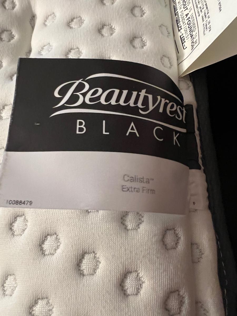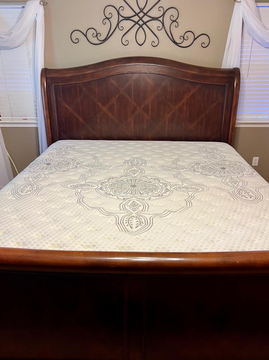 This thing is Solid! King size sleigh set. Included headboard, footboard, side rails, BEAUTYREST BLACK mattress and box spring. Headboard measures 62 inches tall and footboard measures 36 inches tall. Mattress has a few small spots that will require you to spot clean. Winner can leave the mattress and box spring if desired.