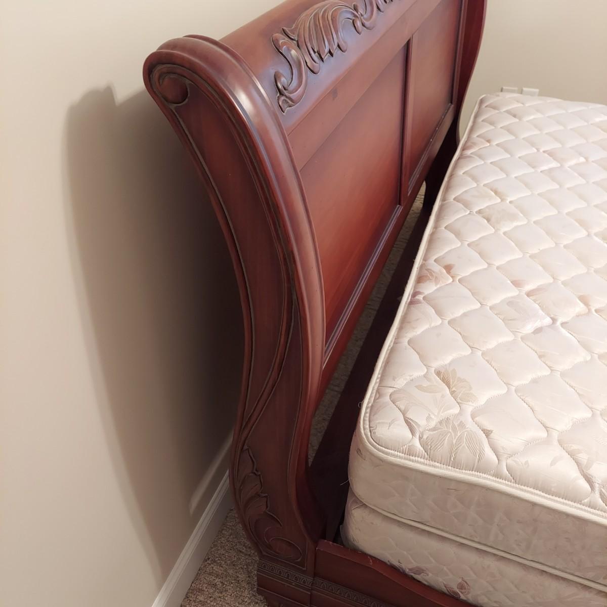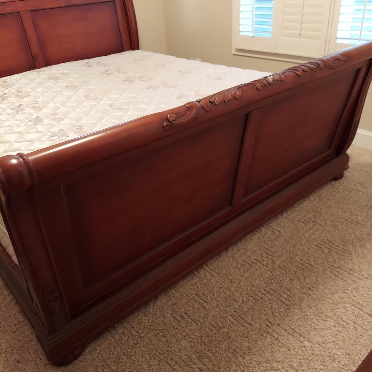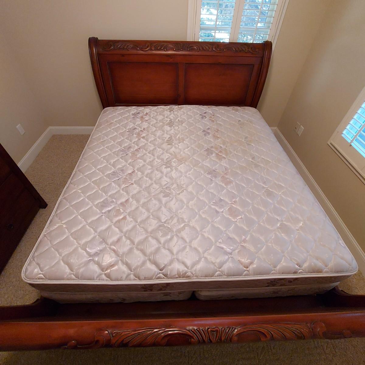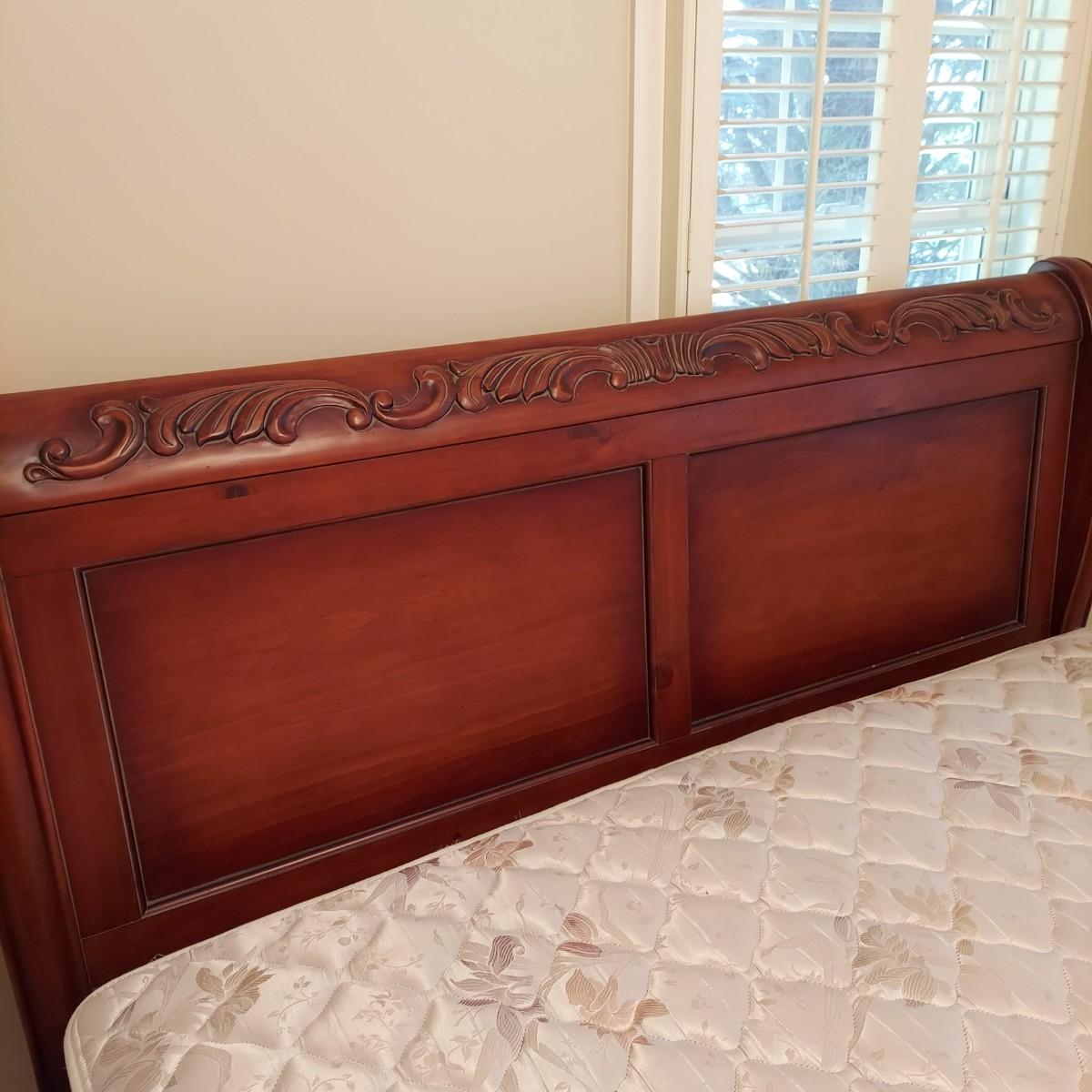 King Size dark oat solid wood sleigh bed with carved detail. Frame measures approximately 78" x 100" x 50"H. The mattress is available to the winning bidder if desired, but the winning bidder is not required to take it. Frame will need to be disassembled by the winning bidder when item is picked up. Comforter is not included, but can be found with other king bedding in this sale. Local Pickup OnlyWinning bidder must bring assistance to help move and load this item due to its weight and/or size. Item is located in basement.