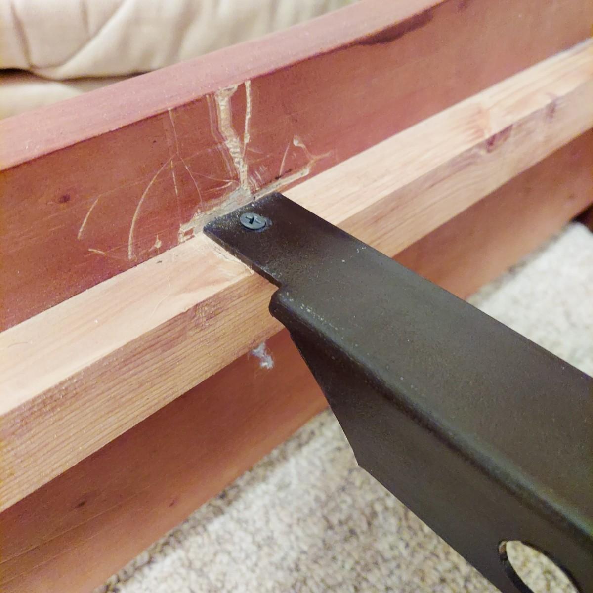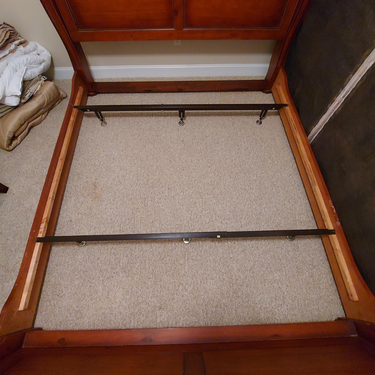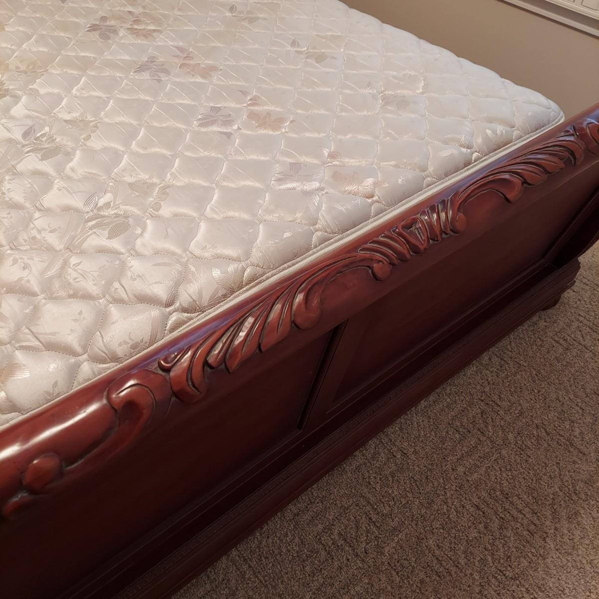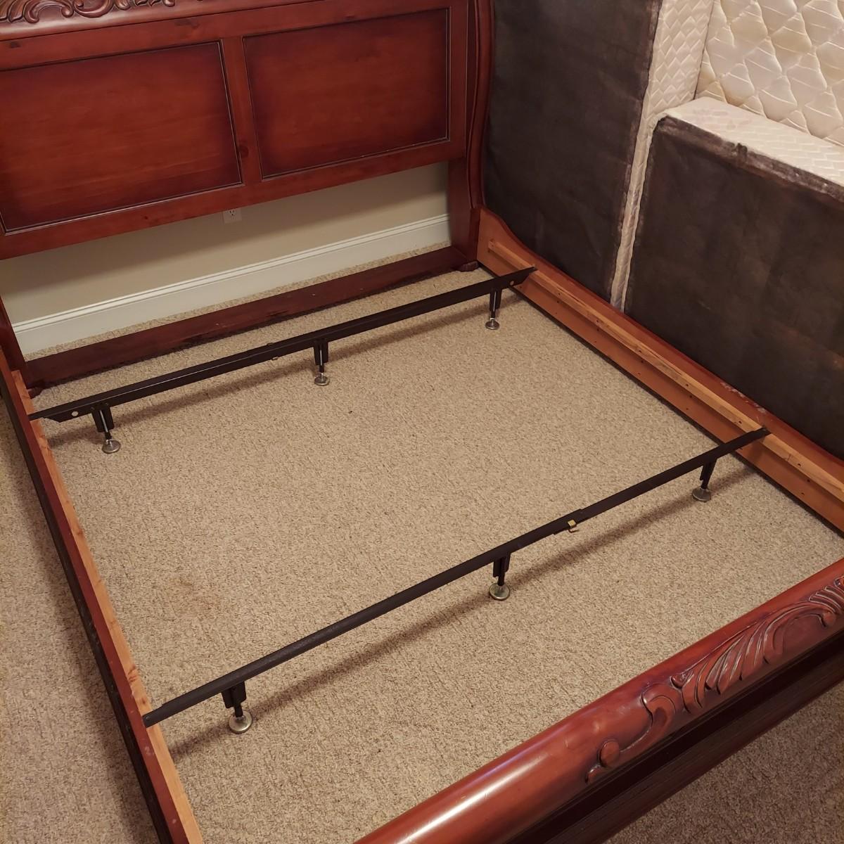 King Size dark oat solid wood sleigh bed with carved detail. Frame measures approximately 78" x 100" x 50"H. The mattress is available to the winning bidder if desired, but the winning bidder is not required to take it. Frame will need to be disassembled by the winning bidder when item is picked up. Comforter is not included, but can be found with other king bedding in this sale. Local Pickup OnlyWinning bidder must bring assistance to help move and load this item due to its weight and/or size. Item is located in basement.