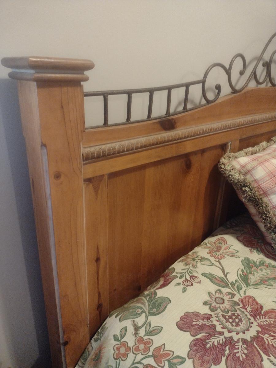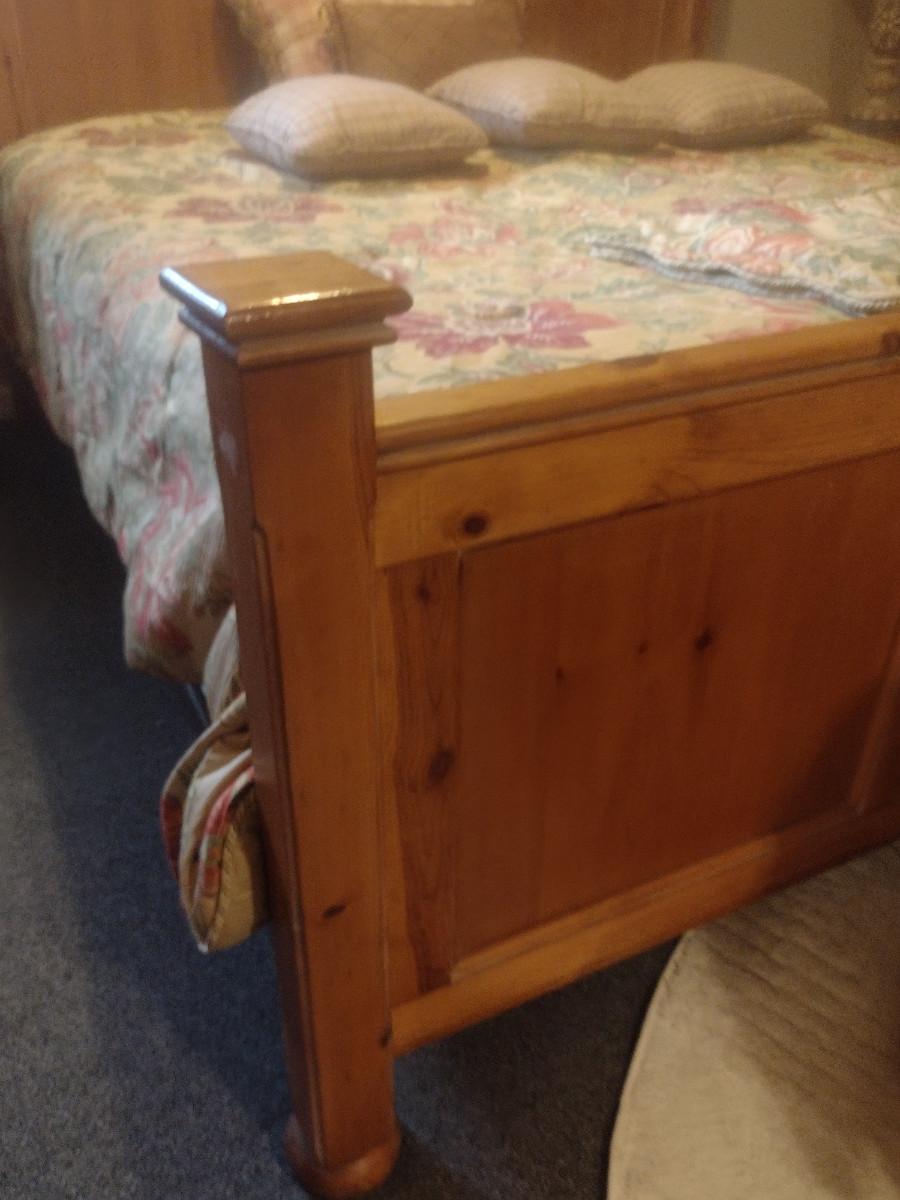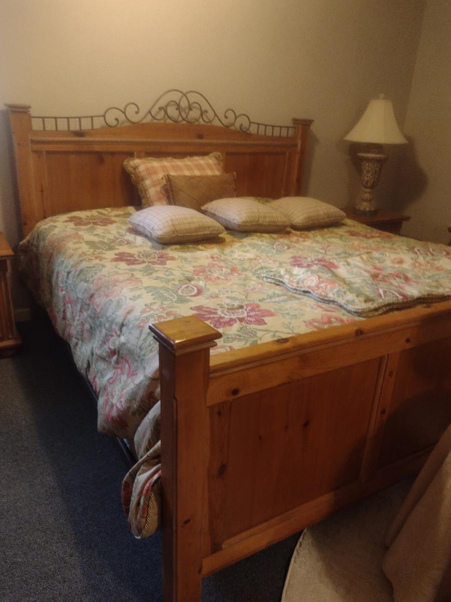 King Size Wood Frame Bed with Mattress. Bedding not included.