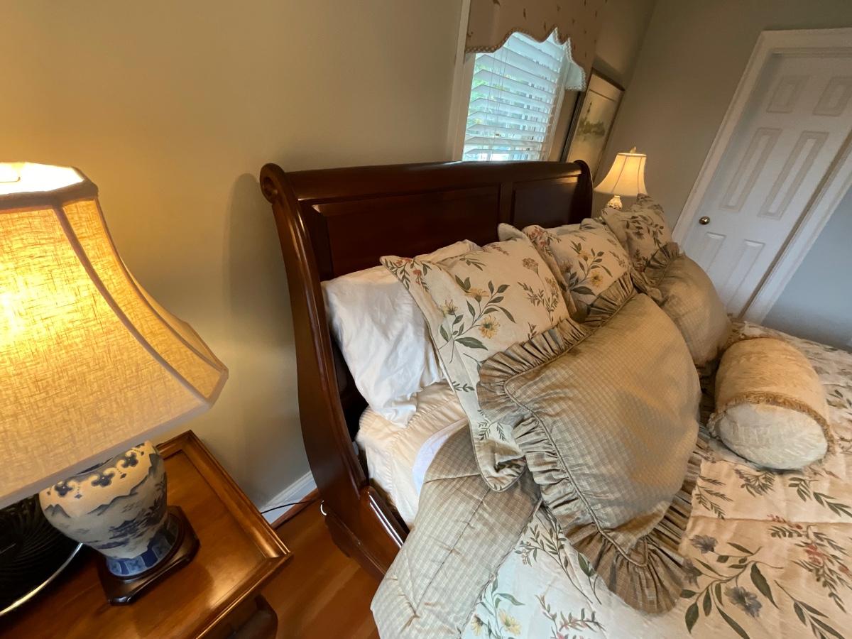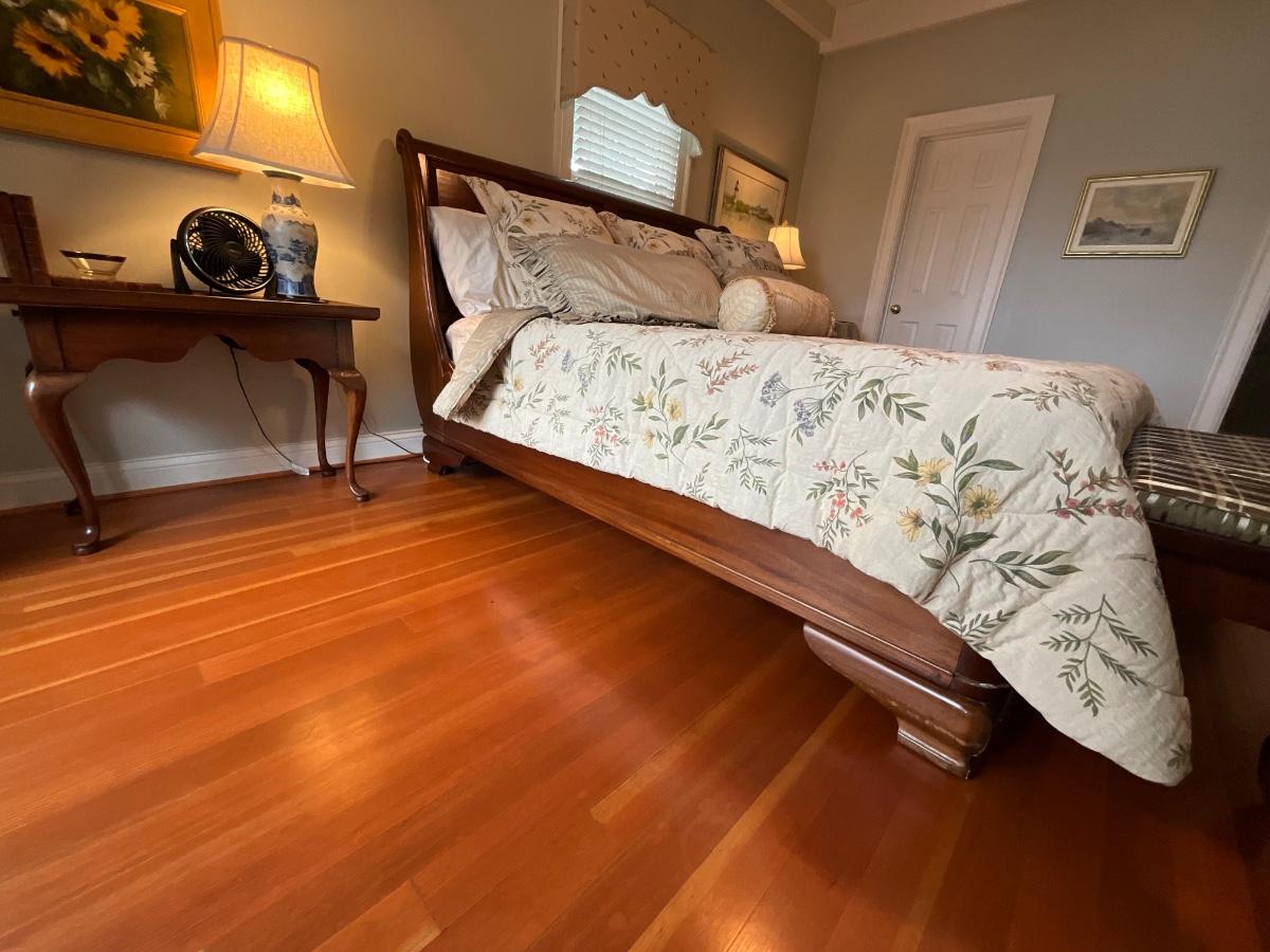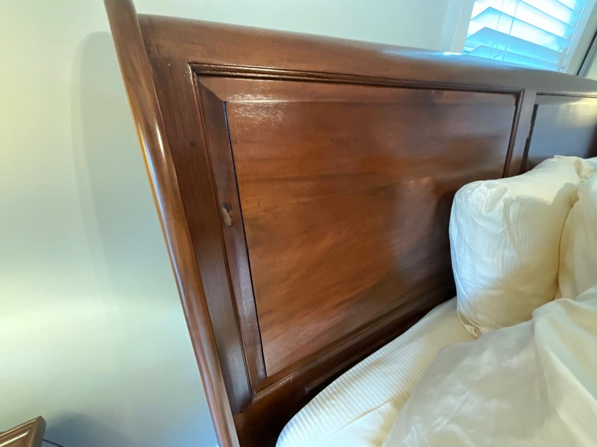 King size wood sleigh bed 50.5 inches tall 83 inches long 80 inches wide. Skirted Table