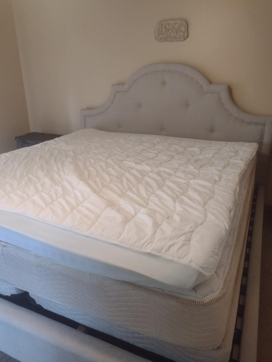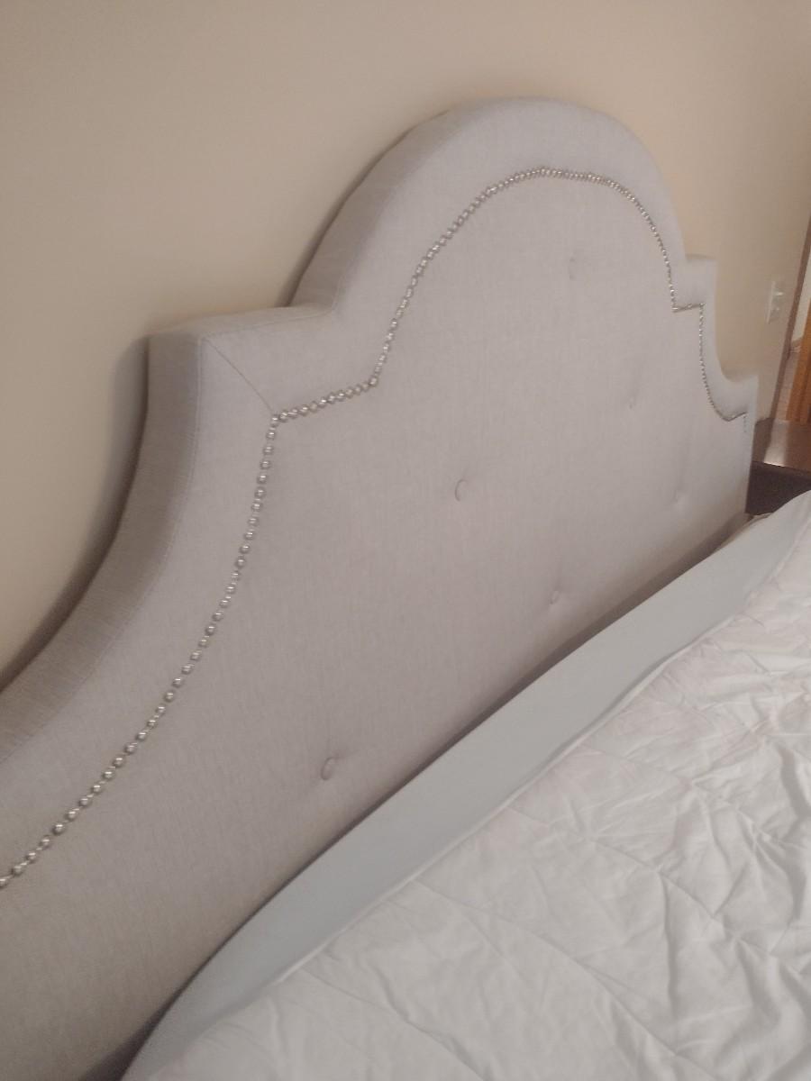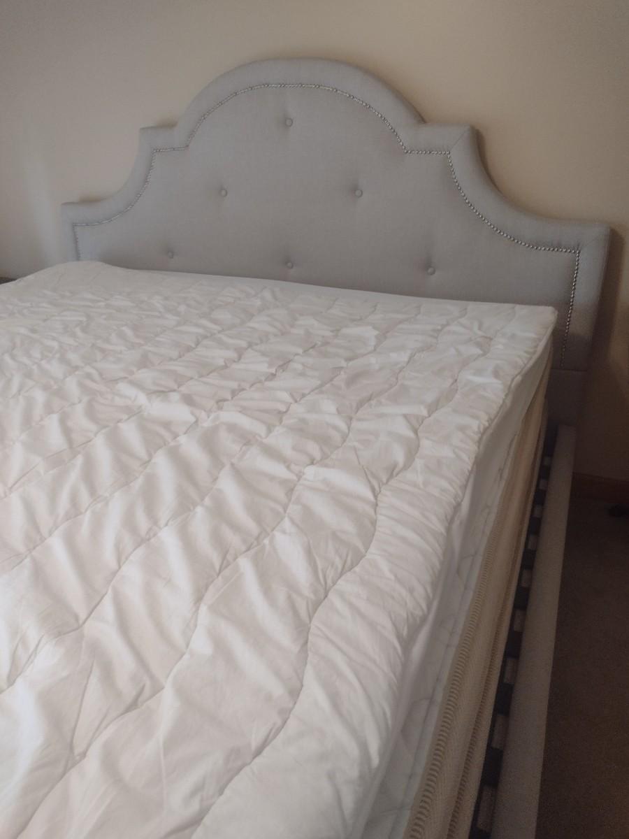 King Sized French Country Design Fabric Bed Frame with Serta Mattress Set. Some of the fabric at foot board has been picked by passing sweeper or pet as shown, otherwise in very good condition.