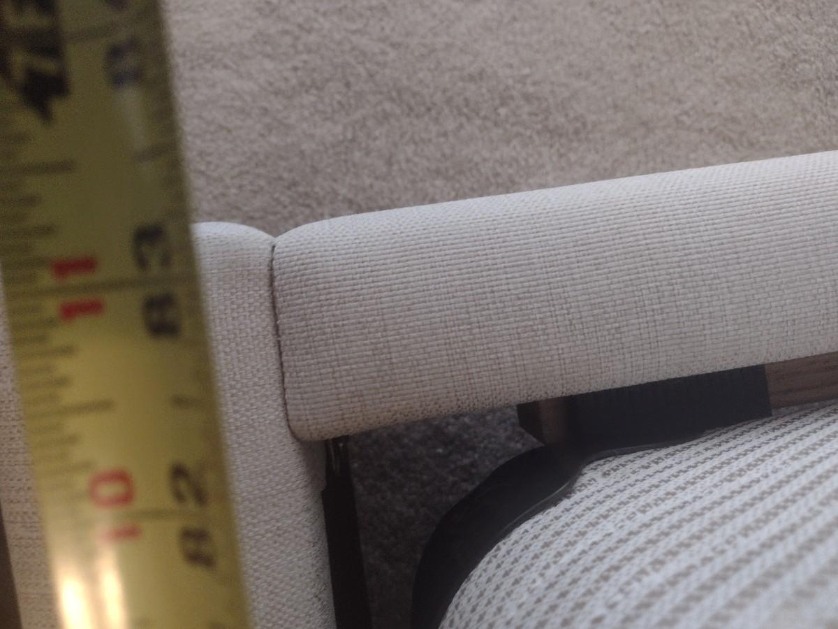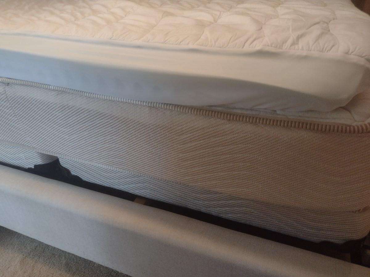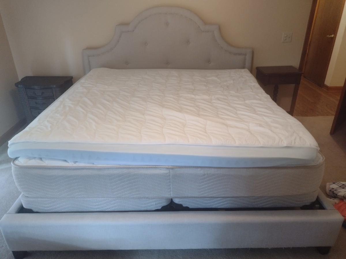 King Sized French Country Design Fabric Bed Frame with Serta Mattress Set. Some of the fabric at foot board has been picked by passing sweeper or pet as shown, otherwise in very good condition.