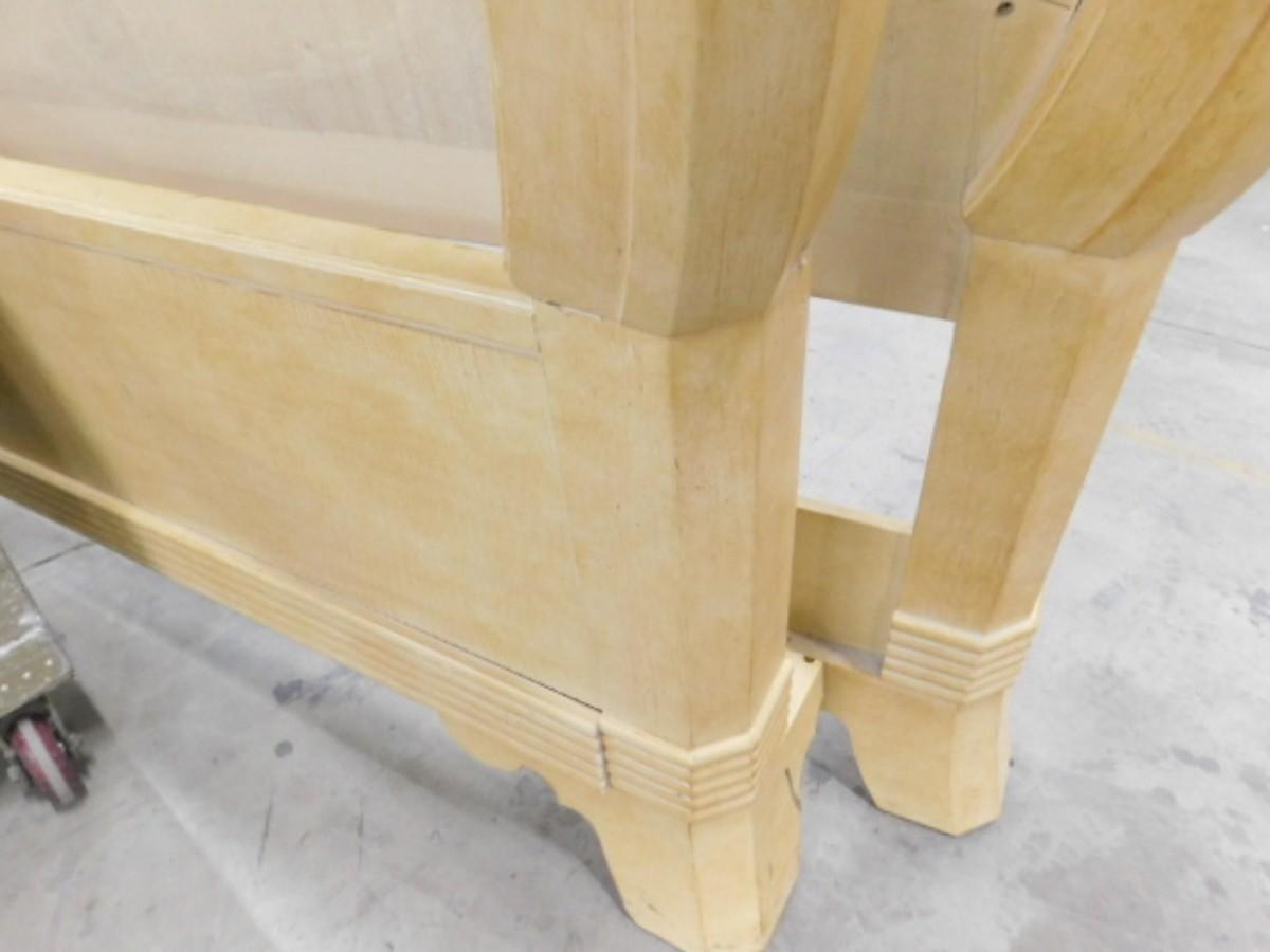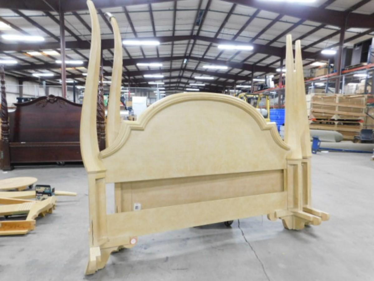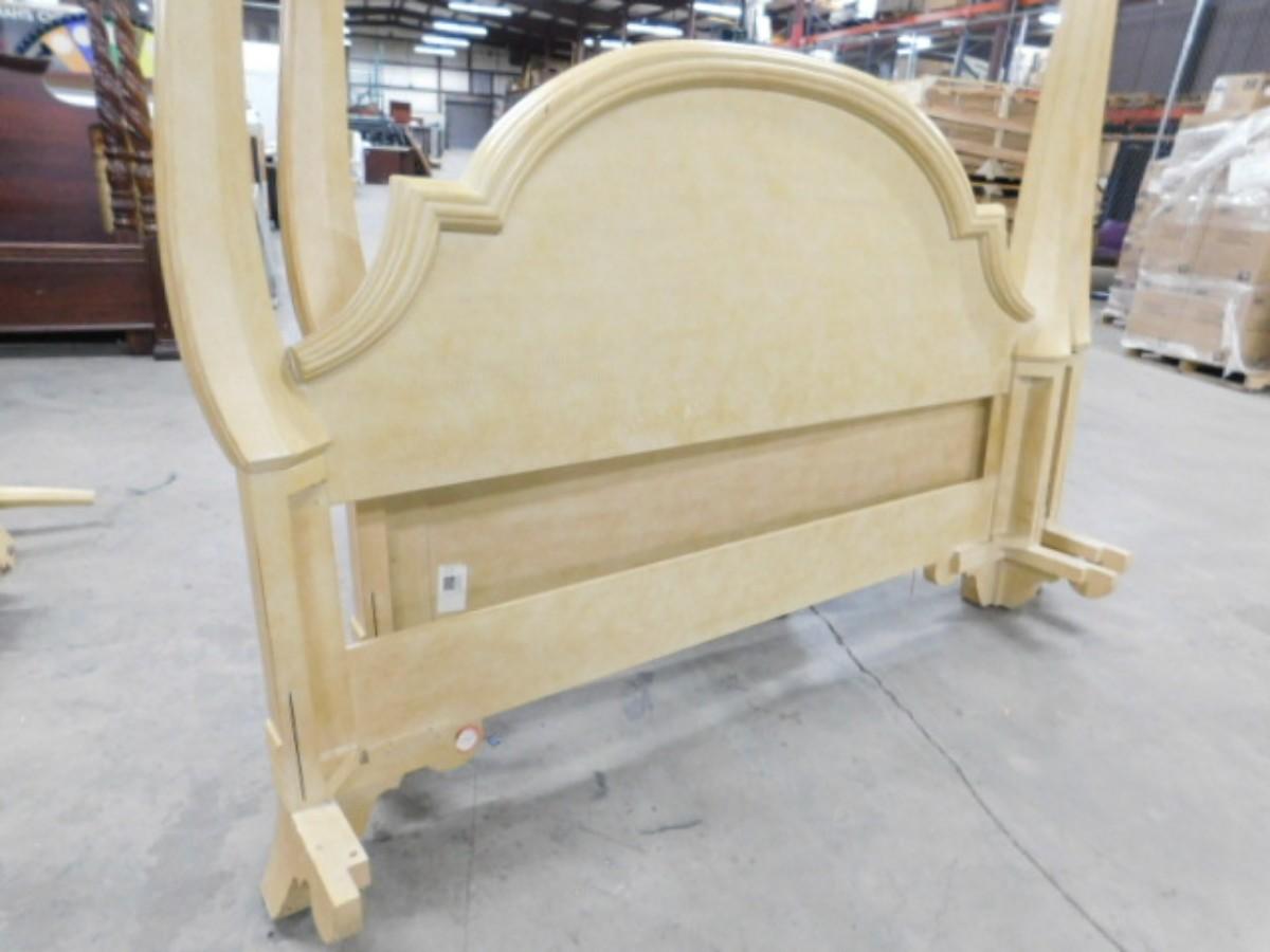 King Sized French Country Head and Foot Board Bed Frame with Side Rails. Expect some wear and scratches to finish. Shipping option available via freight or local mover at Buyer's expense. Buyer must have all shipping scheduled within the stated dates and times of pickup. Recommended local mover is Beaty Bros. Moving 828-201-2982