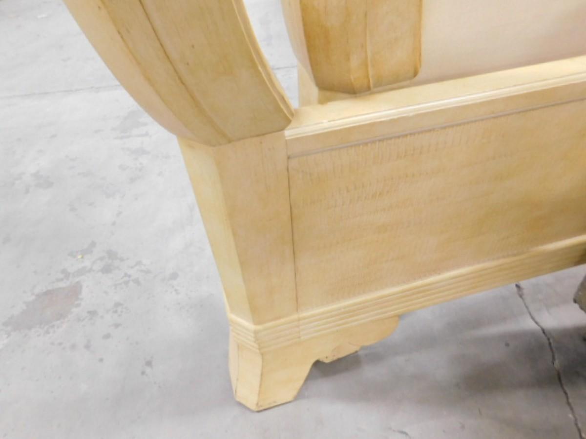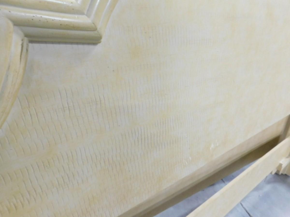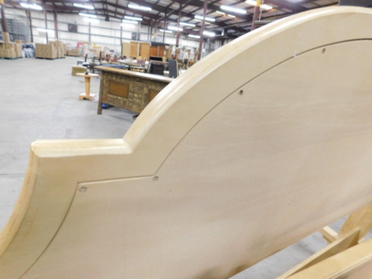 King Sized French Country Head and Foot Board Bed Frame with Side Rails. Expect some wear and scratches to finish. Shipping option available via freight or local mover at Buyer's expense. Buyer must have all shipping scheduled within the stated dates and times of pickup. Recommended local mover is Beaty Bros. Moving 828-201-2982