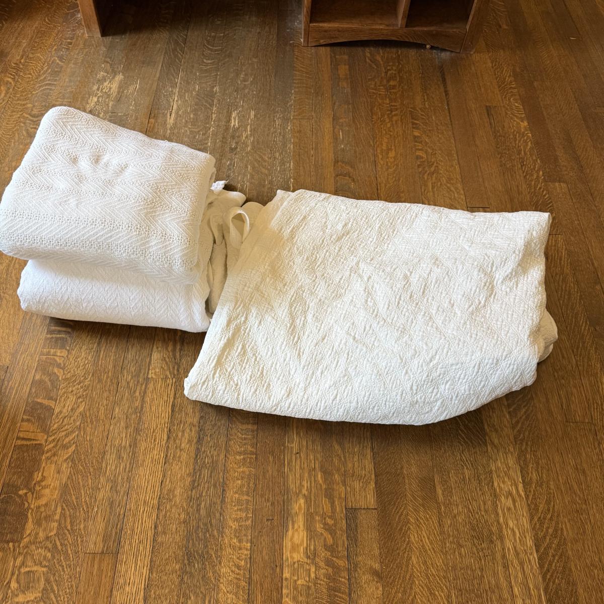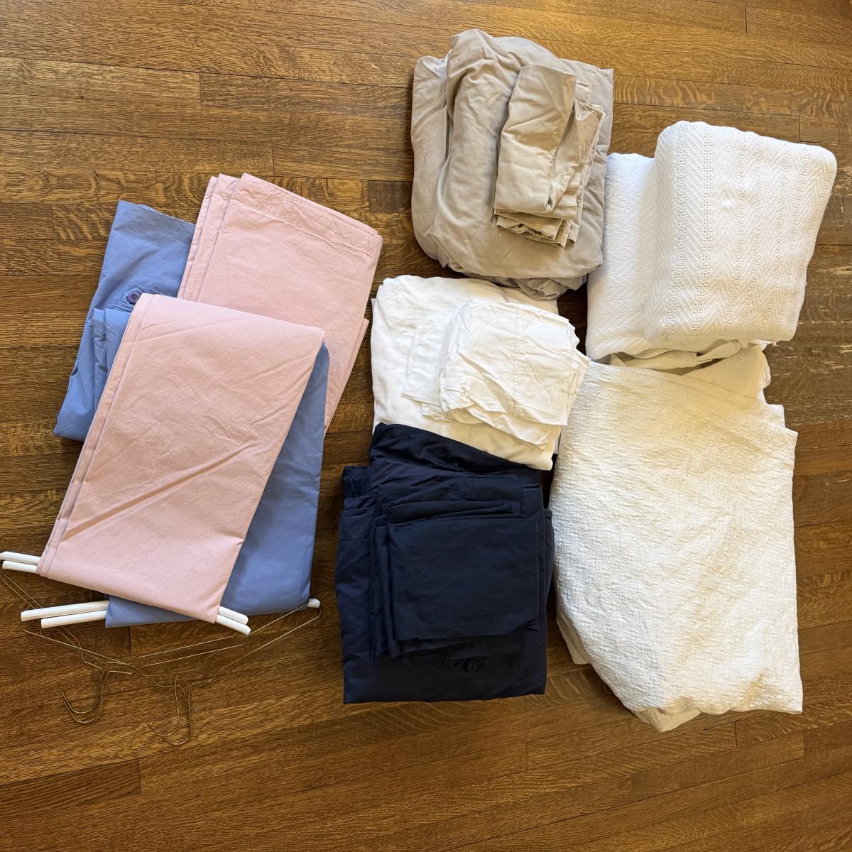 This lot contains an assortment of king-sized linen. There are three duvet covers, three sets of sheets (two of which are complete), and three cotton woven blankets. The duvet covers are colored baby pink, a baby blue and a striped navy. All appear to be 100% cotton. The baby blue and pink both fasten via buttons on one side, and the navy has a zipper. Next are three white cotton blankets. Two are a woven style and one has a skirt with scalloped edges. The blanket with scalloped edges and one of the other white cotton blankets has a couple of small stains and blemishes, see pictures for details. Lastly, three sets of sheets. A navy set that comes with four pillowcases and only a top sheet. A white set with two pillowcases, a fitted and a top sheet. And a beige set with two pillowcases, a fitted and a top sheet. The beige set has a few small bleach stains on the fitted sheet. Local pick up only.