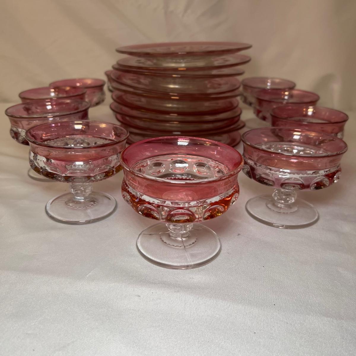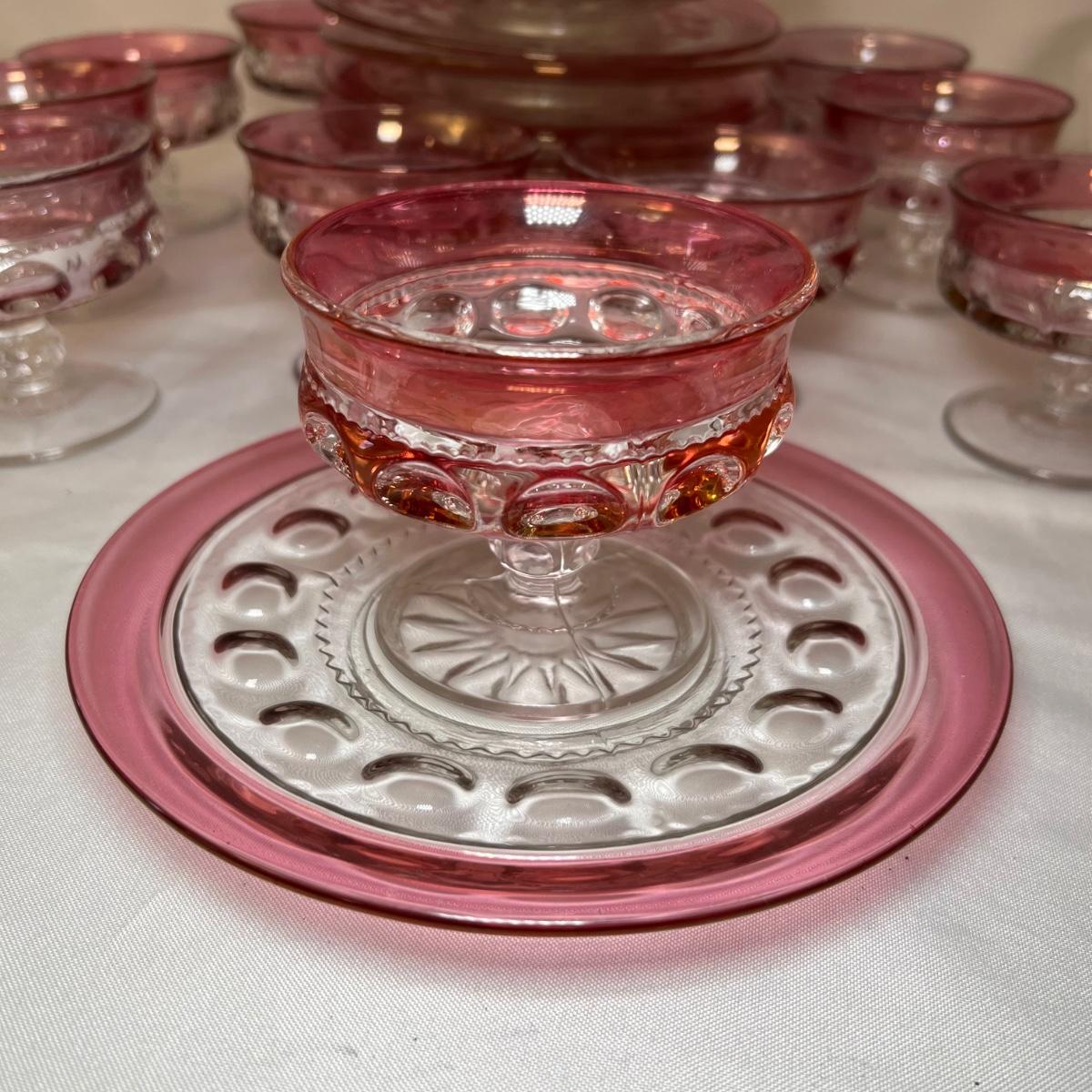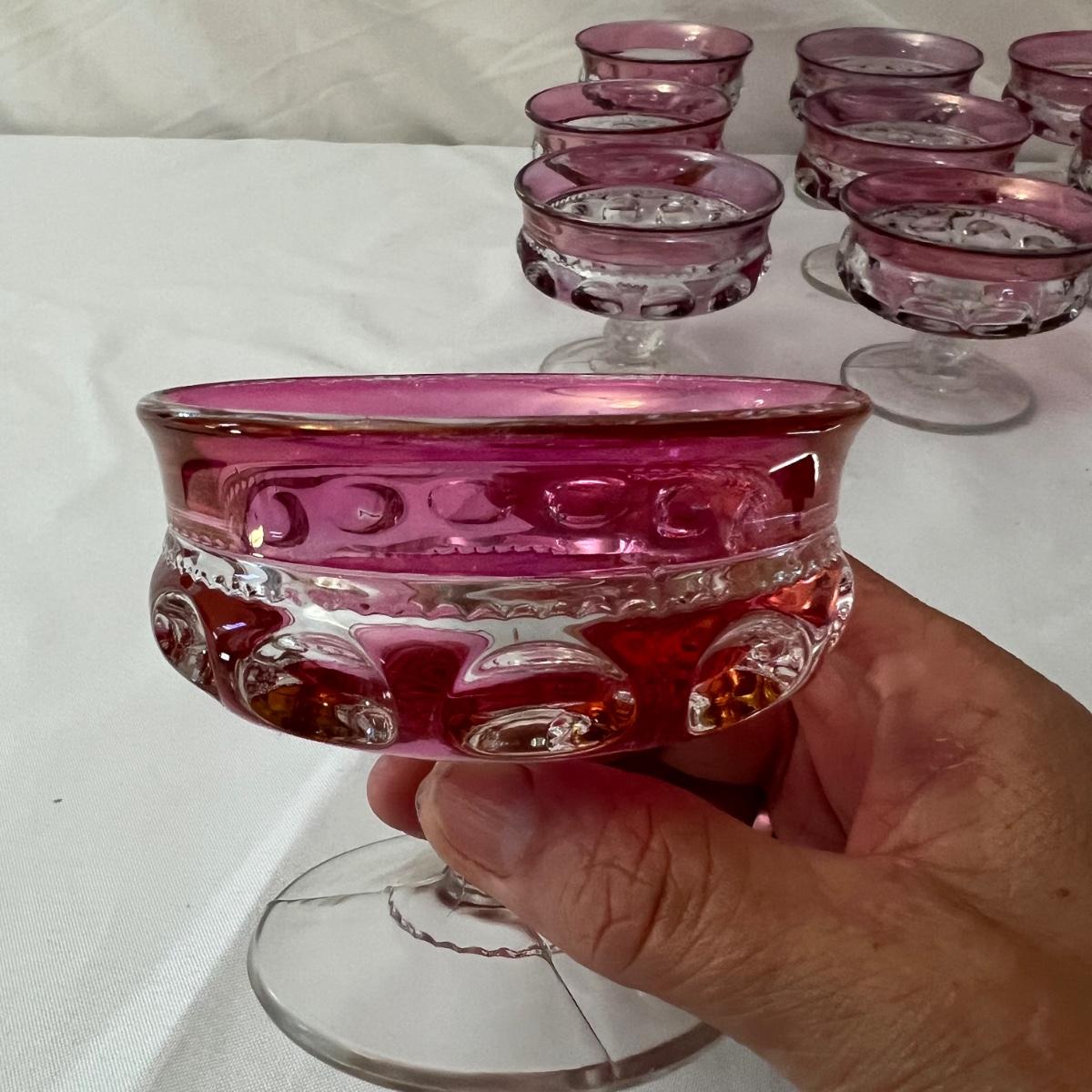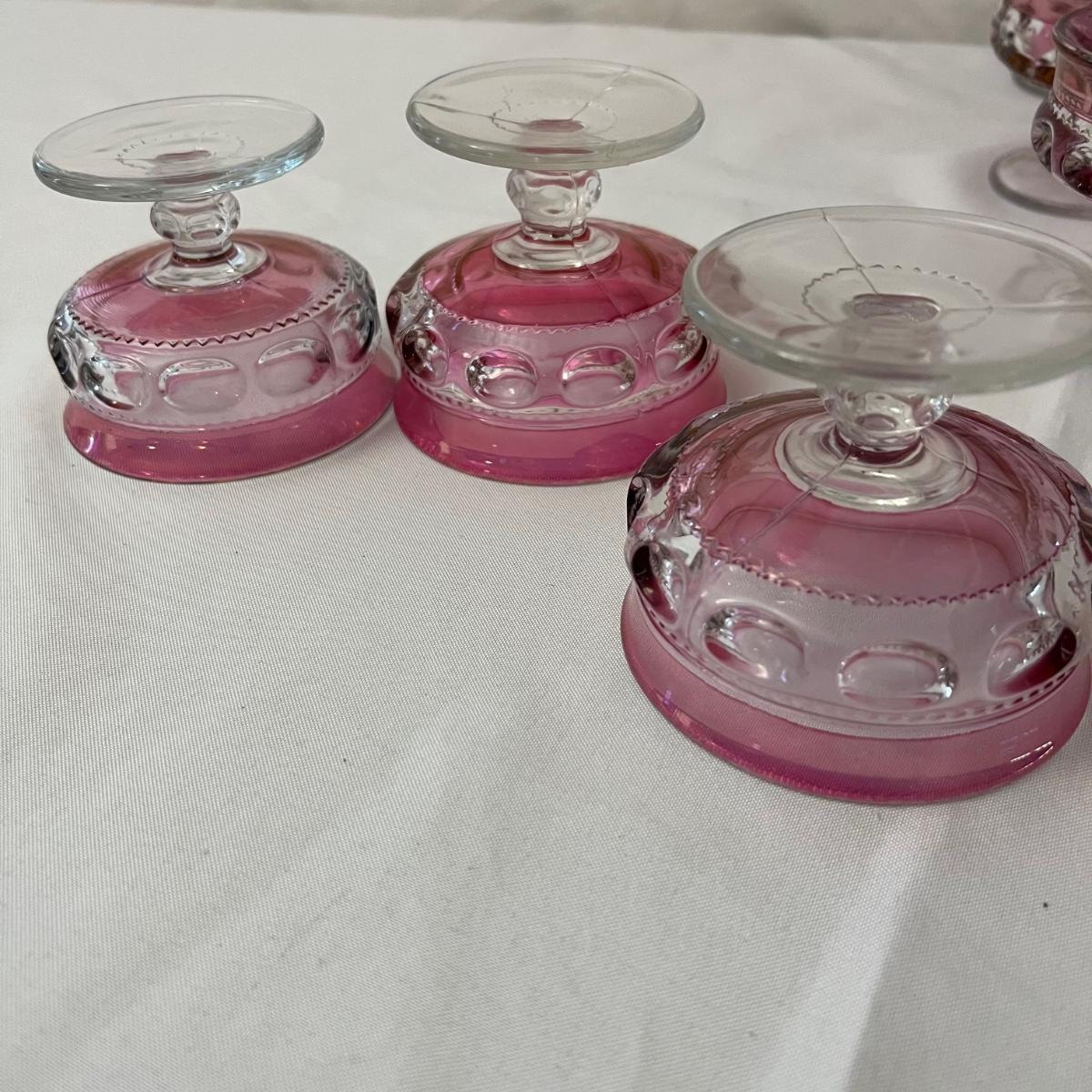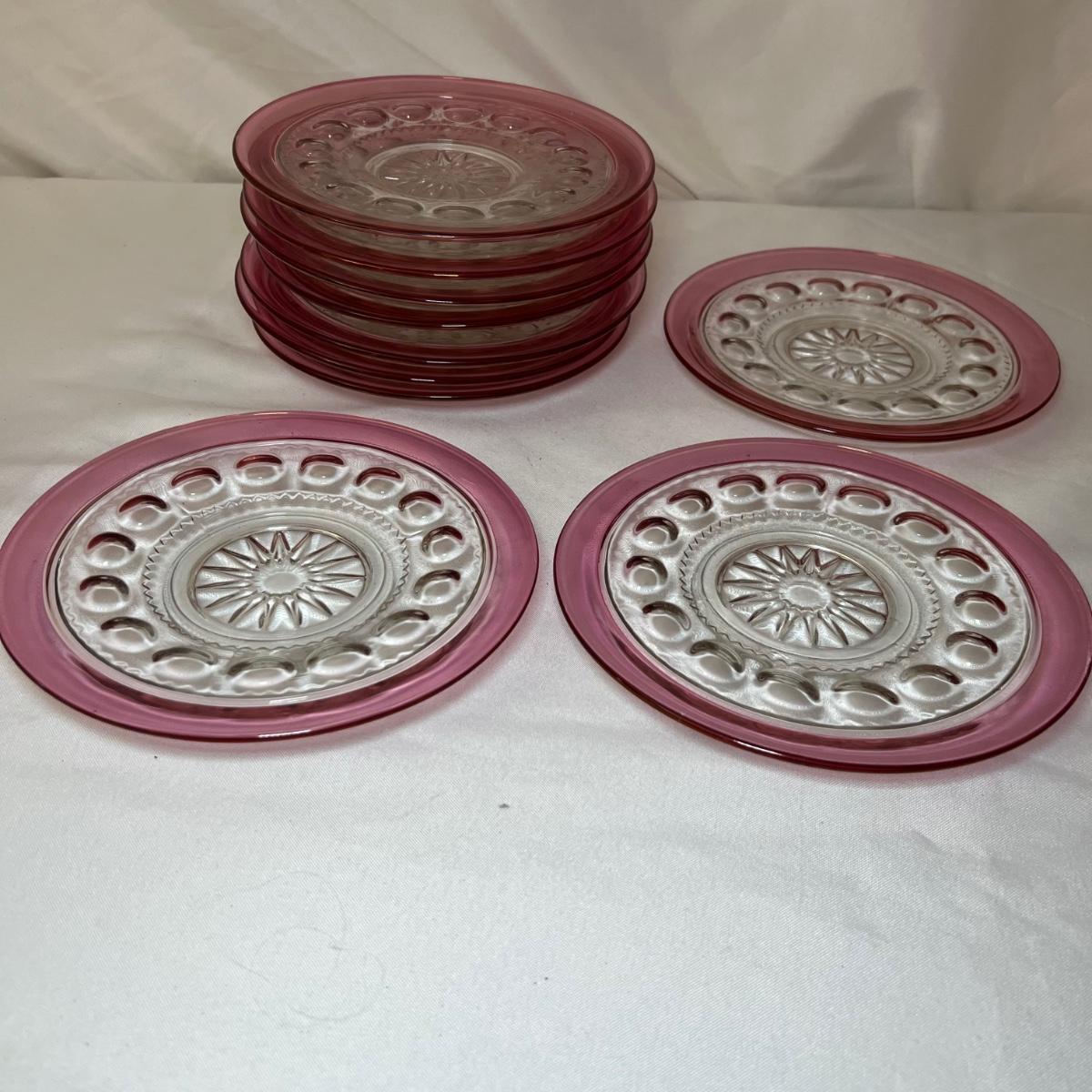 Ten each of glasses and side plates in this lot of formed glass with pink rims. There are some slight color variations in the colored glass, see images; some are lighter in pink color than others.