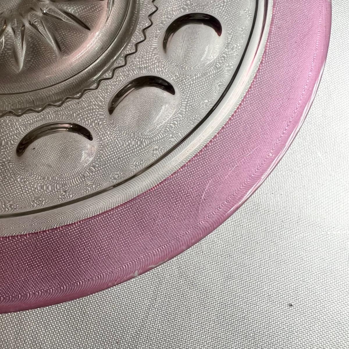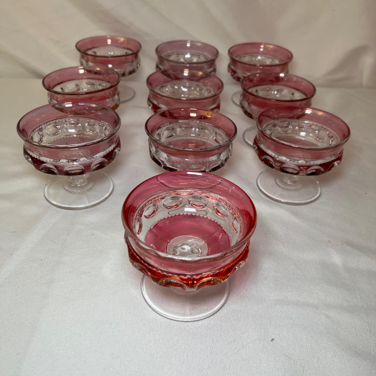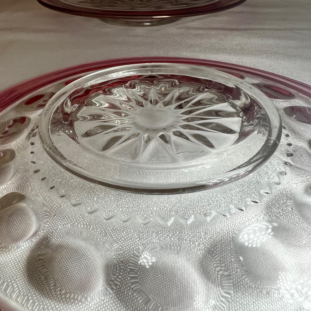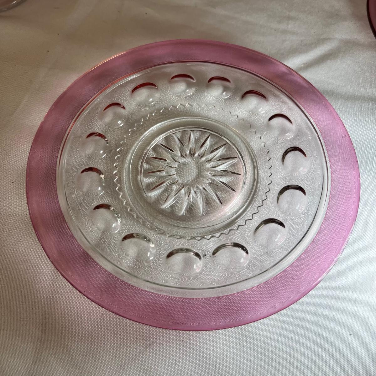 Ten each of glasses and side plates in this lot of formed glass with pink rims. There are some slight color variations in the colored glass, see images; some are lighter in pink color than others.