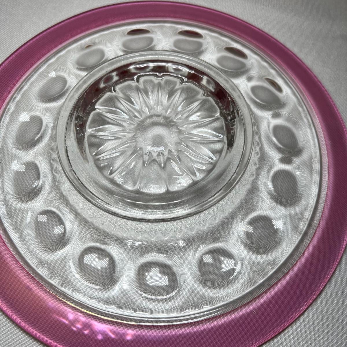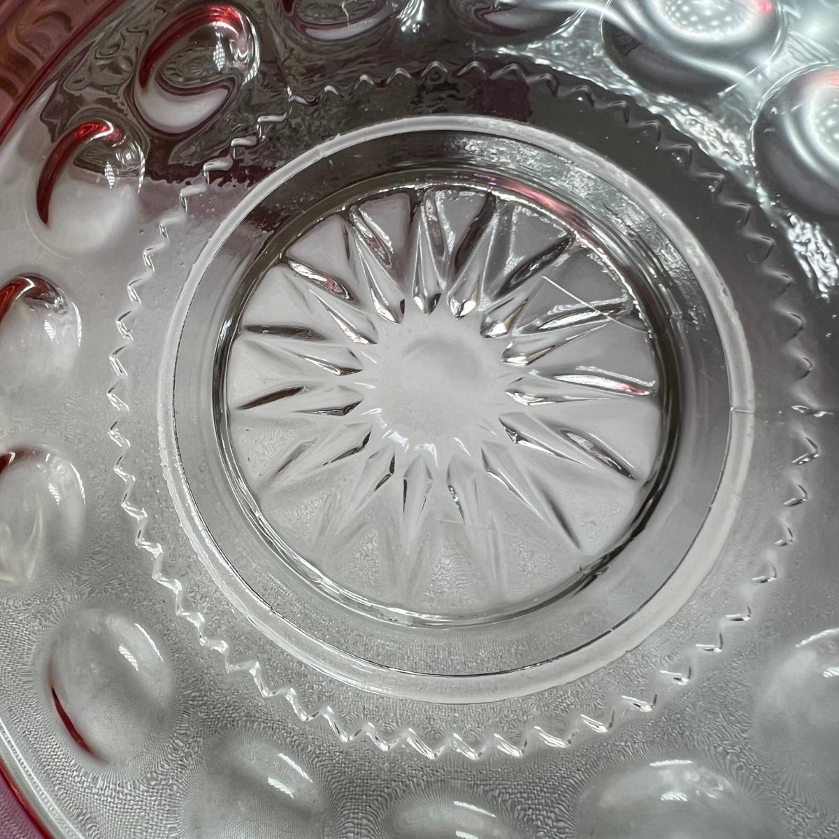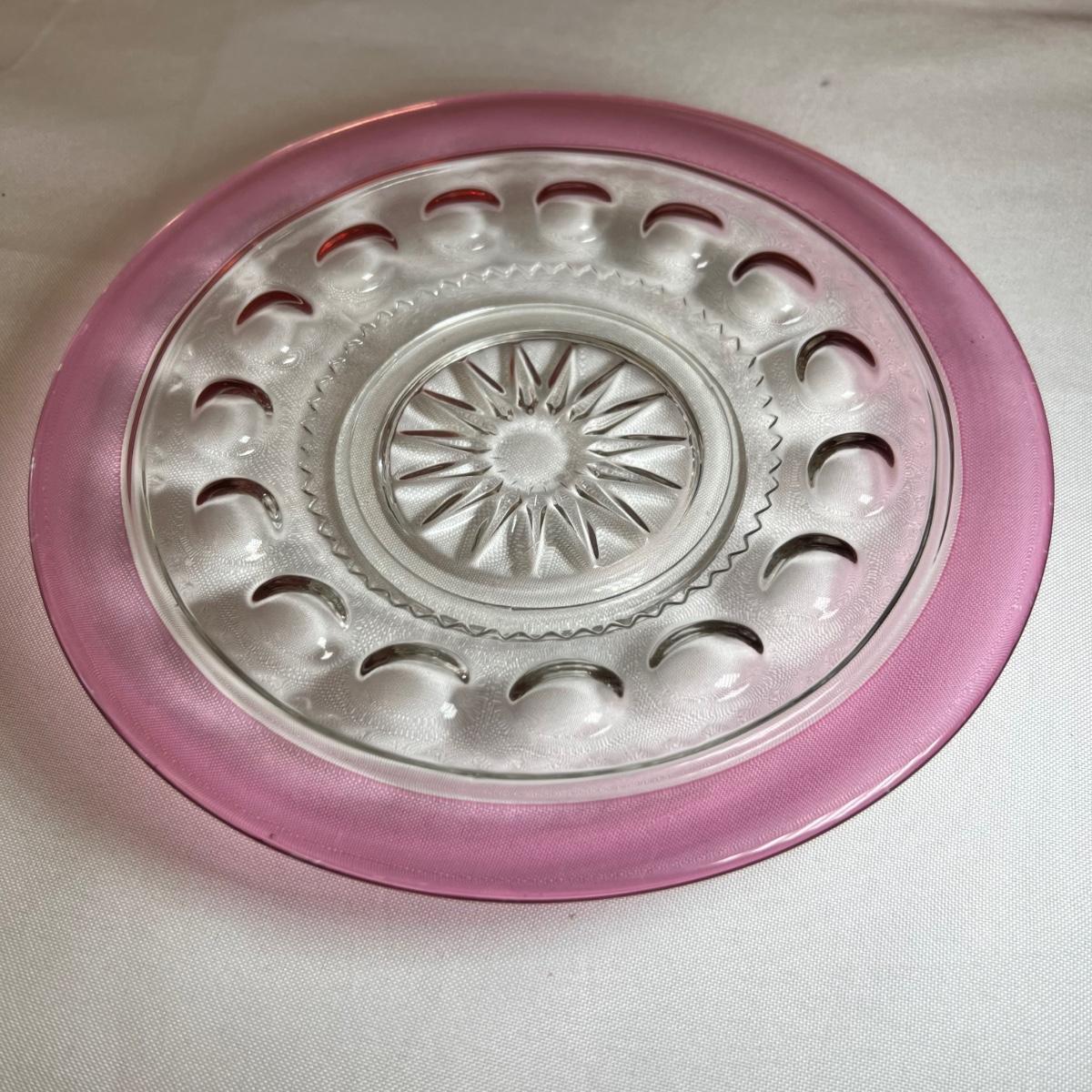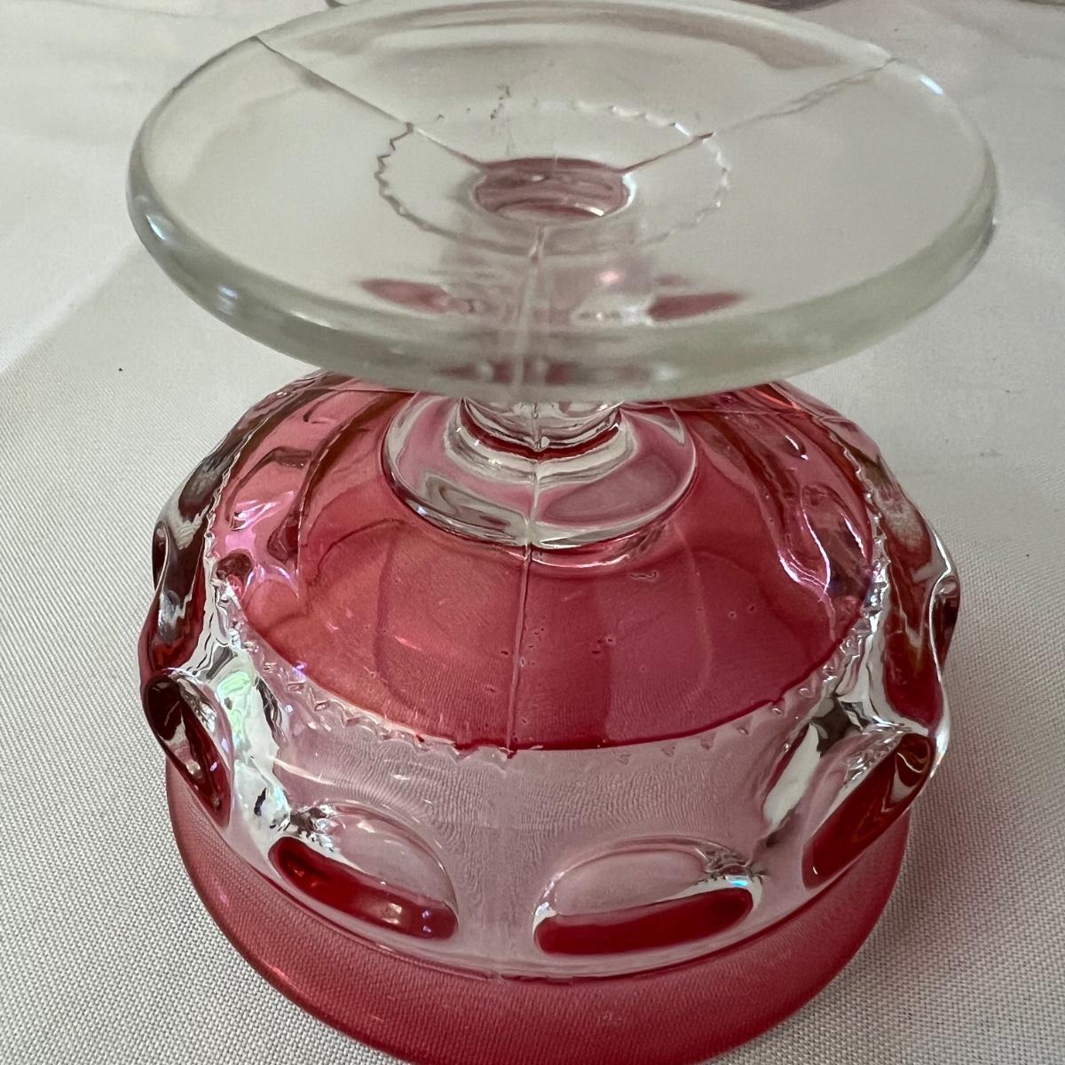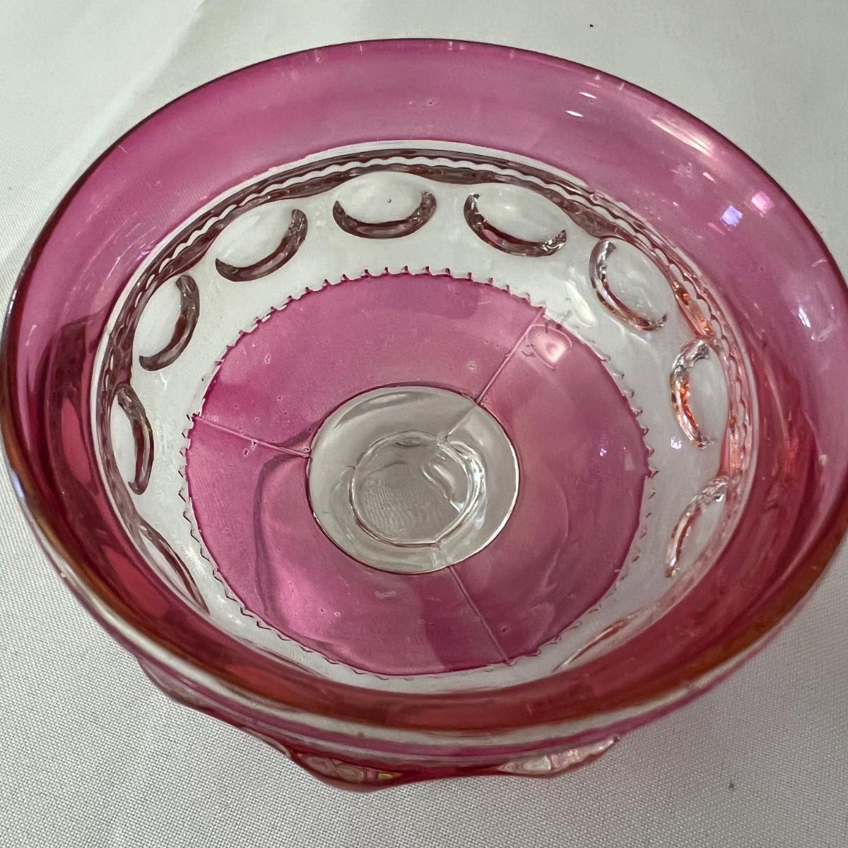Ten each of glasses and side plates in this lot of formed glass with pink rims. There are some slight color variations in the colored glass, see images; some are lighter in pink color than others.