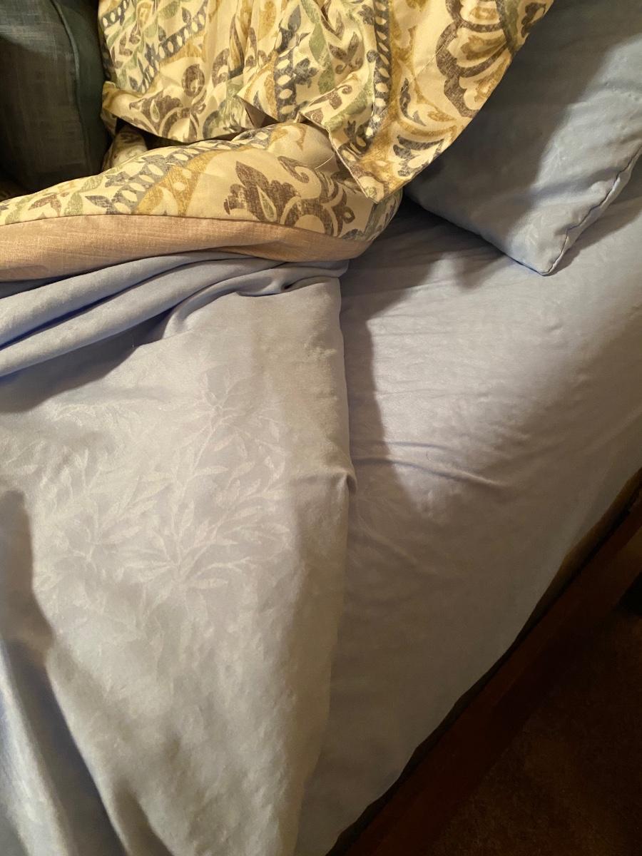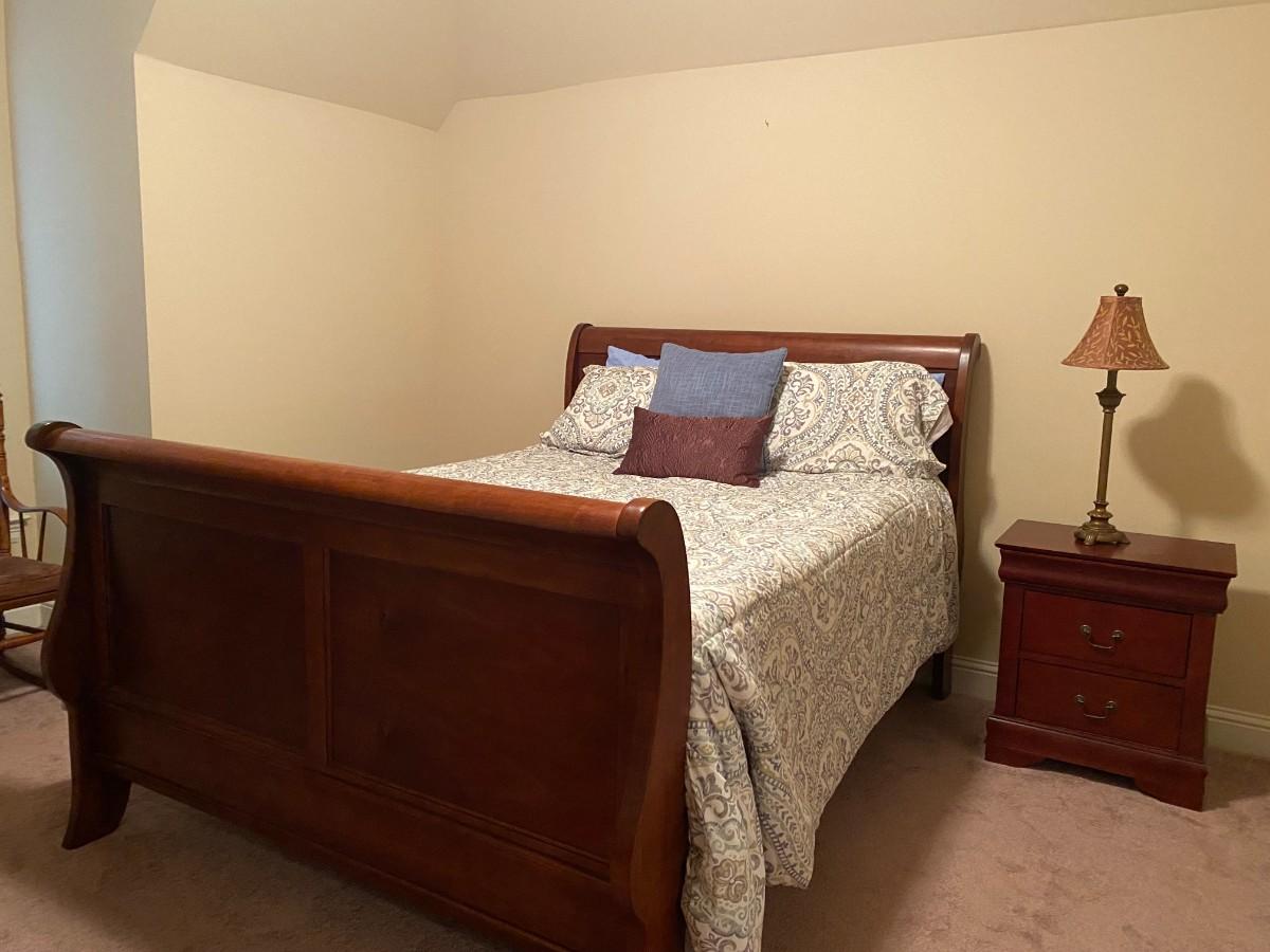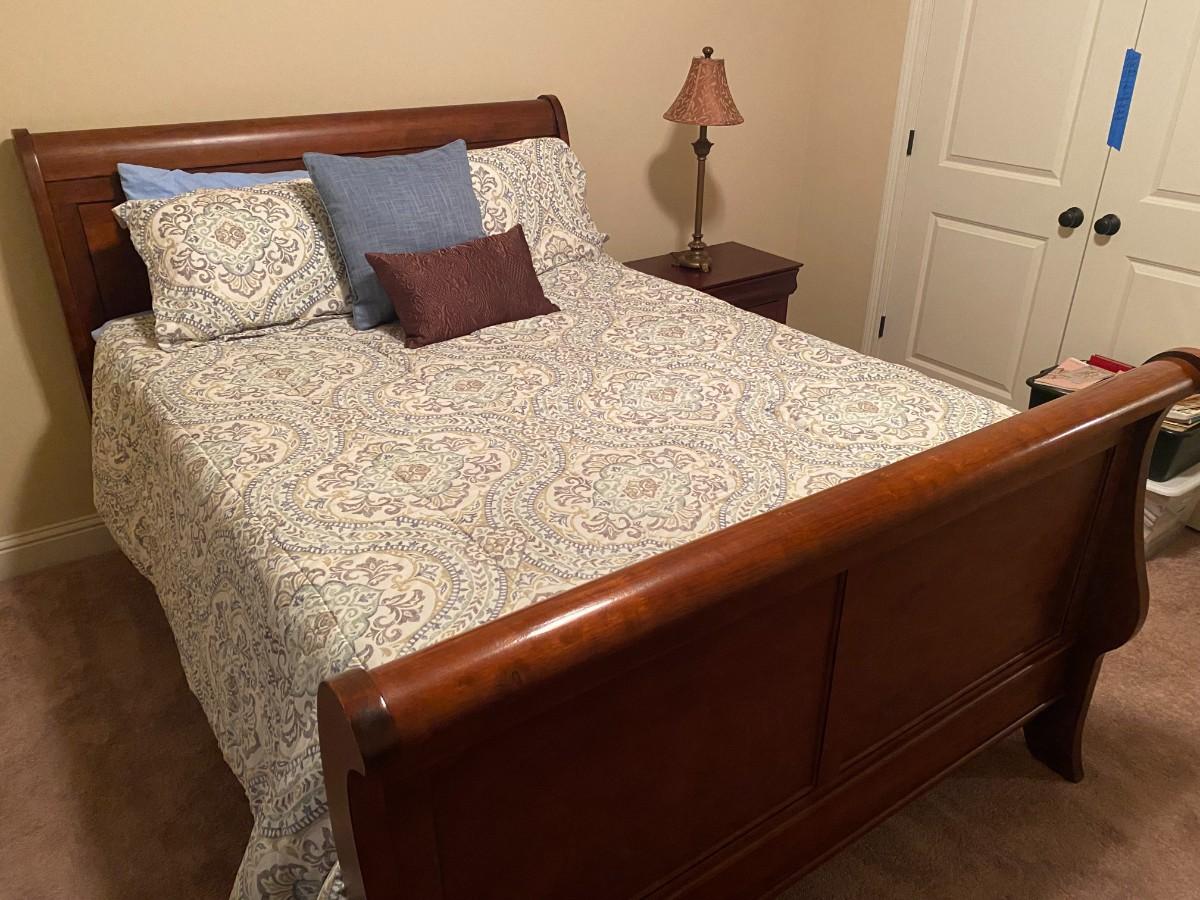 Queen size all wood sleigh bed. Excellent condition. Headboard is Approx 63-1/2w x 50h. Mattress is approx 32h, included