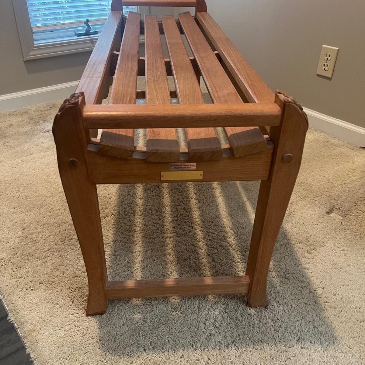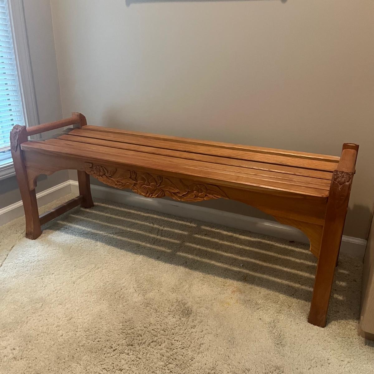 Lot includes a Kingsley-Bate teak wood bench that is decorated with carved wooden flowers. Bench measures 26” x 48” x 19”H.