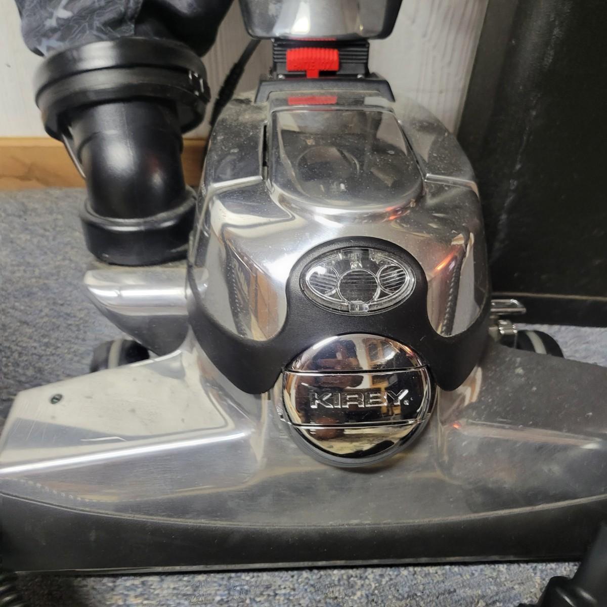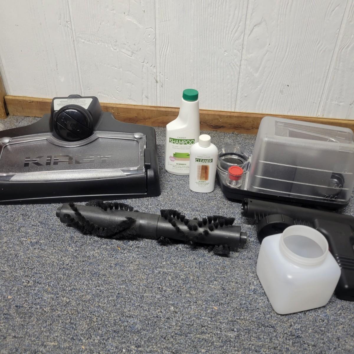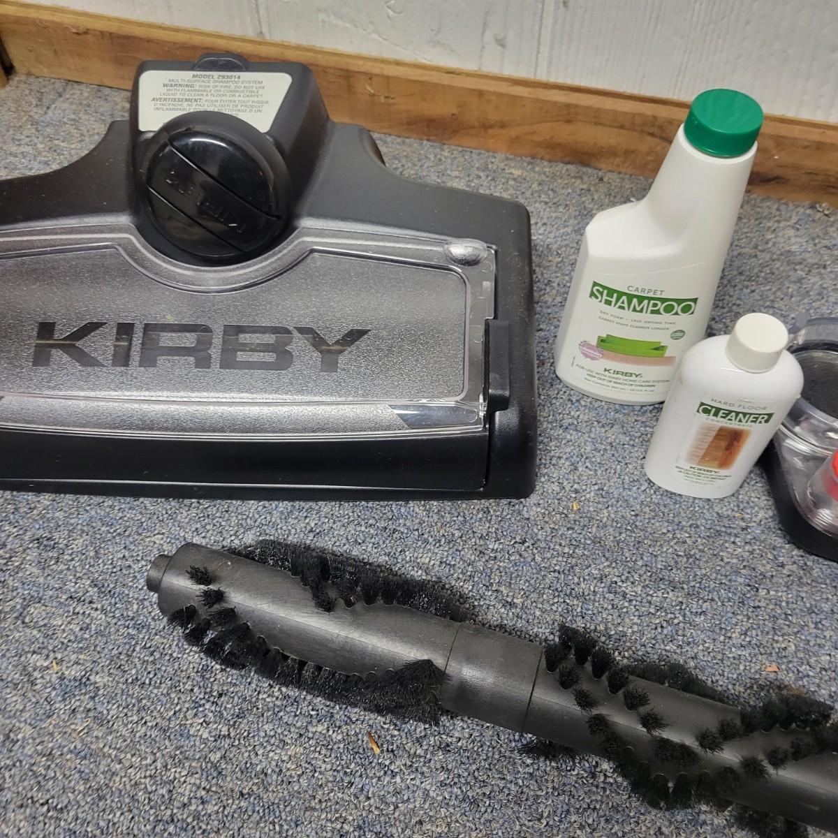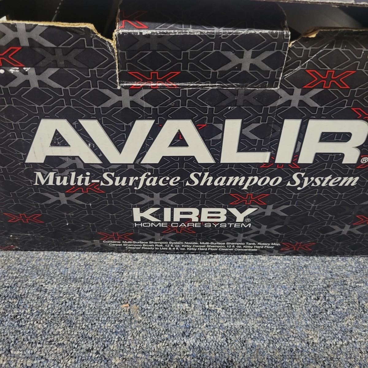 A Kirby Avalir vacuum that is in good condition. Vacuum was tested and works. Vacuum features a metal head unit and rear drive wheels. Also in this lot is a multi surface shampoo system built for this vacuum. Lot also includes multiple accessories and extra bags and belts. Vacuum measures approximately 15.5" x 15.5" x 34". Vacuum bag is full. Local pickup only