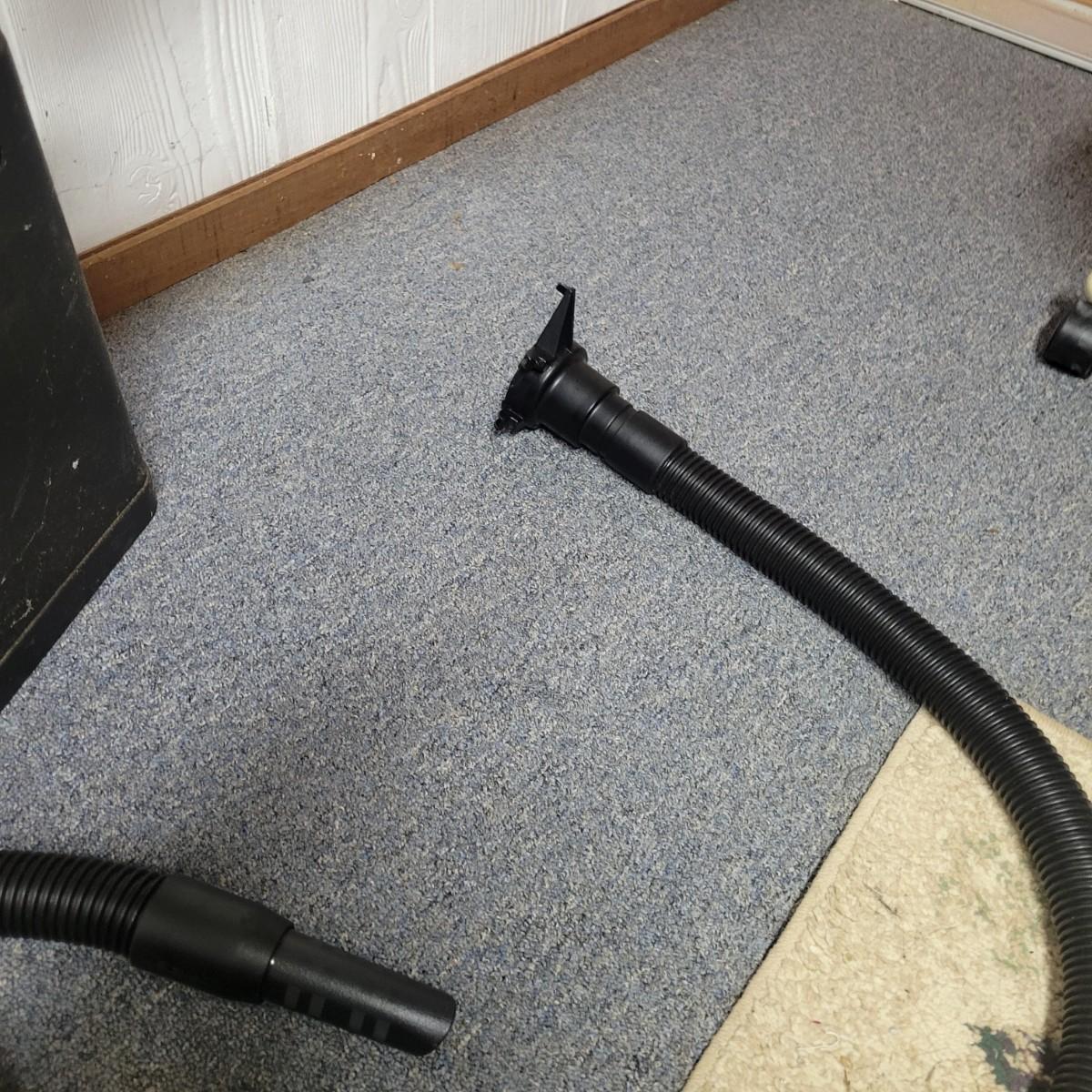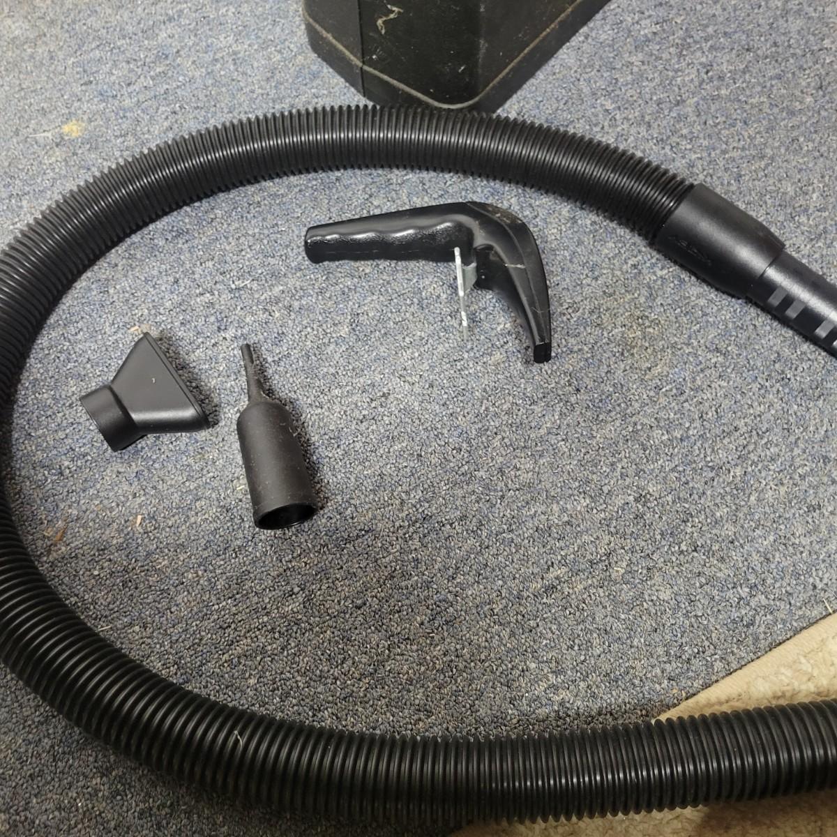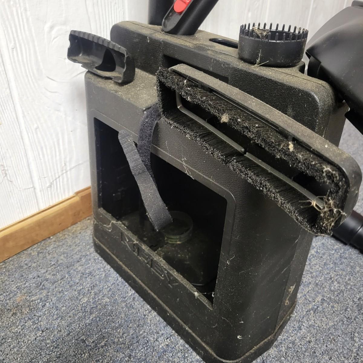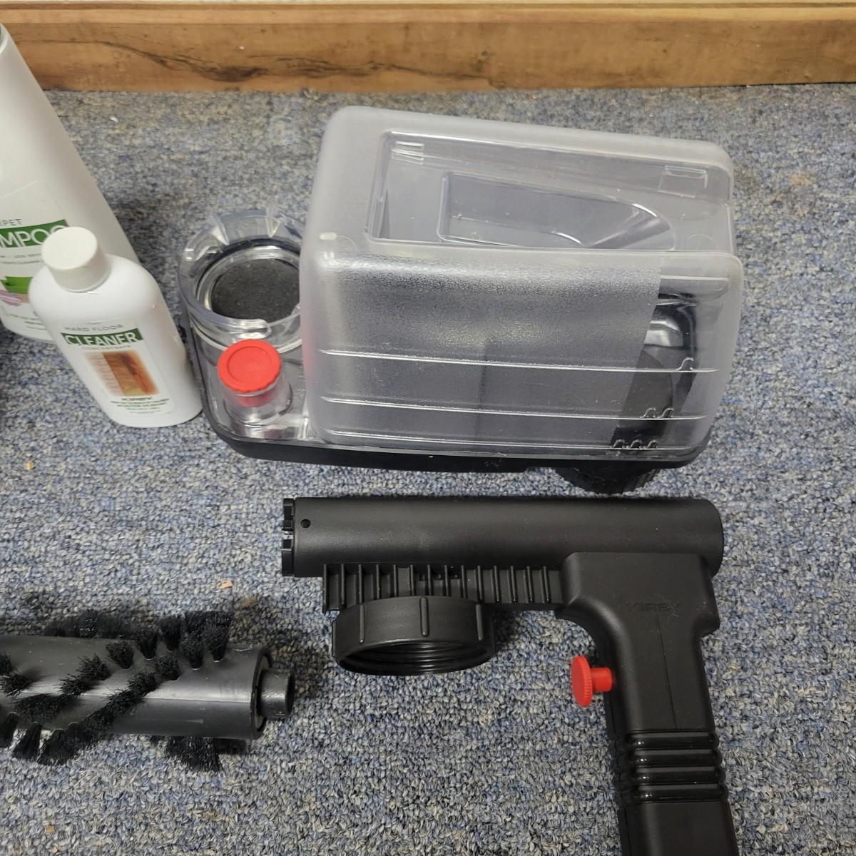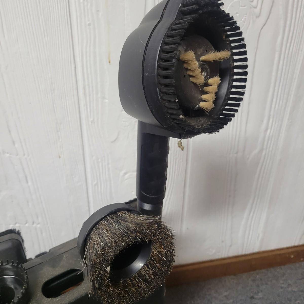A Kirby Avalir vacuum that is in good condition. Vacuum was tested and works. Vacuum features a metal head unit and rear drive wheels. Also in this lot is a multi surface shampoo system built for this vacuum. Lot also includes multiple accessories and extra bags and belts. Vacuum measures approximately 15.5" x 15.5" x 34". Vacuum bag is full. Local pickup only
