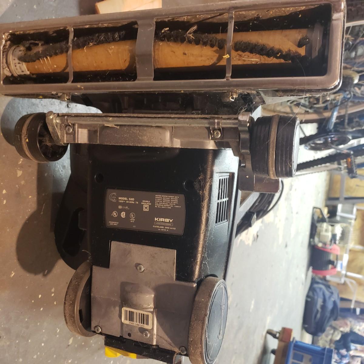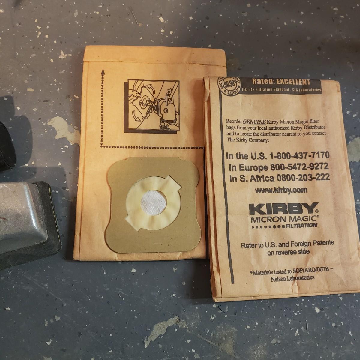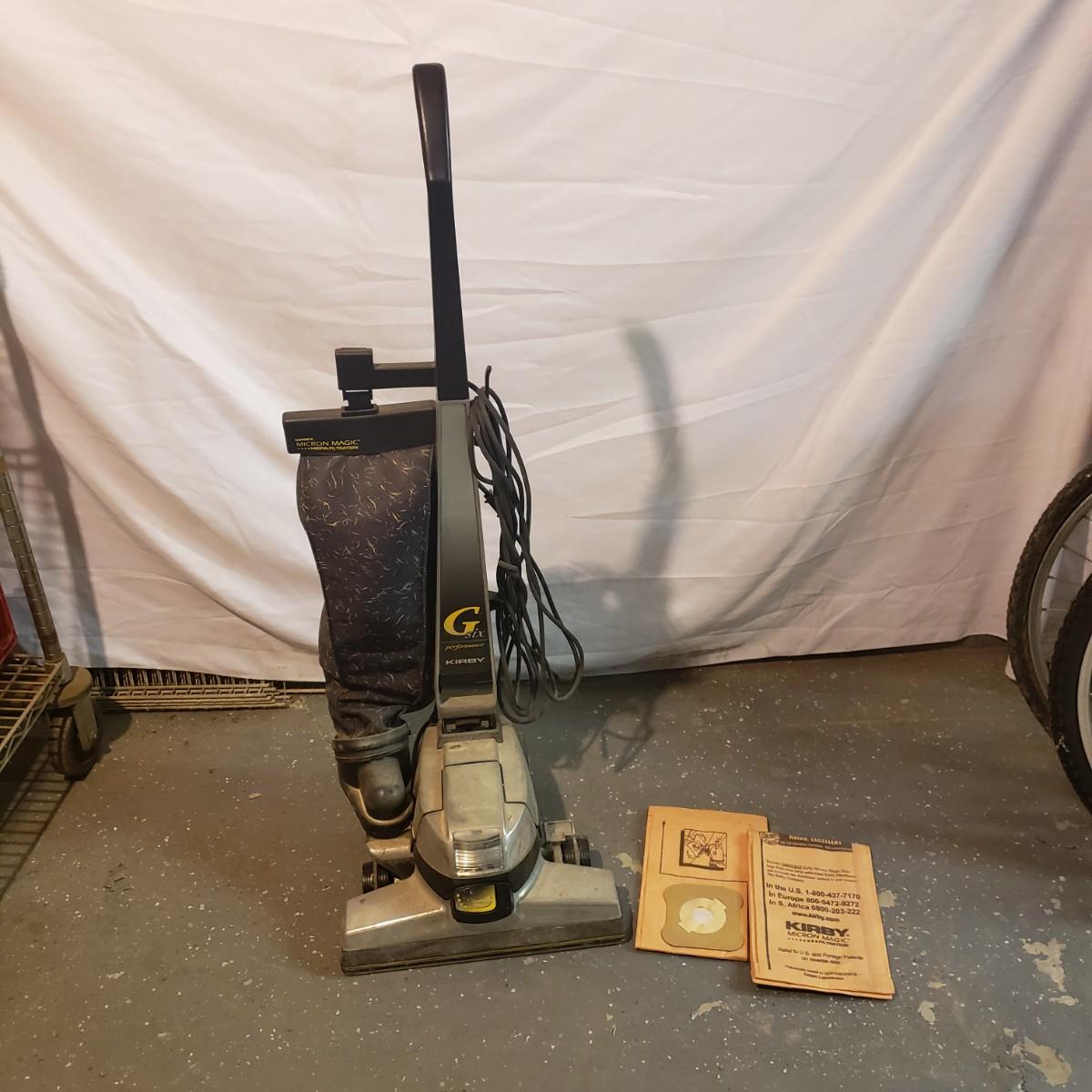 This is a Kirby G-6 performance vacuum with two bags. The vacuum powered on when plugged in and has suction. In the upright position it measures 15" x 15" x 43"H.