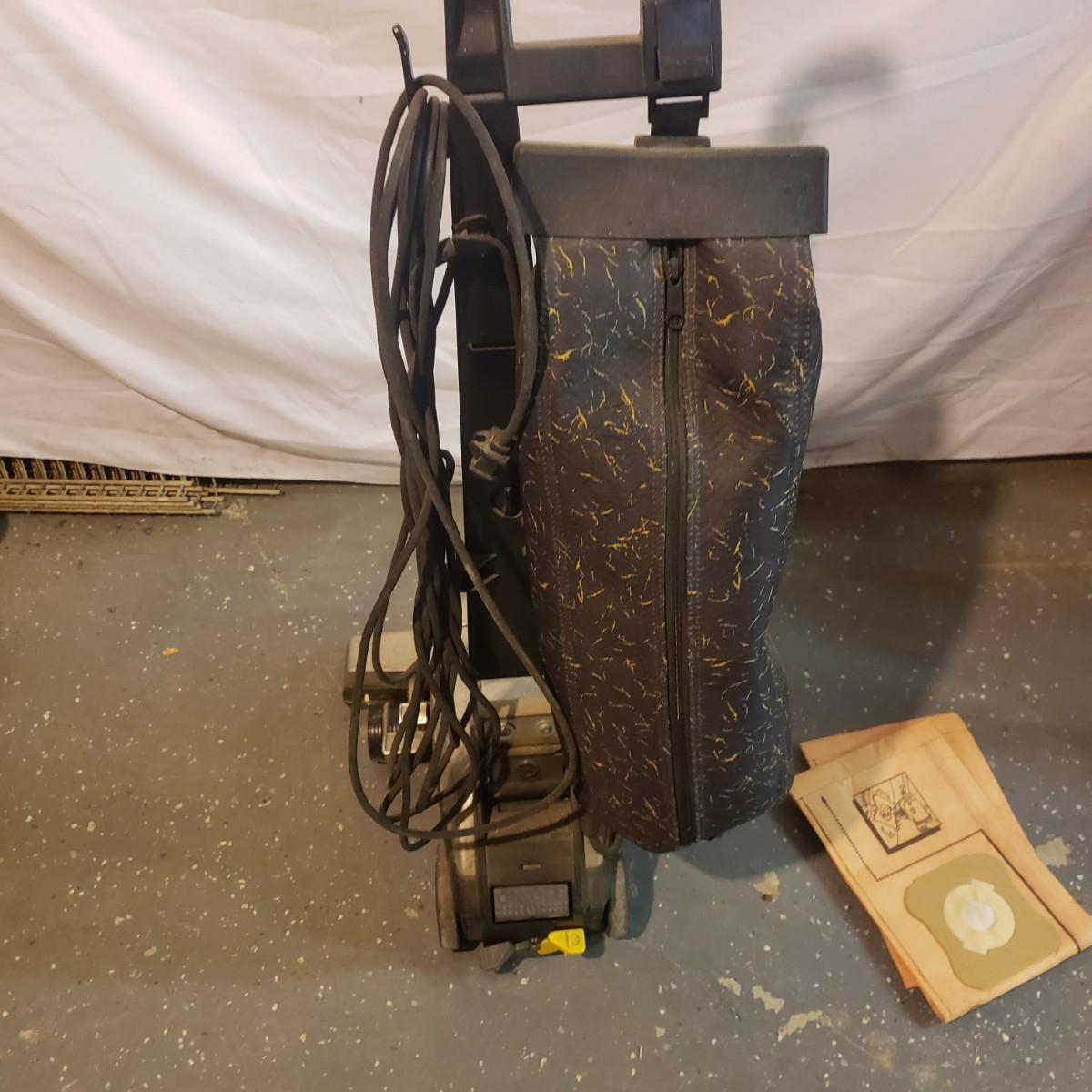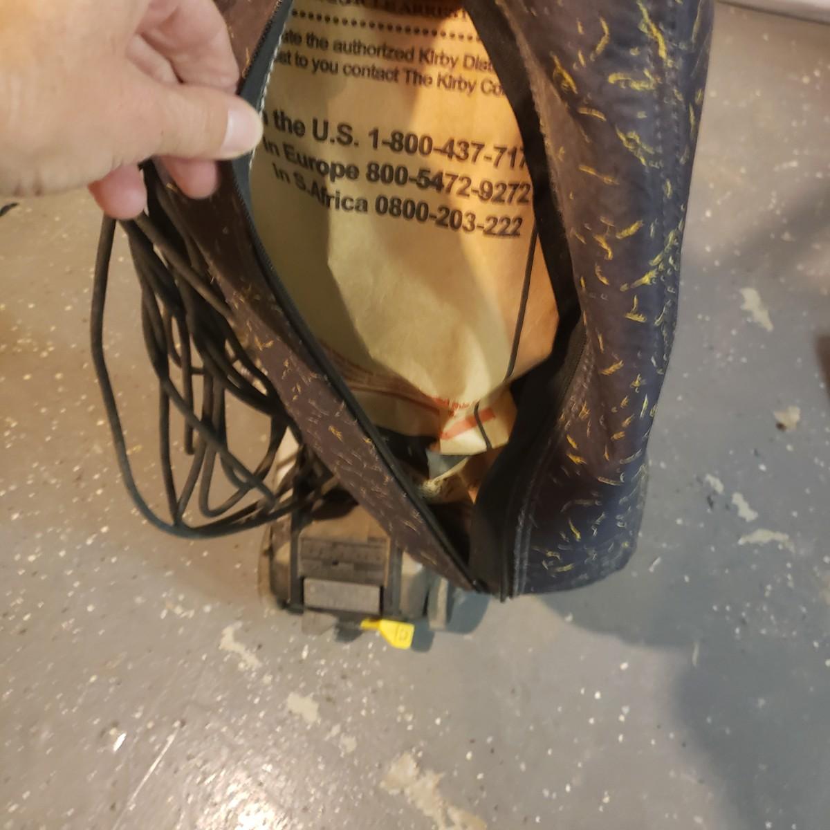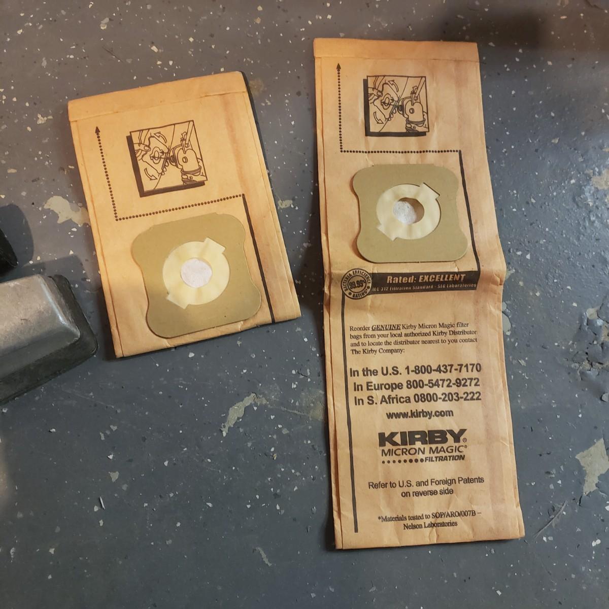 This is a Kirby G-6 performance vacuum with two bags. The vacuum powered on when plugged in and has suction. In the upright position it measures 15" x 15" x 43"H.