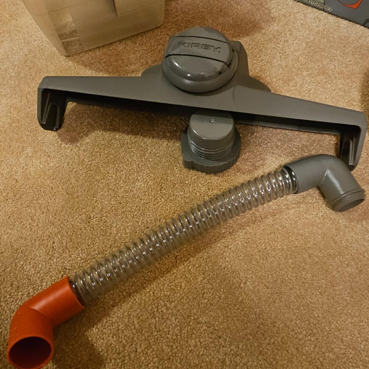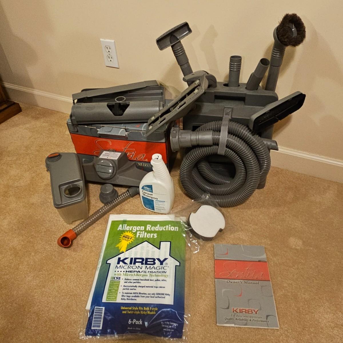 Kirby Sentra upright vacuum with attachments, hoses, extension handles and more. Unit measures 15" x 17" x 43"H and powered on when plugged in. Also comes with carpet shampoo system with head, hoses and more. Extra belts, bags and instruction manual included. See photos for details. Local pickup only.