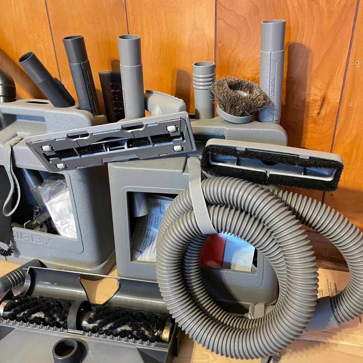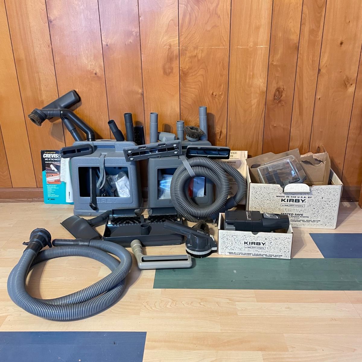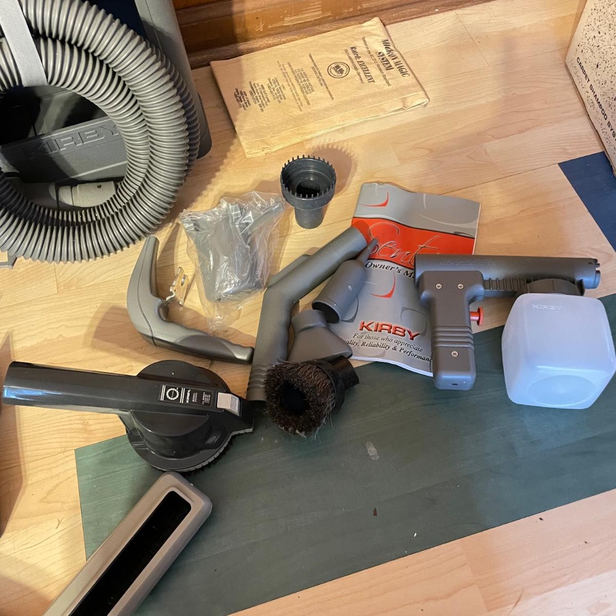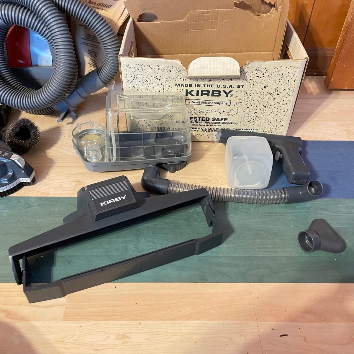 Nice lot of Kirby vacuum attachments. Lot features shampoo system attachments, the reservoir appears to have some minor scuffs on the outside, but not used or very well cleaned on the inside. Lot includes multiple brushes, most appear only slightly used or not used at all. Two hoses, a variety of over 20 attachments including the “Over & Up” and the ceiling fan blade cleaner, one Sentria owner’s manual, one unpackaged Micron Magic System vac bag and an opened crevis vac attachment from Ideaworks. See images. Local pick up only.