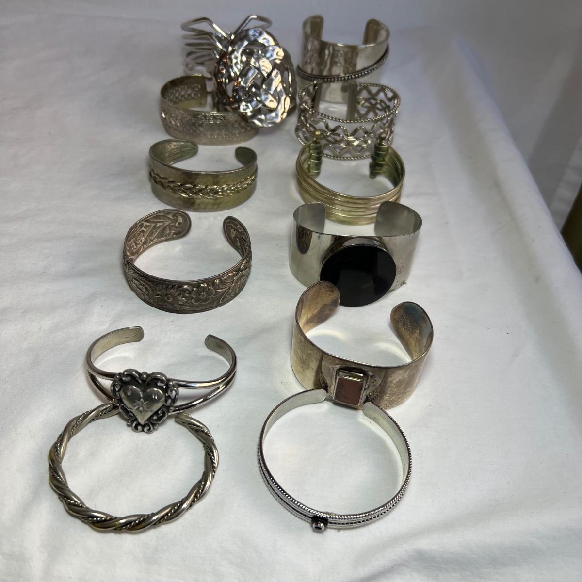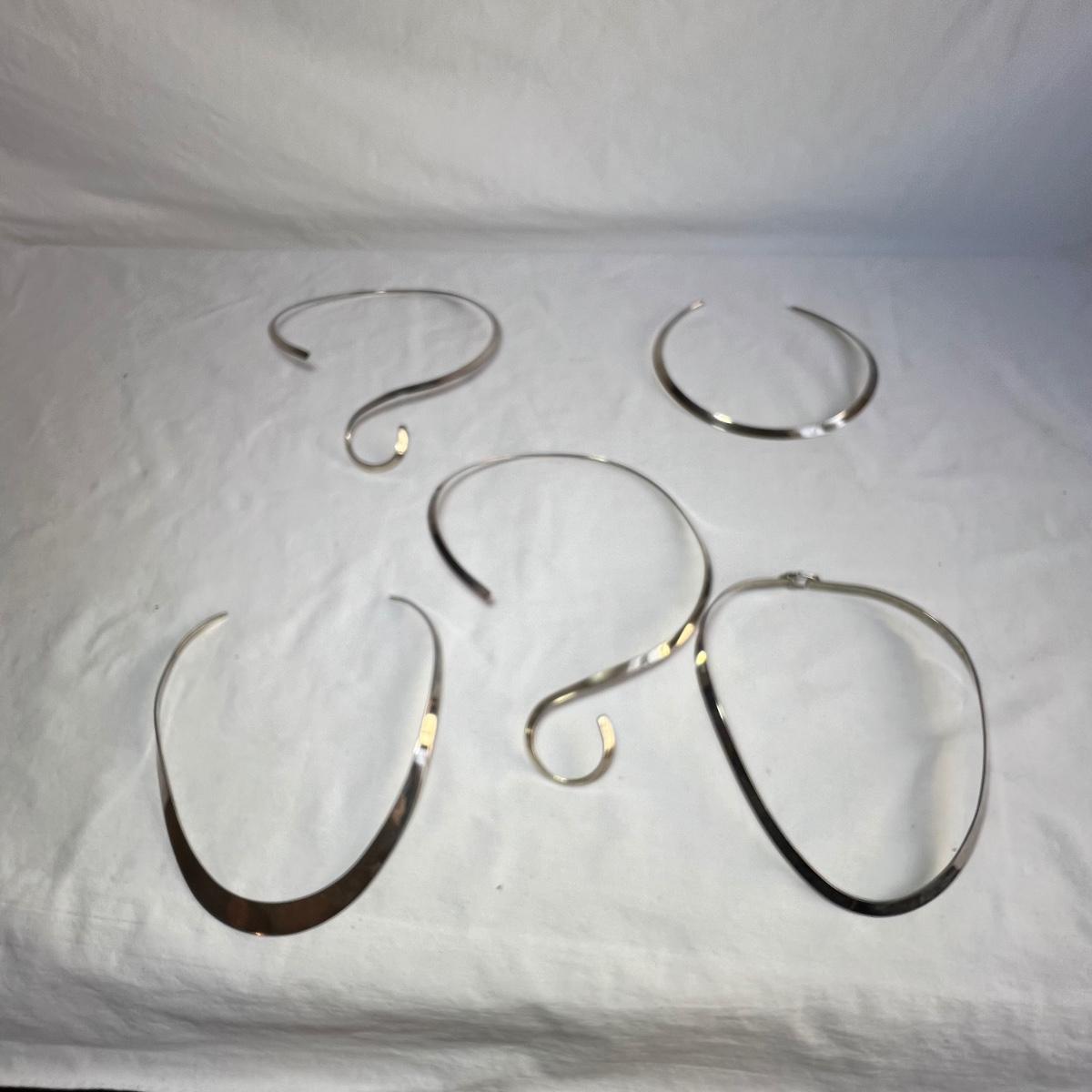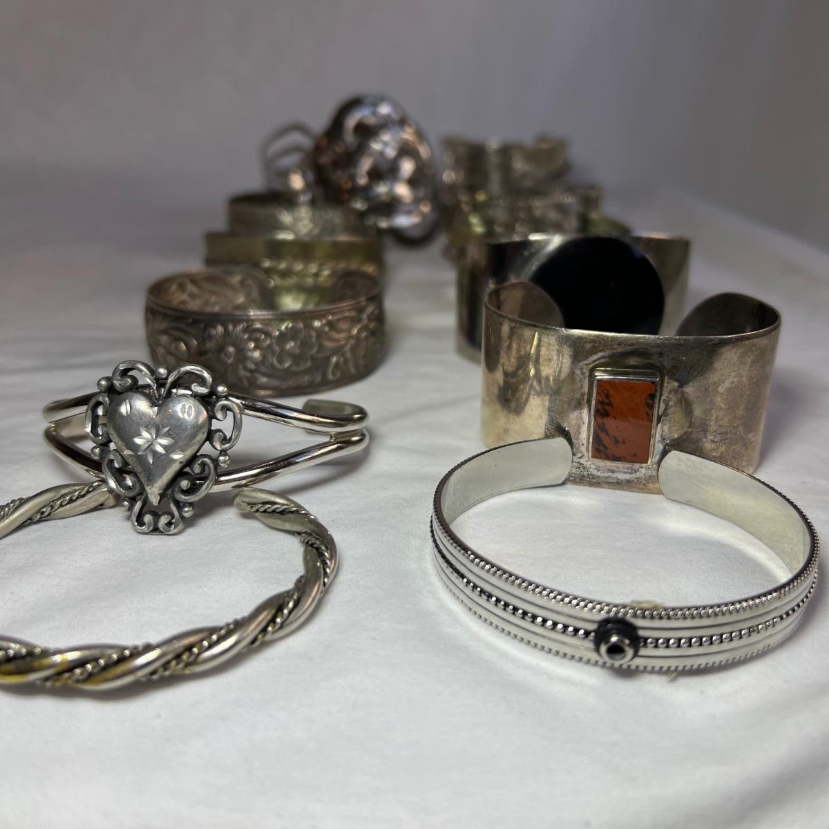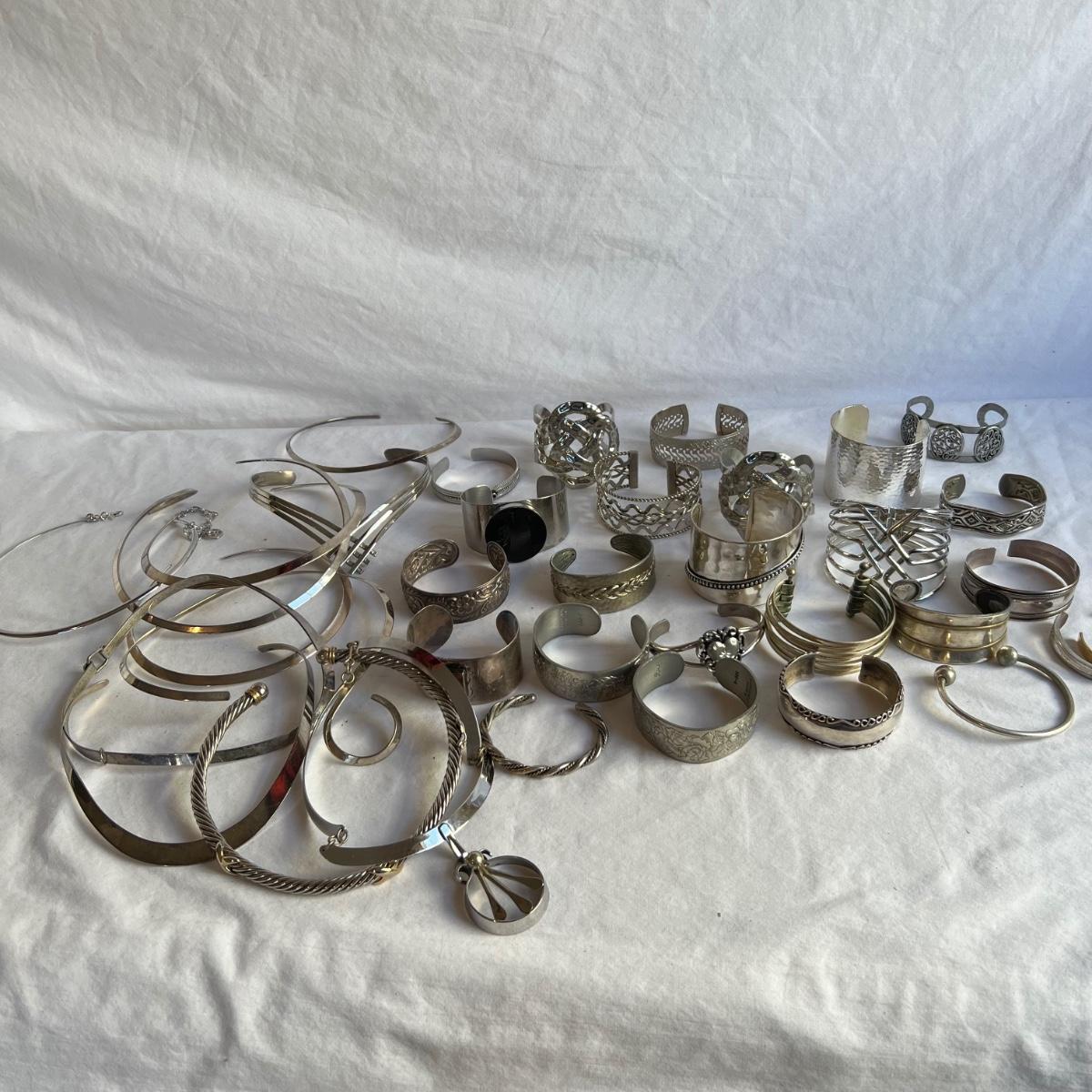 Approximately twenty cuff bracelets includes two Kirk Stiefel pewter, the rest are a silver colored metal. Also included are approximately ten choker/collar style silver colored metal necklaces. All sales are final, no refunds so please bid accordingly.