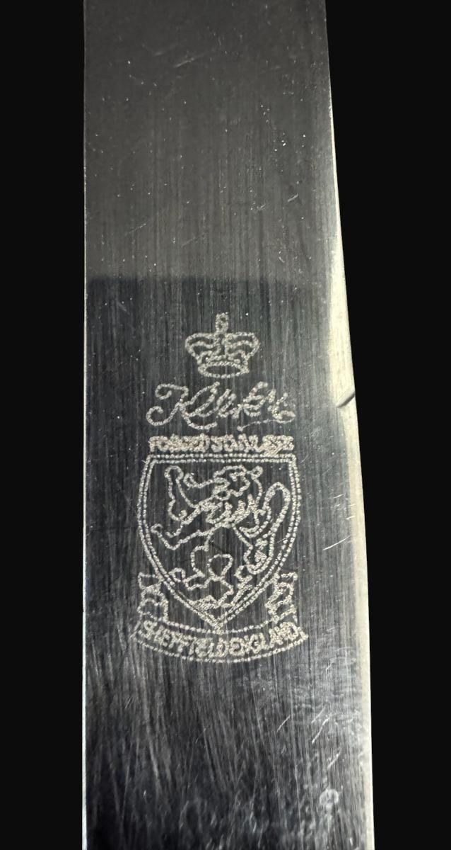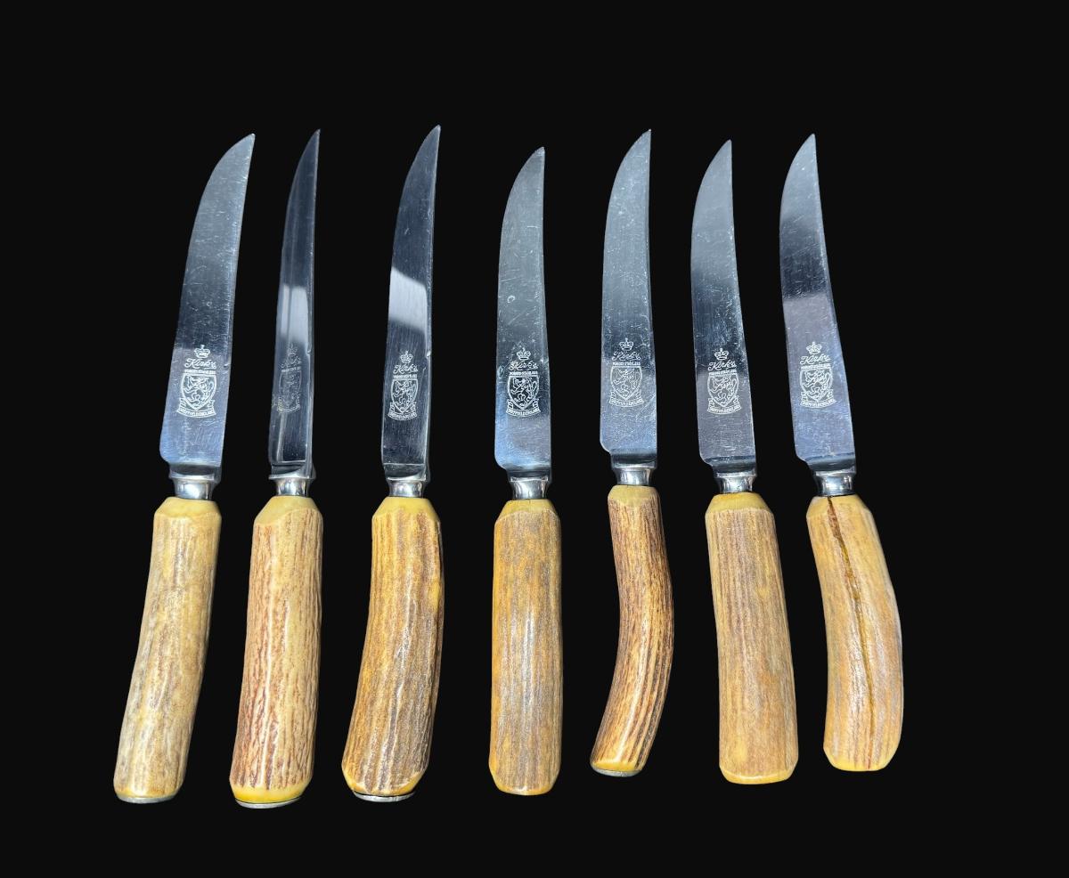 Steak knives with horn handles. Made in Sheffield, England. Total of seven pieces. Measurement: 8.5”L (each). [CS]