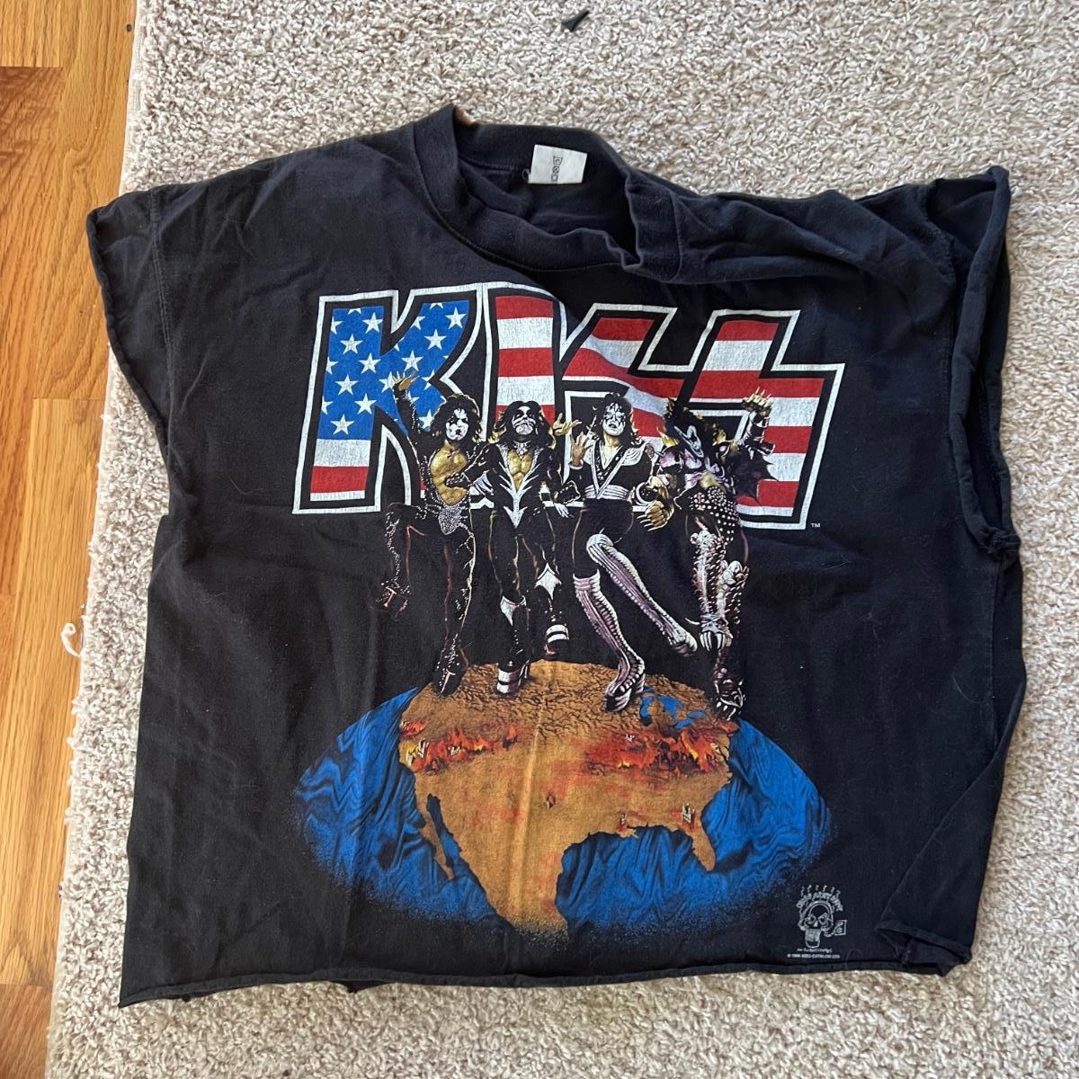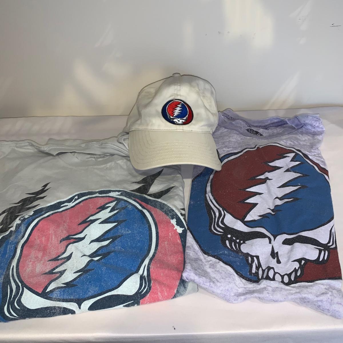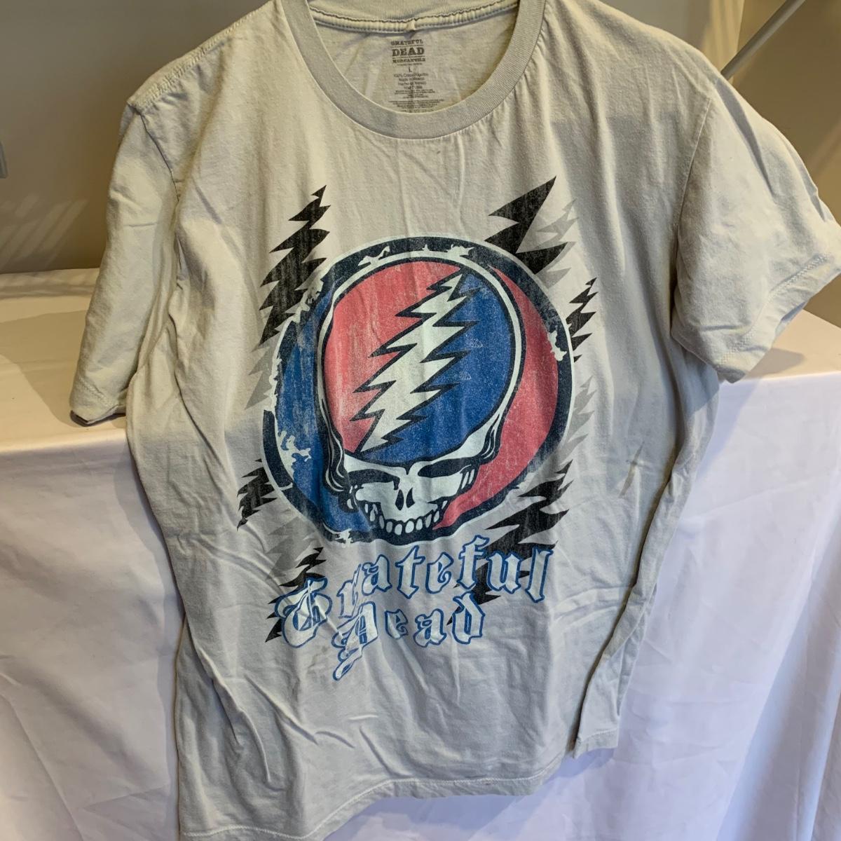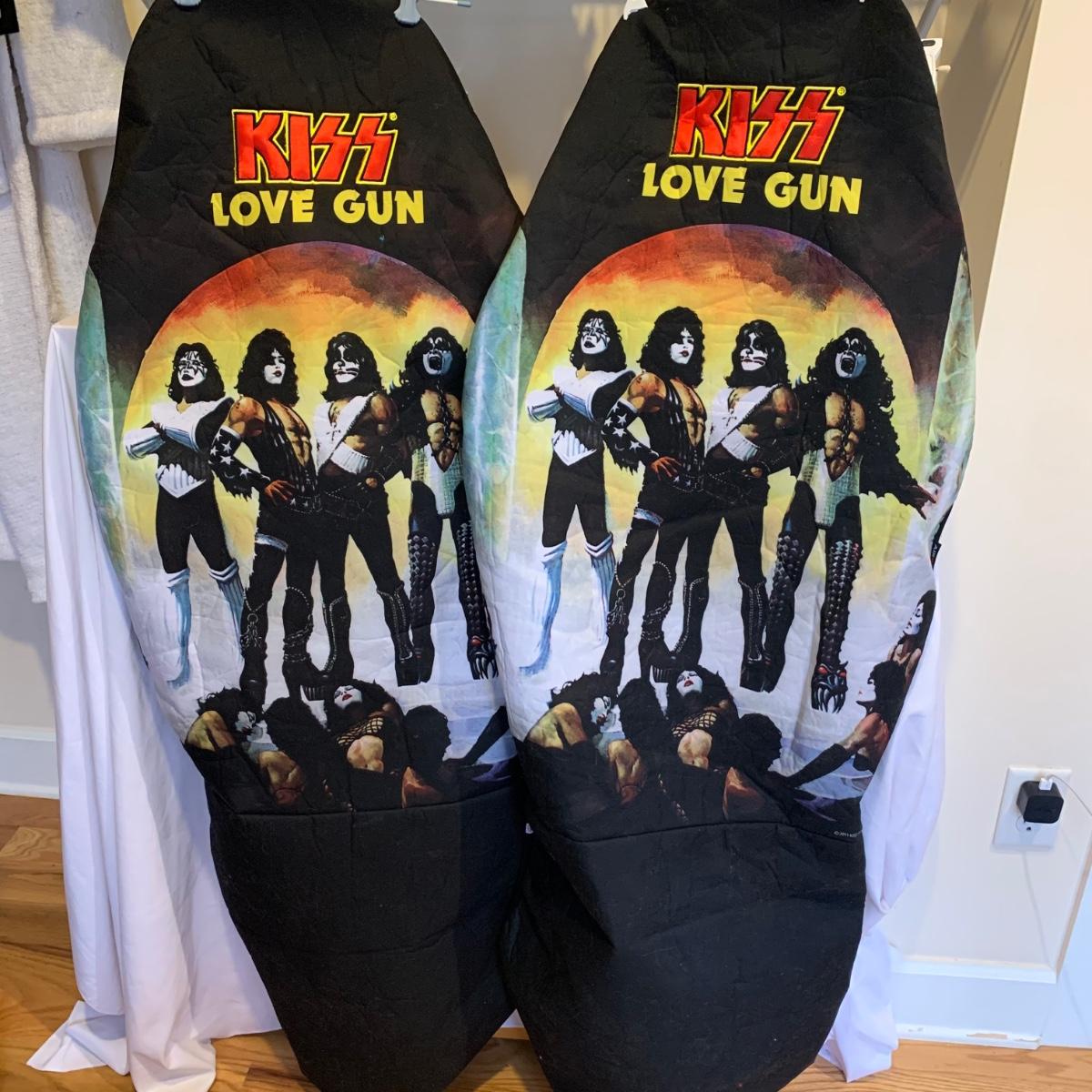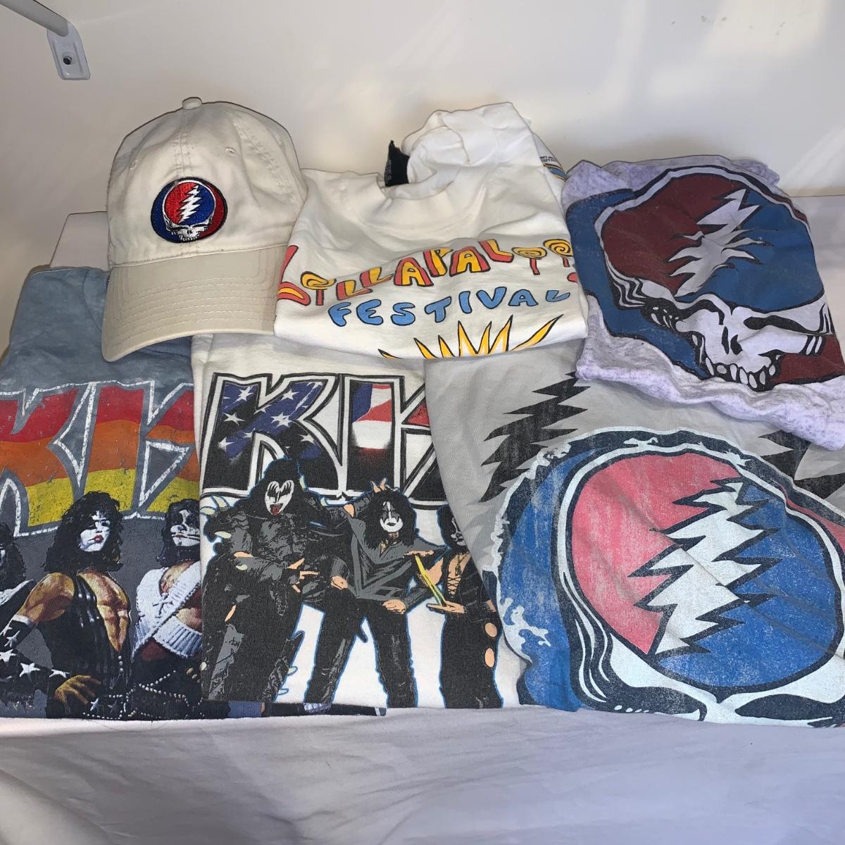 The lot includes a couple Grateful Dead, Kiss tour t-shirts, and more. Also included are two Kiss decorative seat covers. The shirt sizes range from Medium to XL. Shipping available.