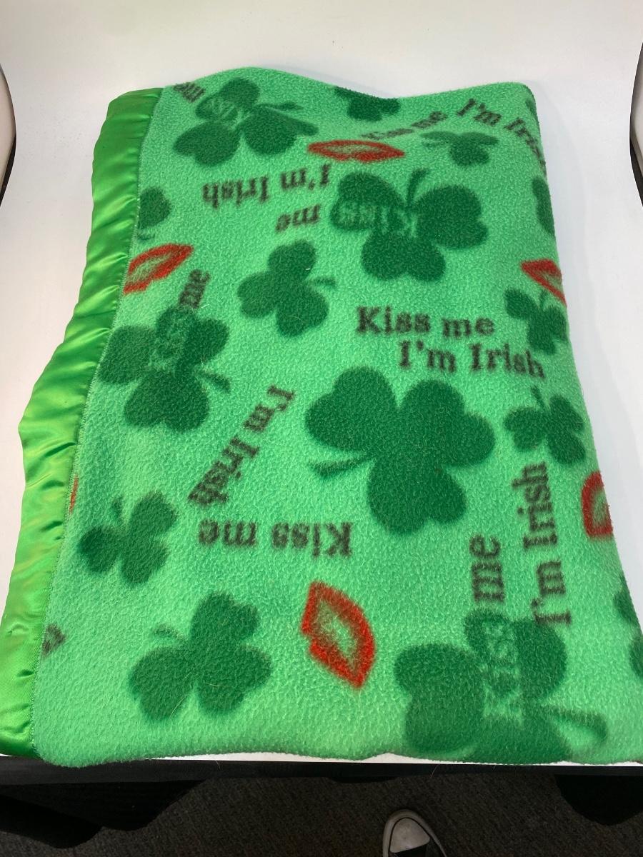 Kiss Me I'm Irish Green Fleece Throw Blanket. Light wear from washing. Almost the size of a twin blanket.