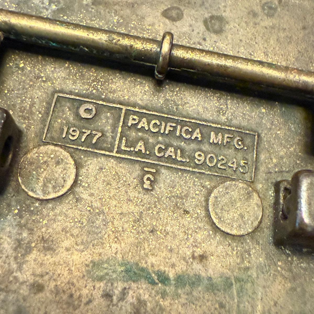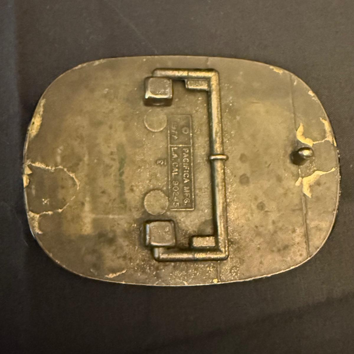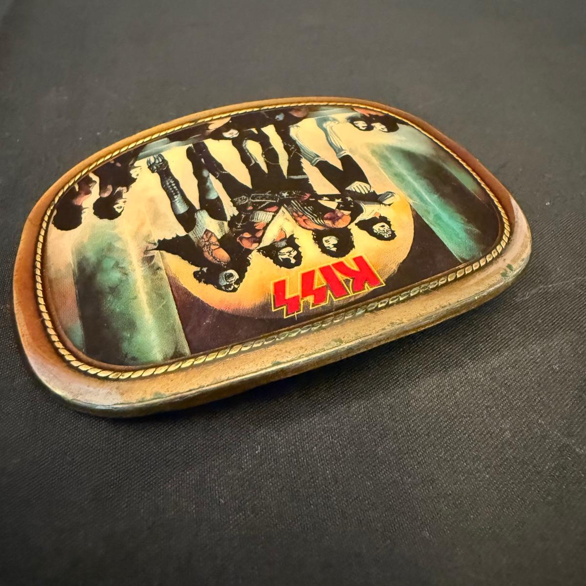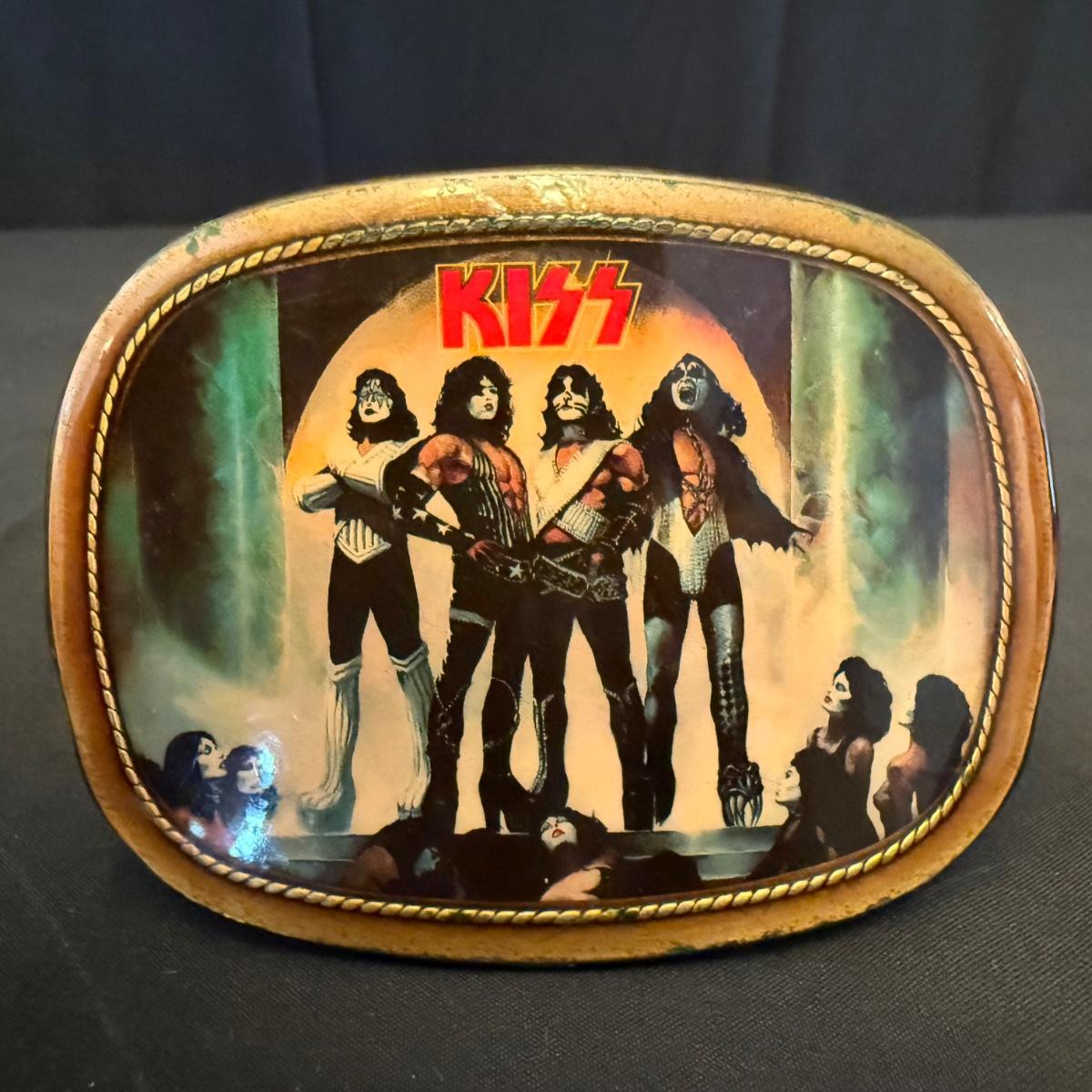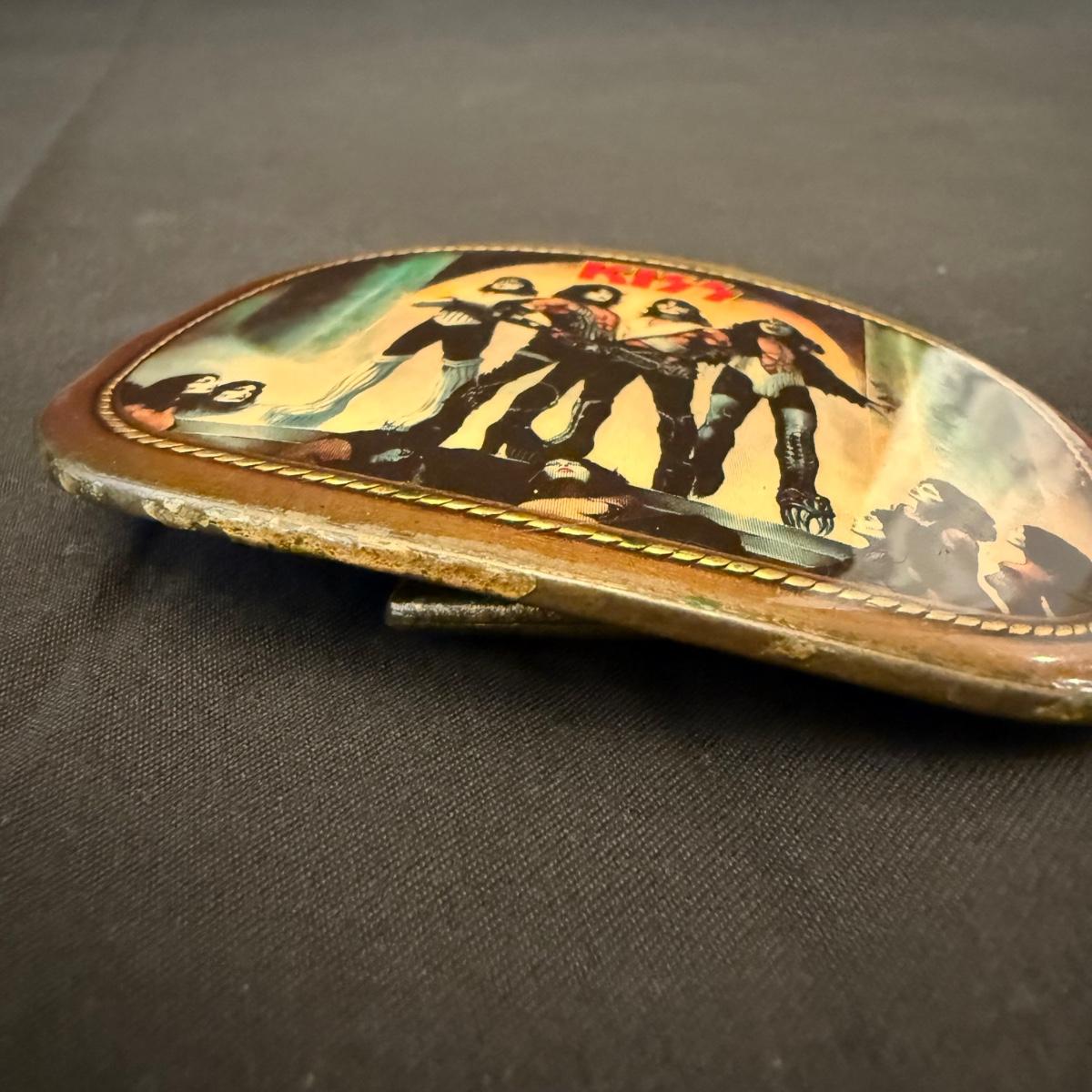 Vintage Pacifica brand KISS belt buckle featuring the image from their album “Love Gun”. Item is metal and measures 3.25” x 2.5”. There’s some wear on the edges.