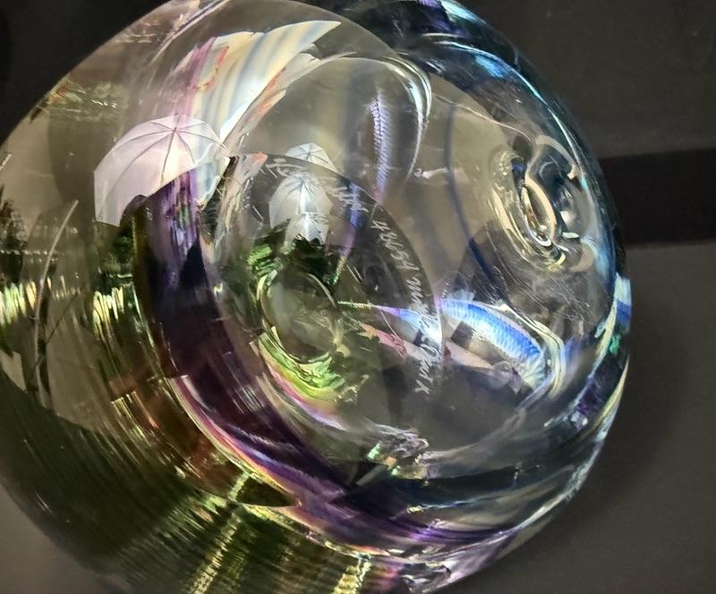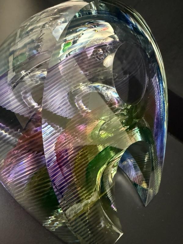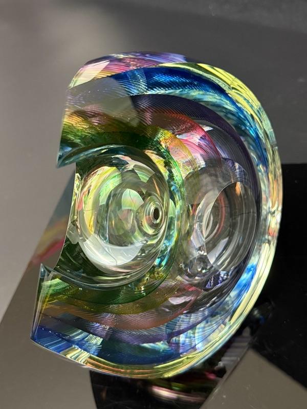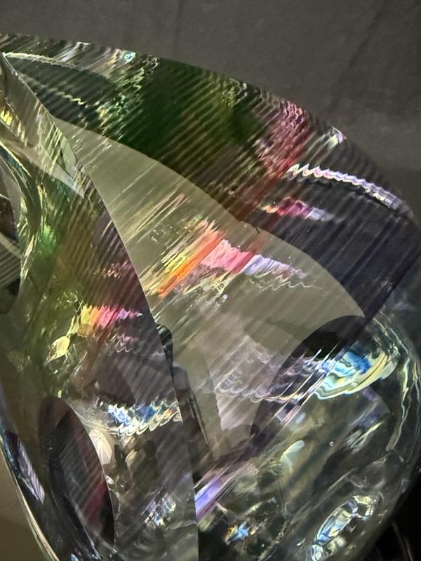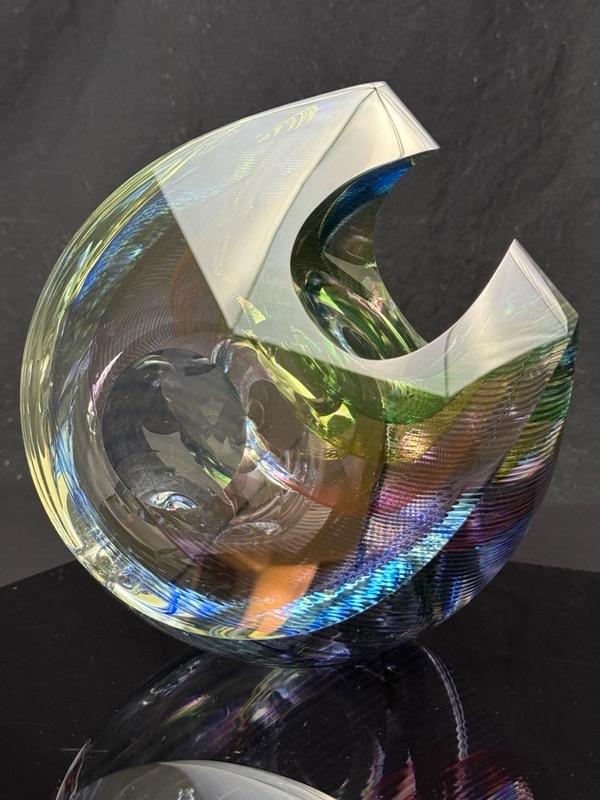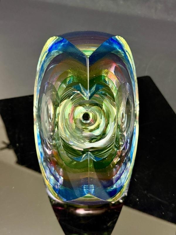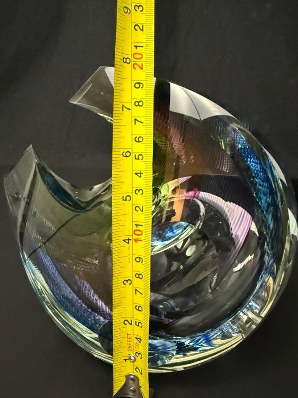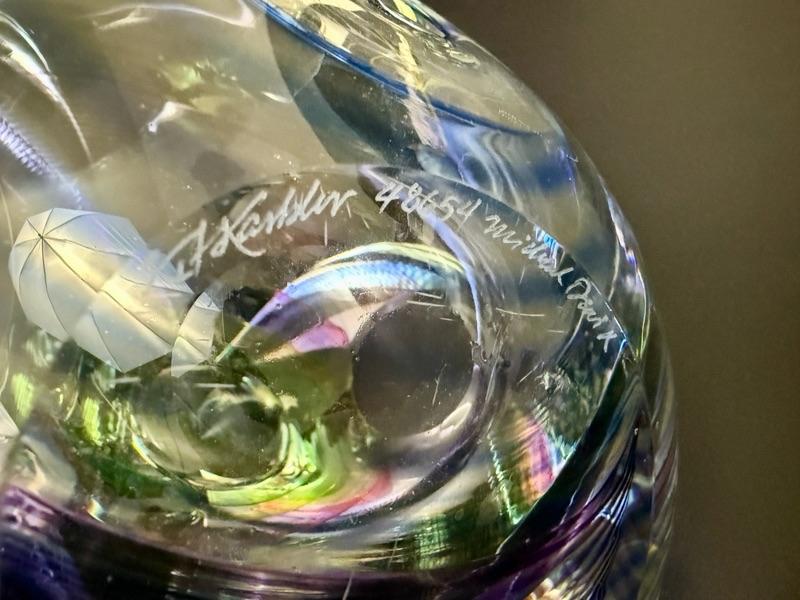 Michael David, Kit Karbler & Miguel Guzman have maintained a glassblowing studio in Colorado since 1980 (per the paperwork from the estate with this item - most likely purchased in the early 80's). They are known for work exhibited Internationally - for simplicity of design combined with rich color.