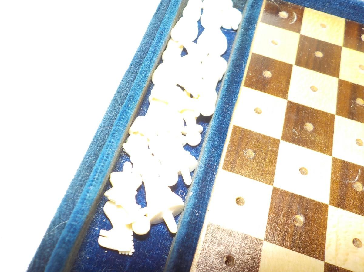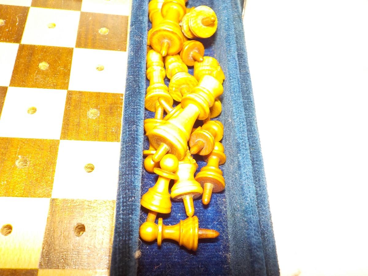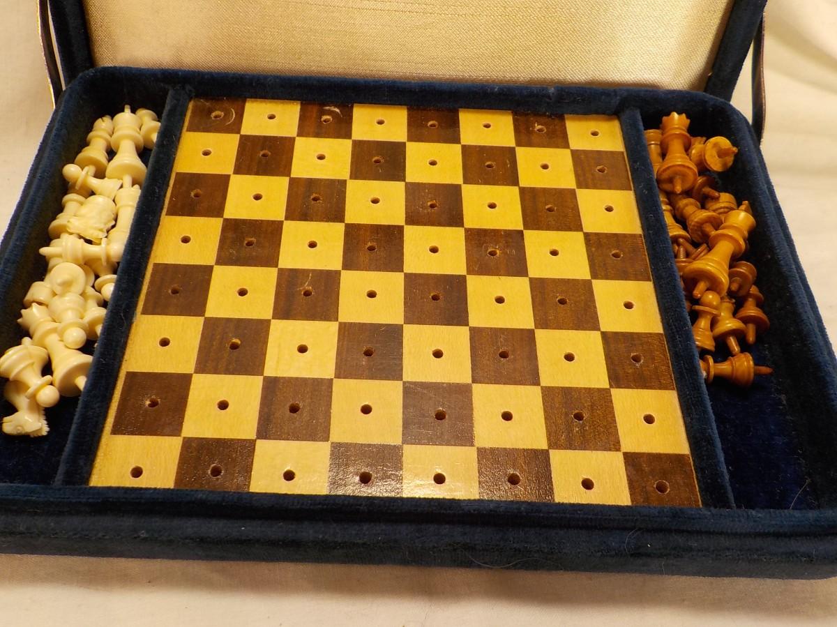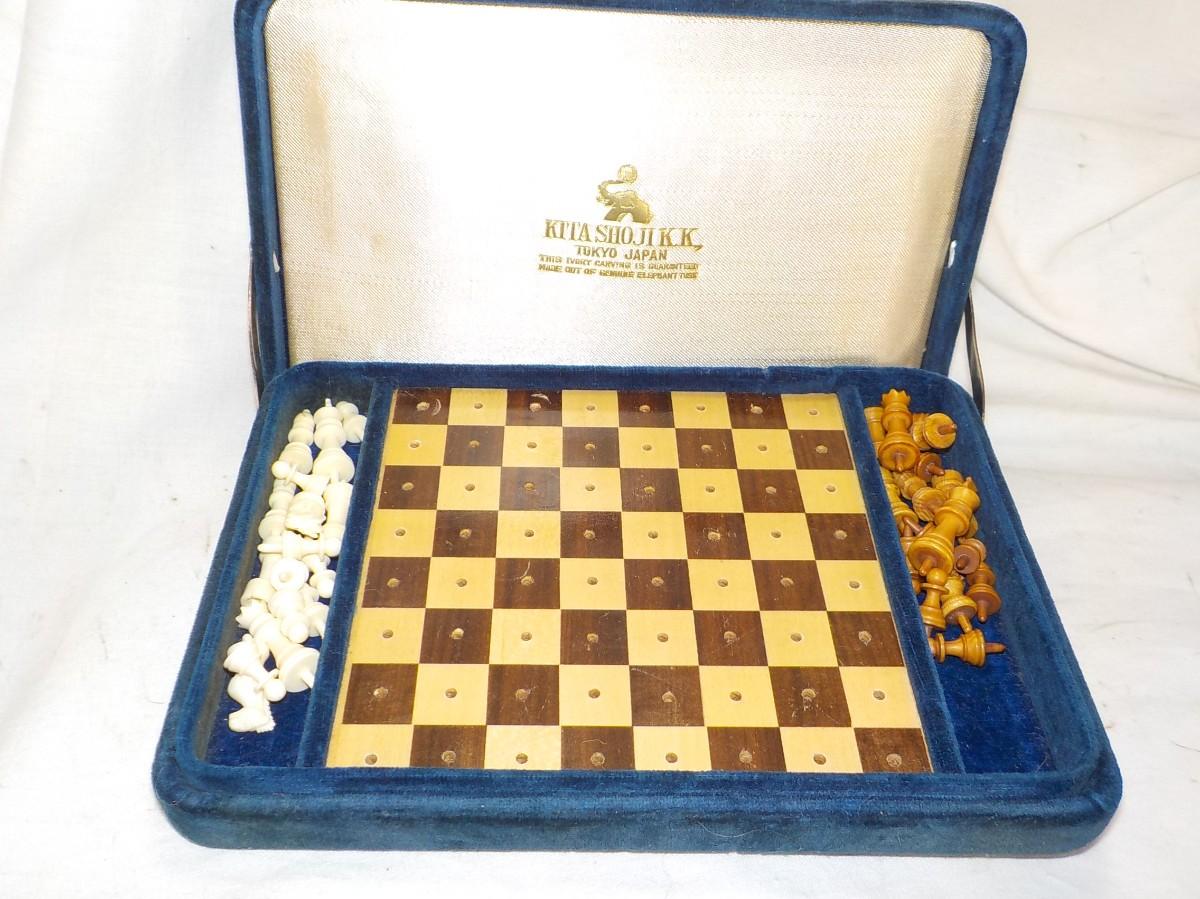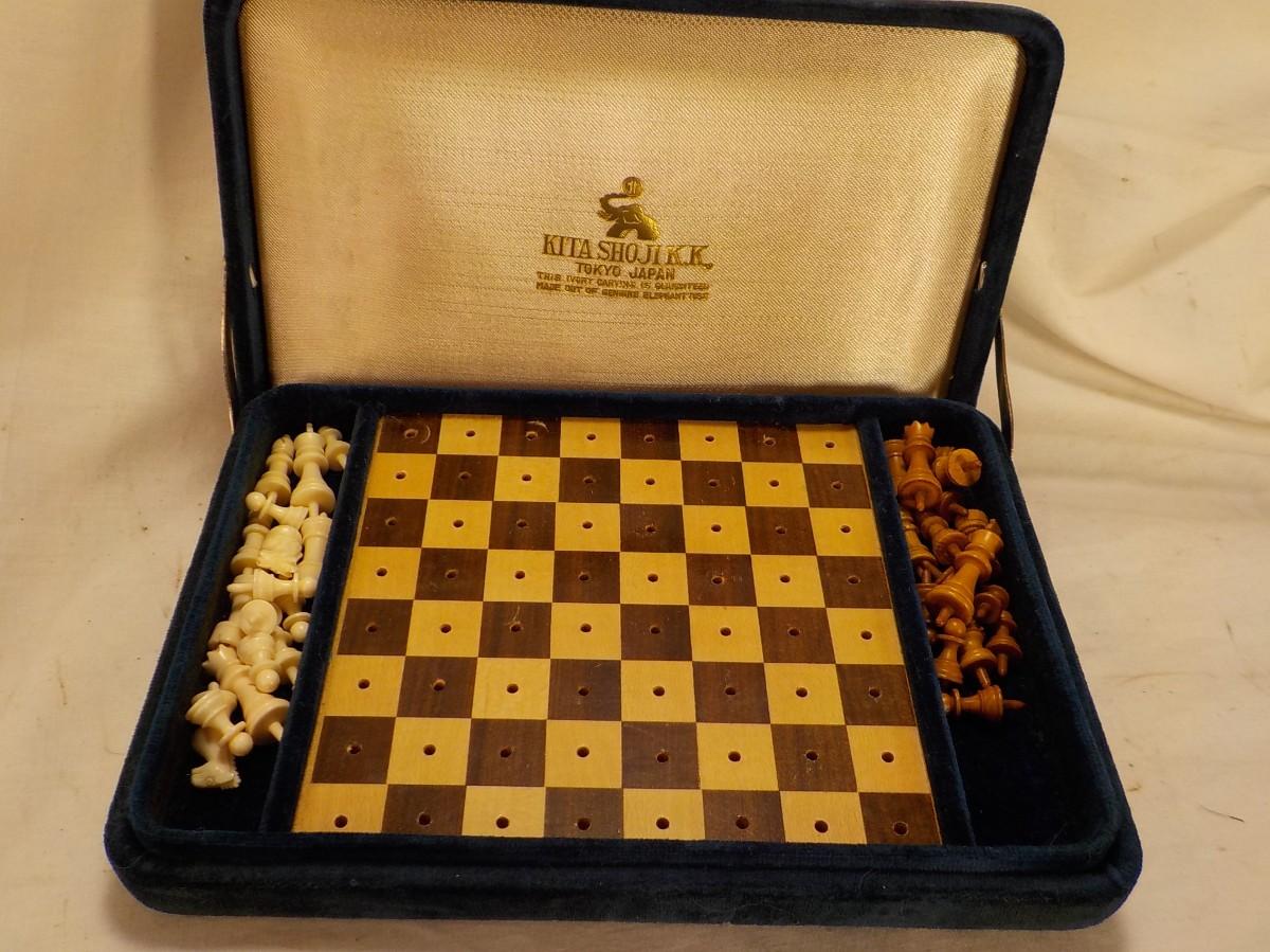 Portable Chess Antique board and pieces. Chest pieces are made of out Ivory in 1932, in Japan before the embargo of Ivory. This is a rare piece and is all accounted for , was in a closet for 40 years.