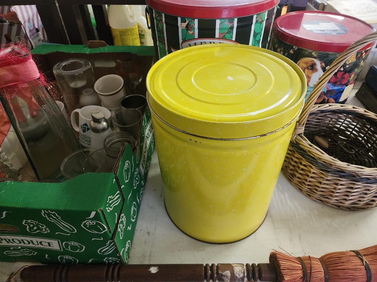Lot of metal tins, basket, brush, box of glasses/mugs/vases