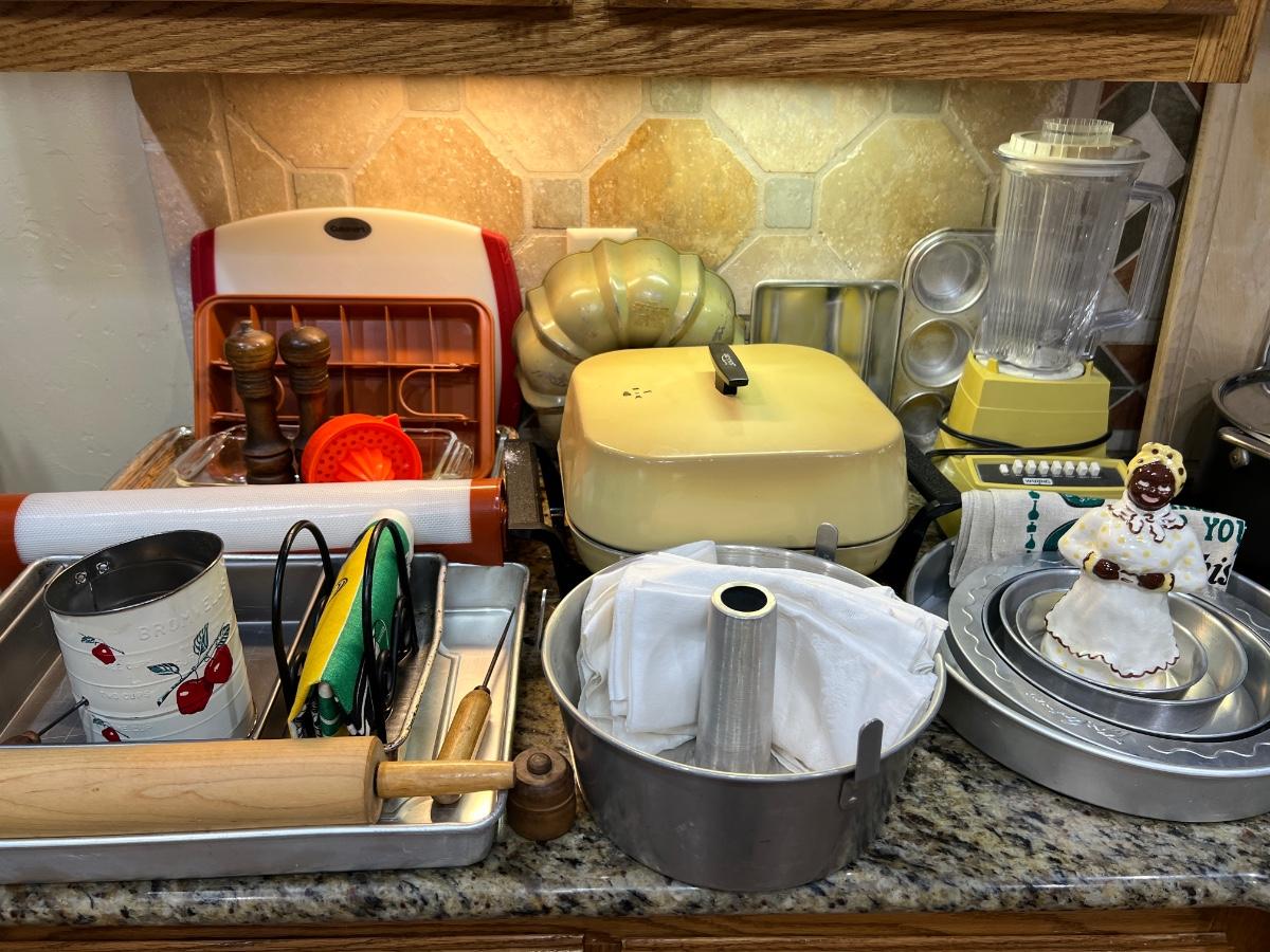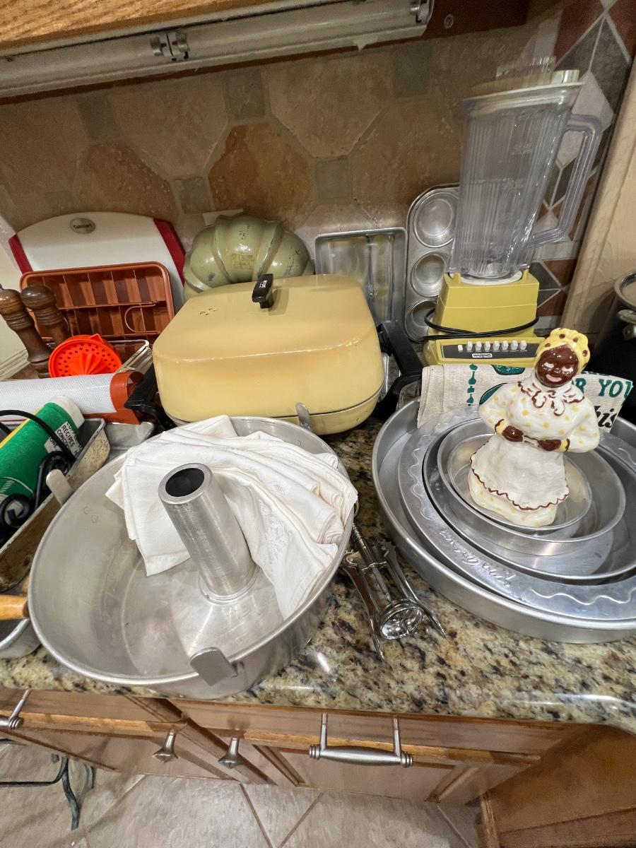 This lot stretches across two photos and includes the vintage items as well as the modern cake pans