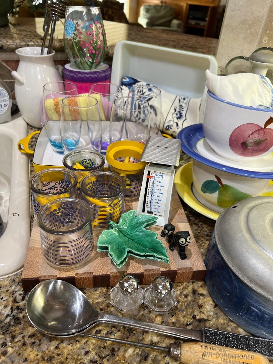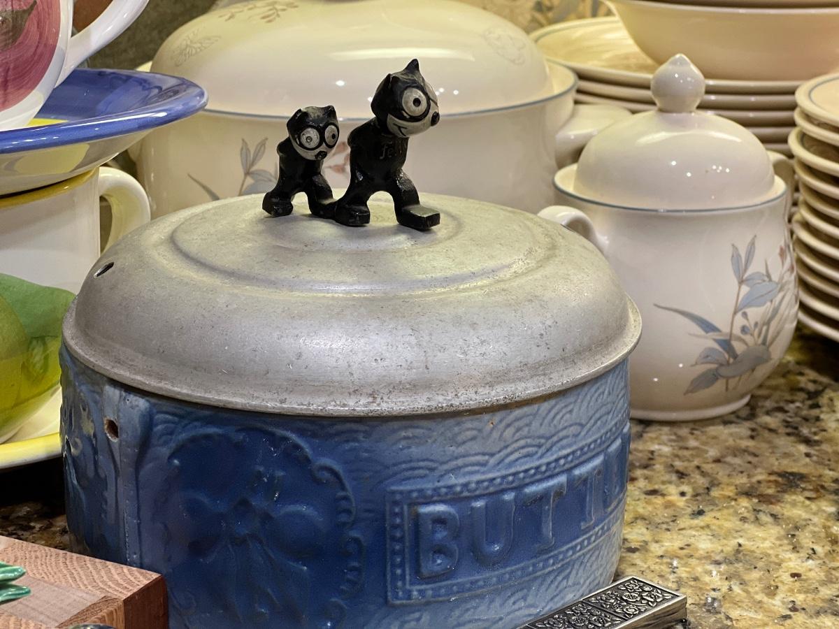 Blue butter crock, Felix the cat, and other vintage kitchen as pictured. does not include and of the Keltcraft noritake dishes.