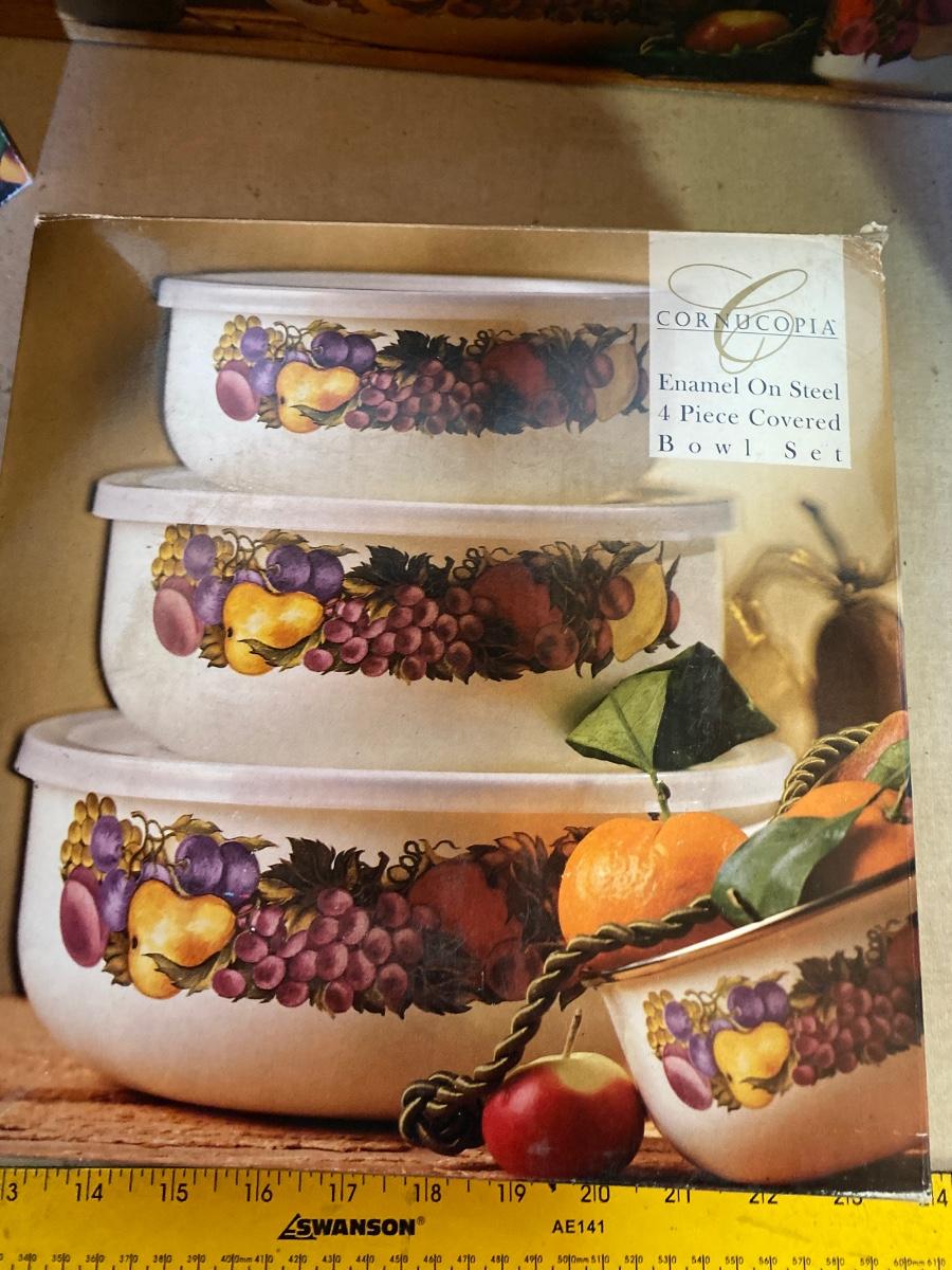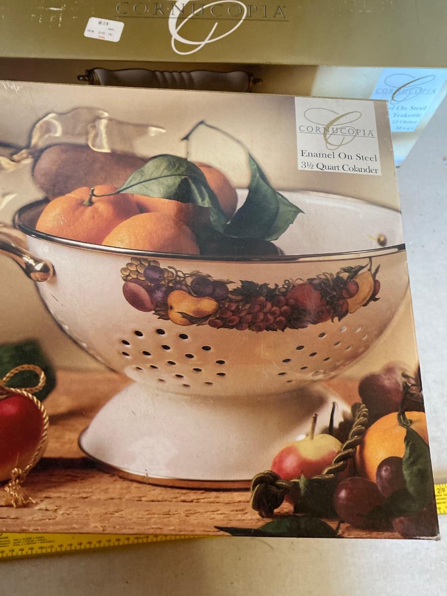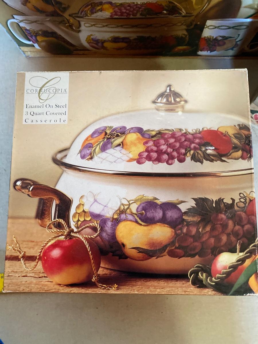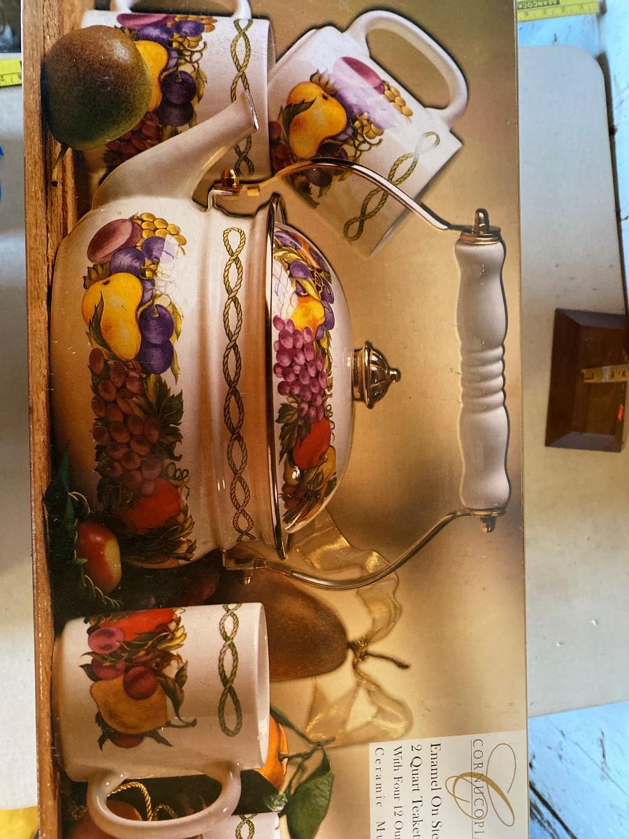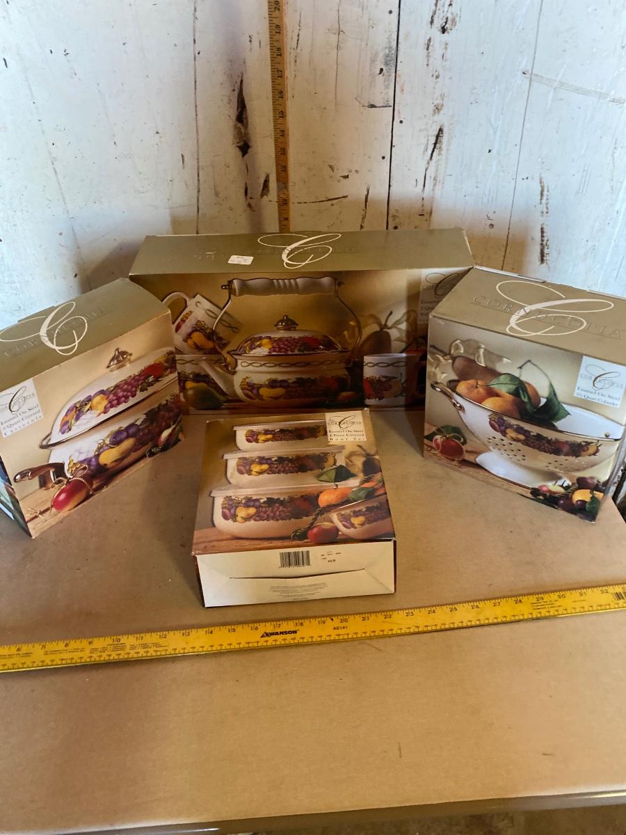 Brand new set of cornucopia bowls cooking pot strainer and tea pot with tea cups