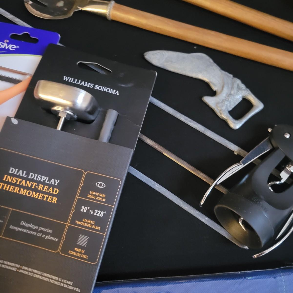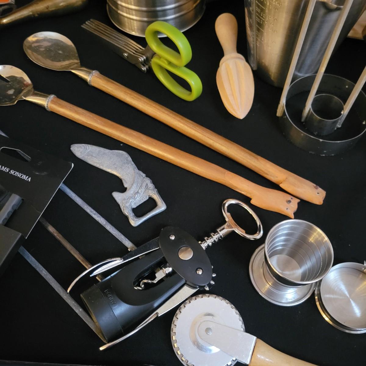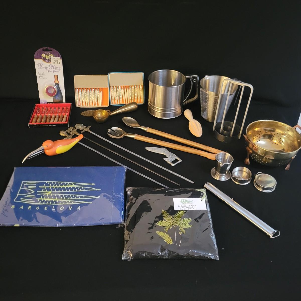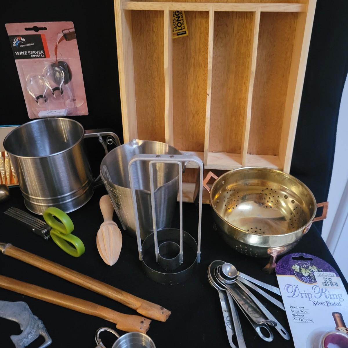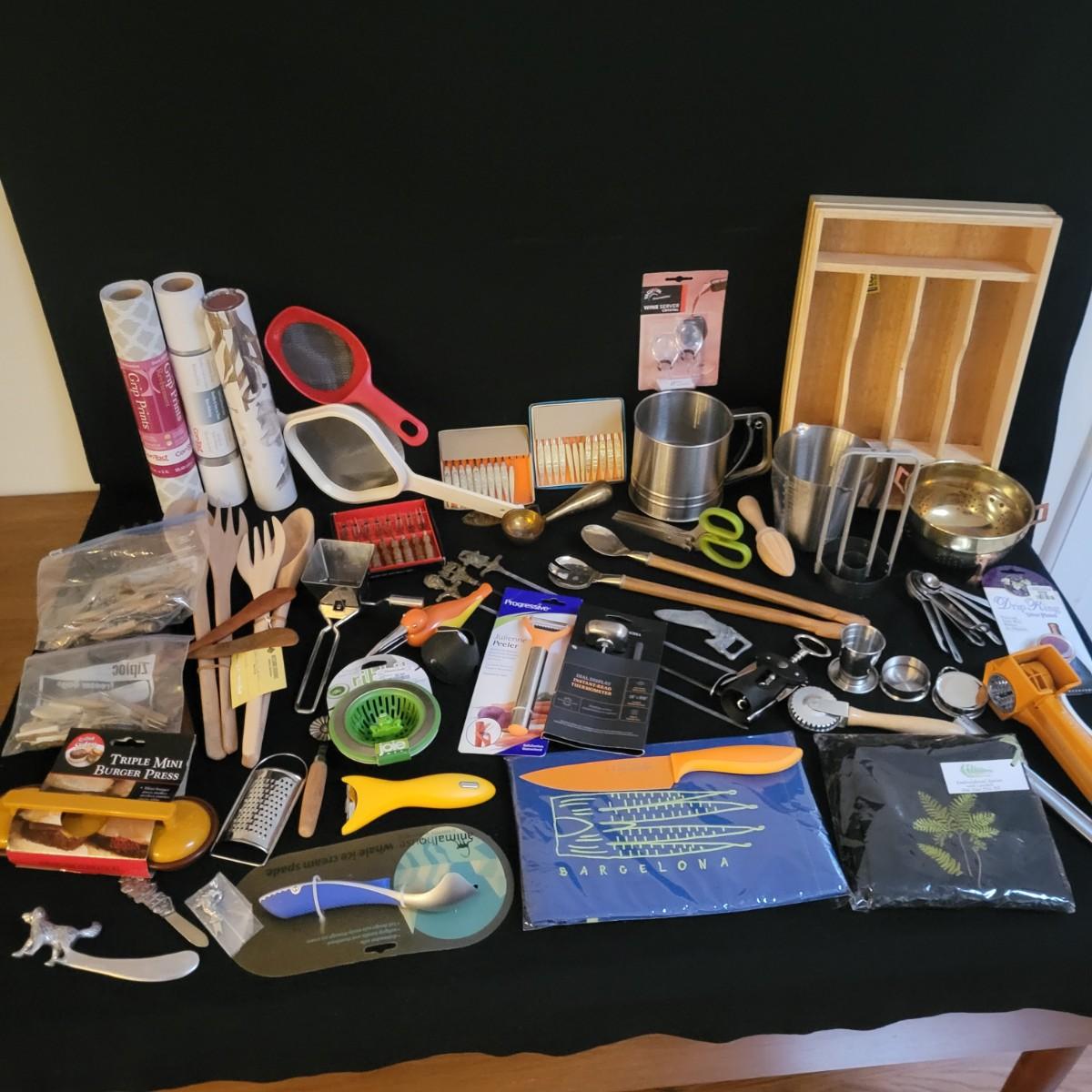 A huge assortment of kitchen accessories that includes aprons, hors dourves forks, wooden utensils, skewers, strainers organizers and so much more. See attached pictures for a full inventory. Local pickup only