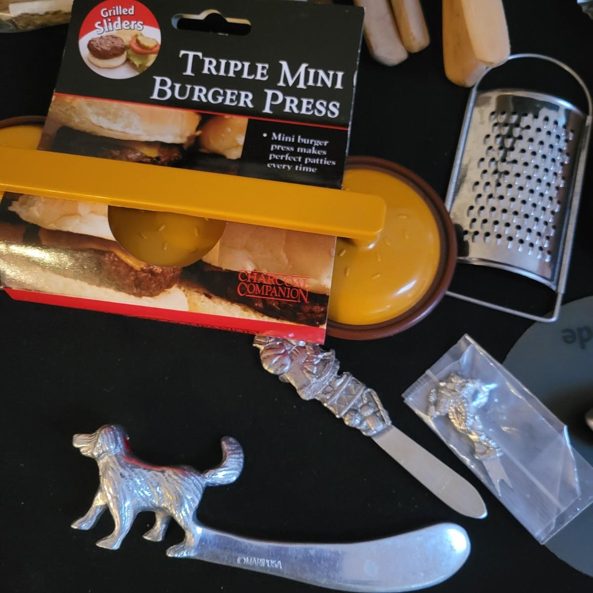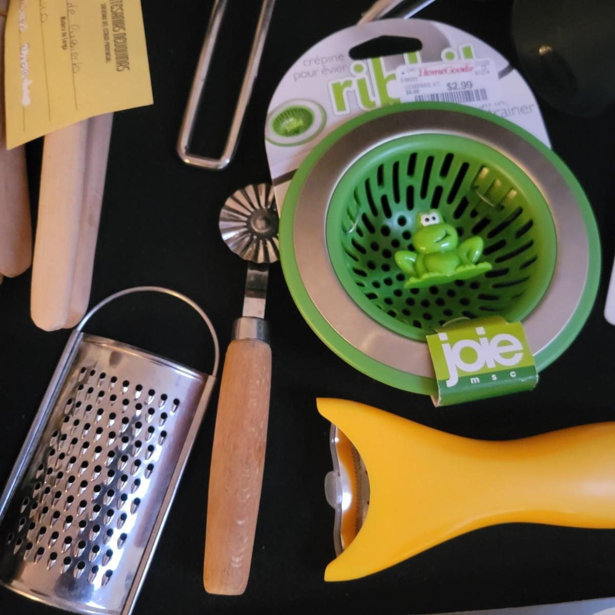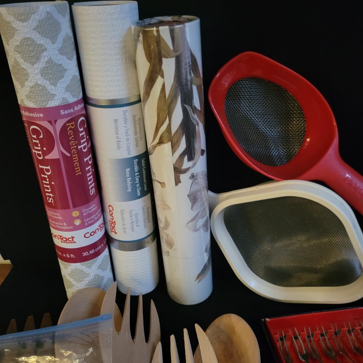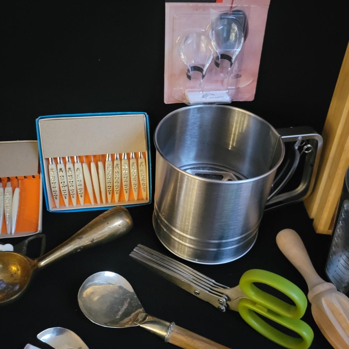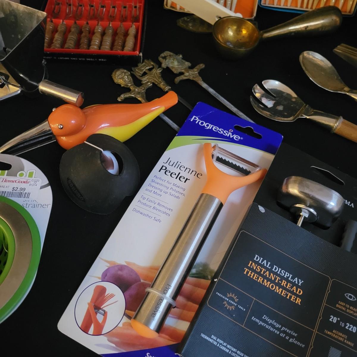 A huge assortment of kitchen accessories that includes aprons, hors dourves forks, wooden utensils, skewers, strainers organizers and so much more. See attached pictures for a full inventory. Local pickup only