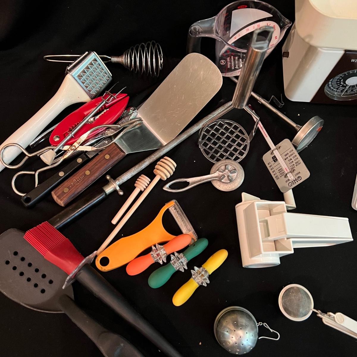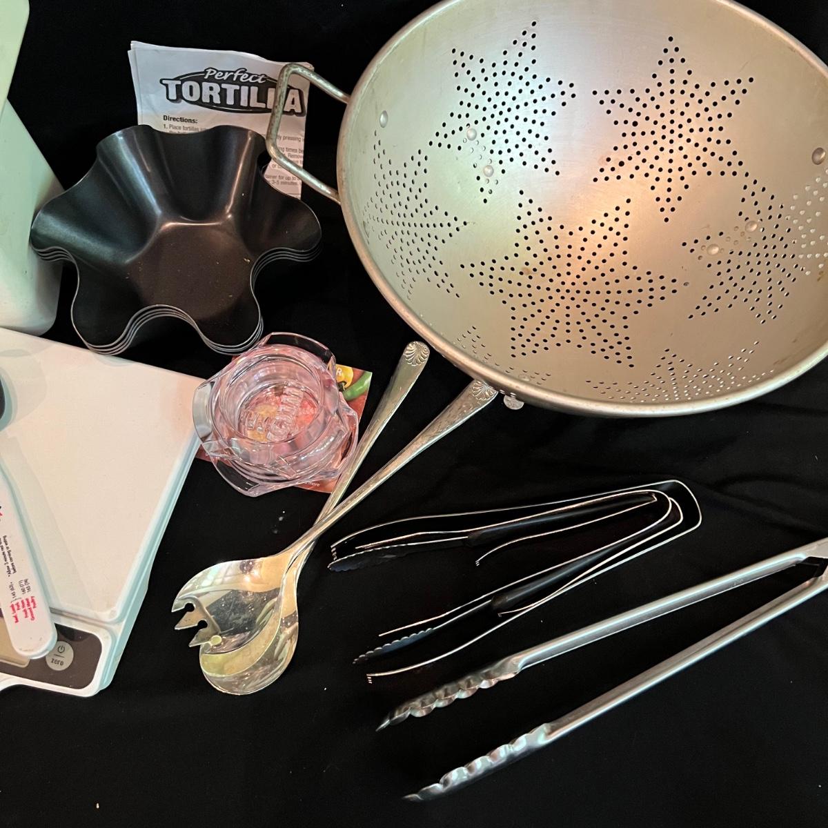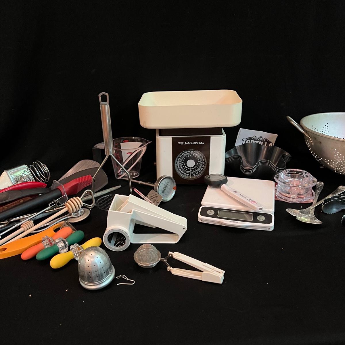All the kitchen essentials in one box! Tongs, two scales, colander, measuring cup, spatulas, tea strainers, Parmesan grater, potato masher and so much more!