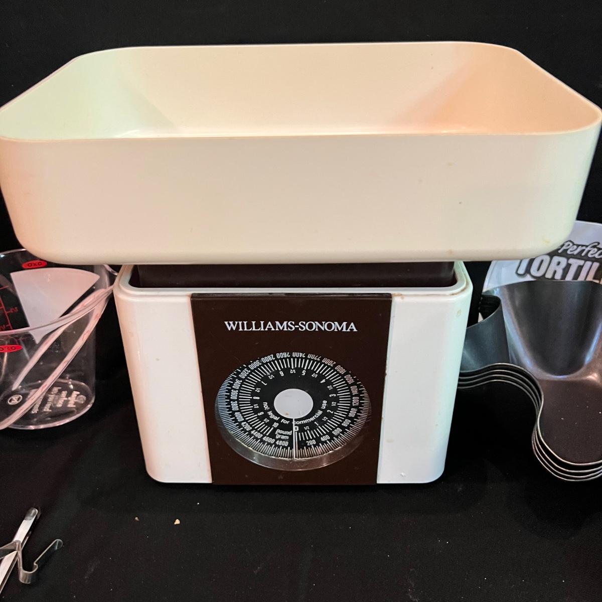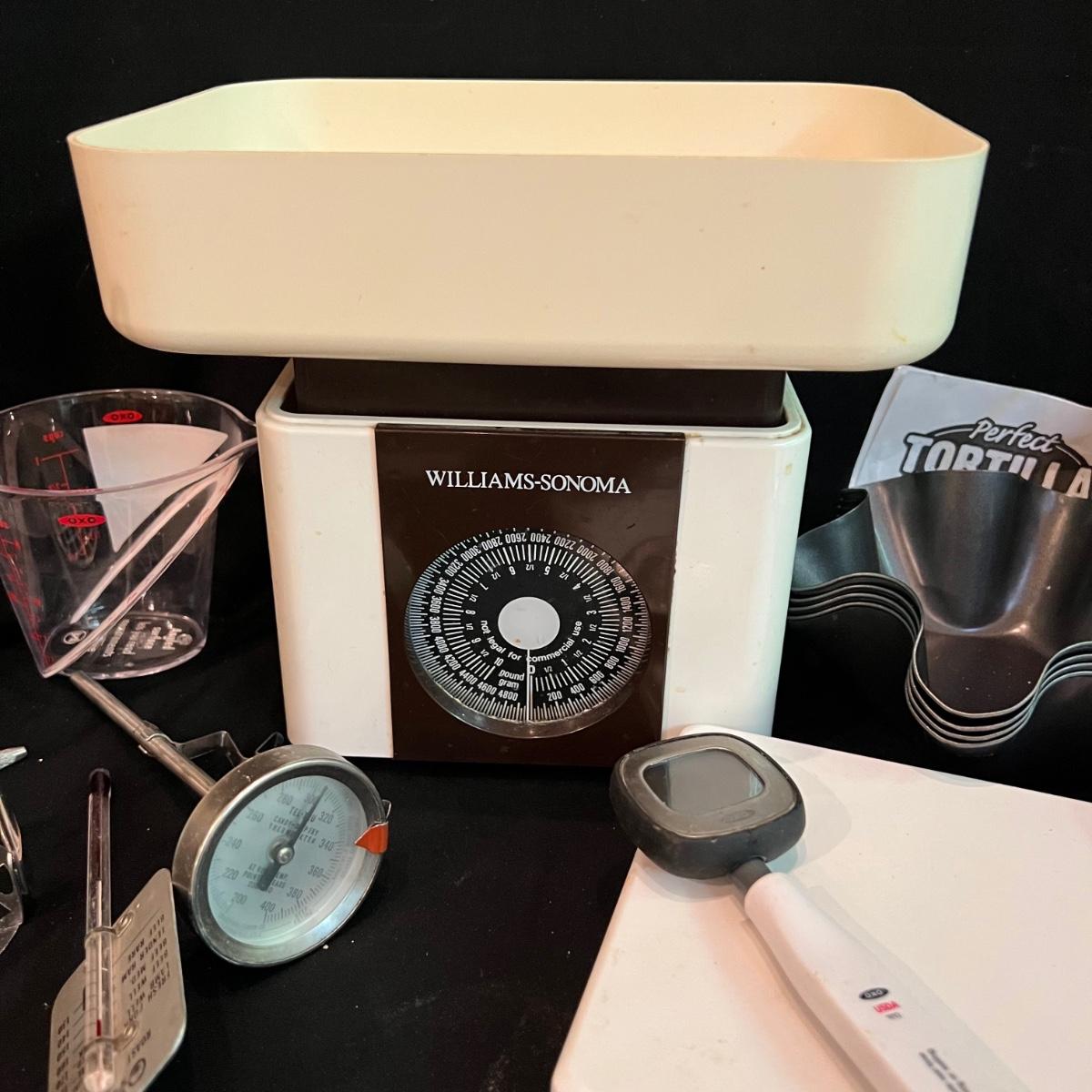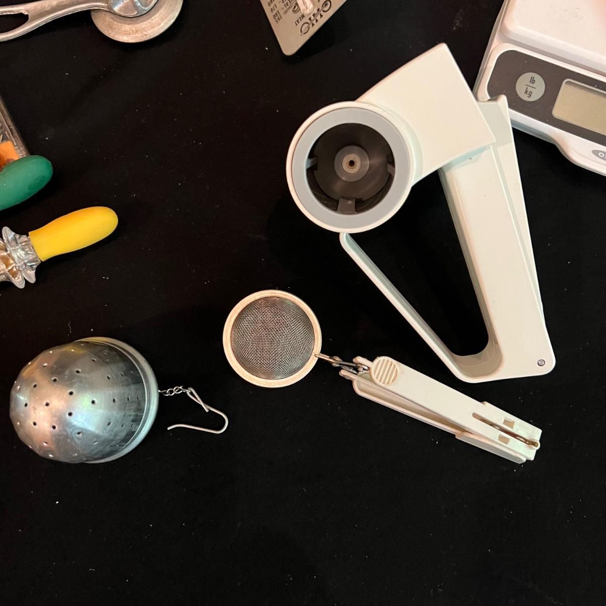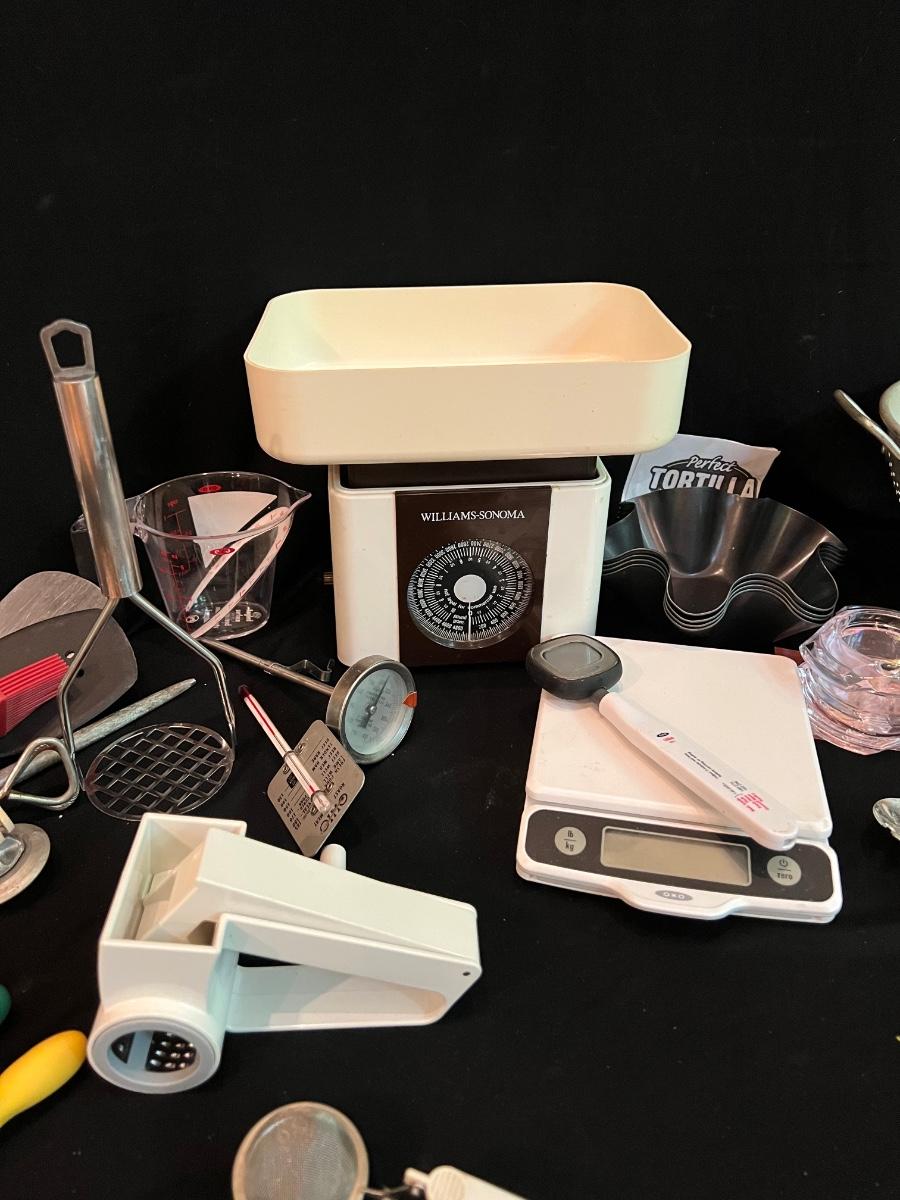 All the kitchen essentials in one box! Tongs, two scales, colander, measuring cup, spatulas, tea strainers, Parmesan grater, potato masher and so much more!