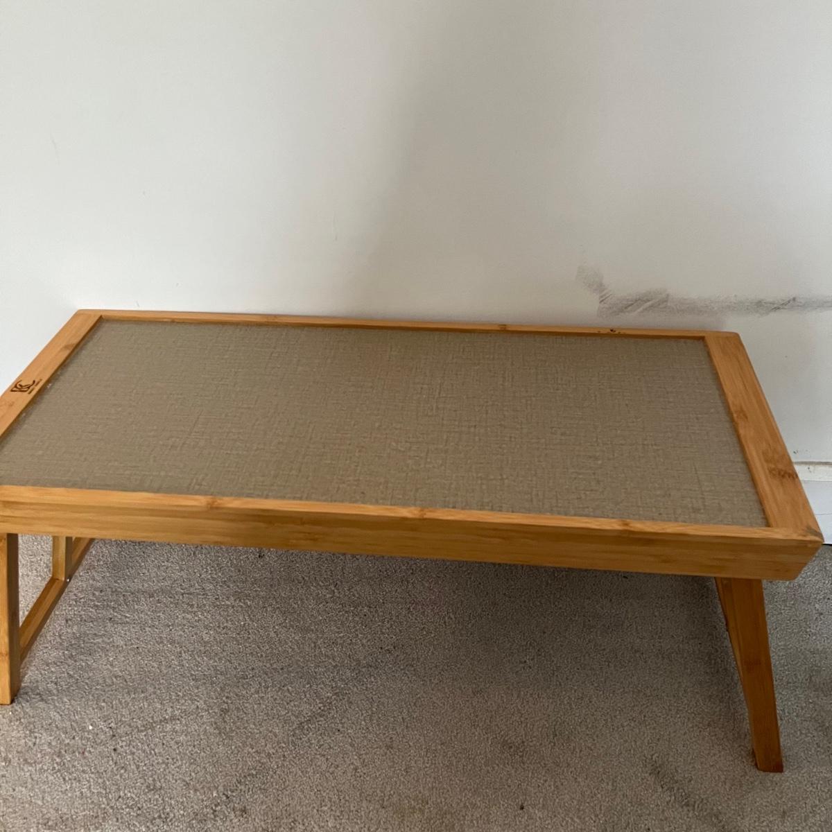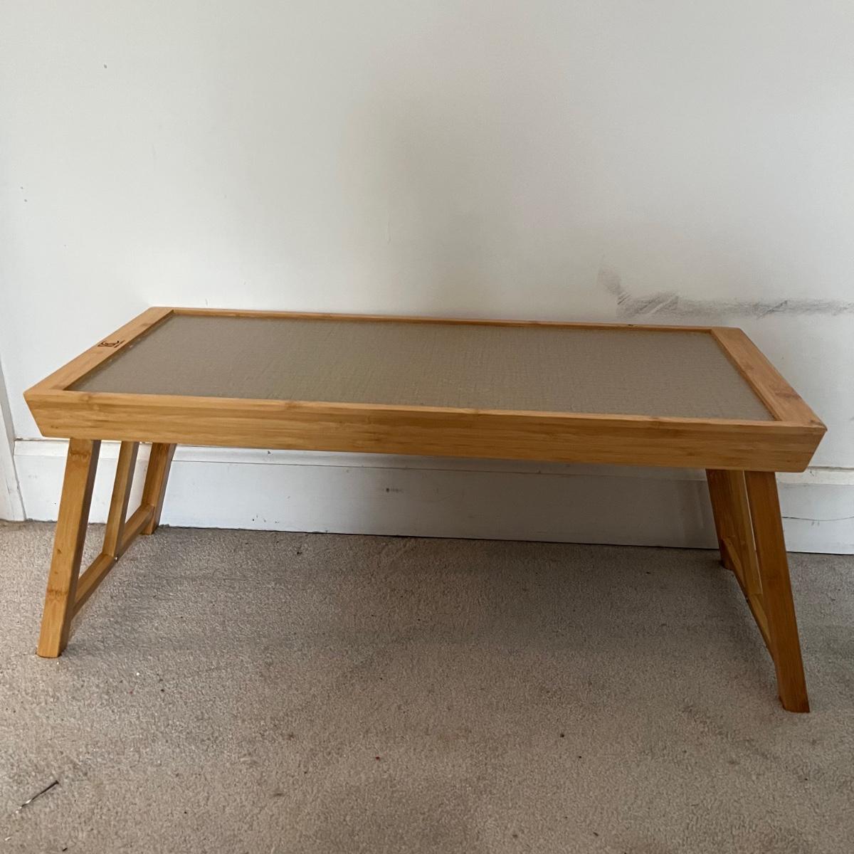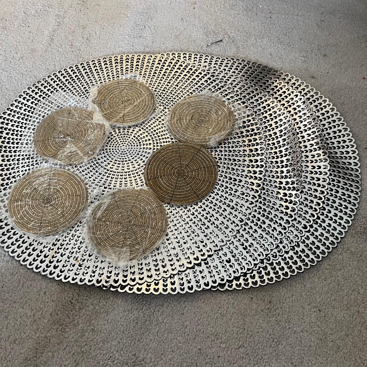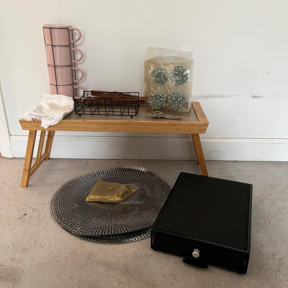 Lot contains four stackable coffee cups, breakfast in bed table, four placemats, six coasters, wooden tongs, blingy napkin n rings and more. Breakfast in bed table measures 11” x 25” x 11”.