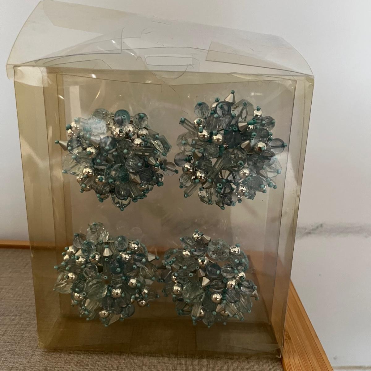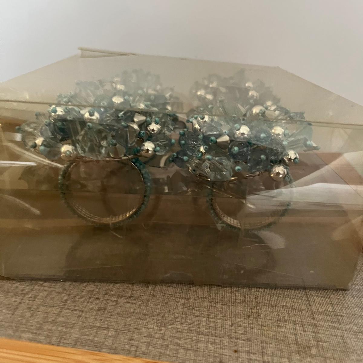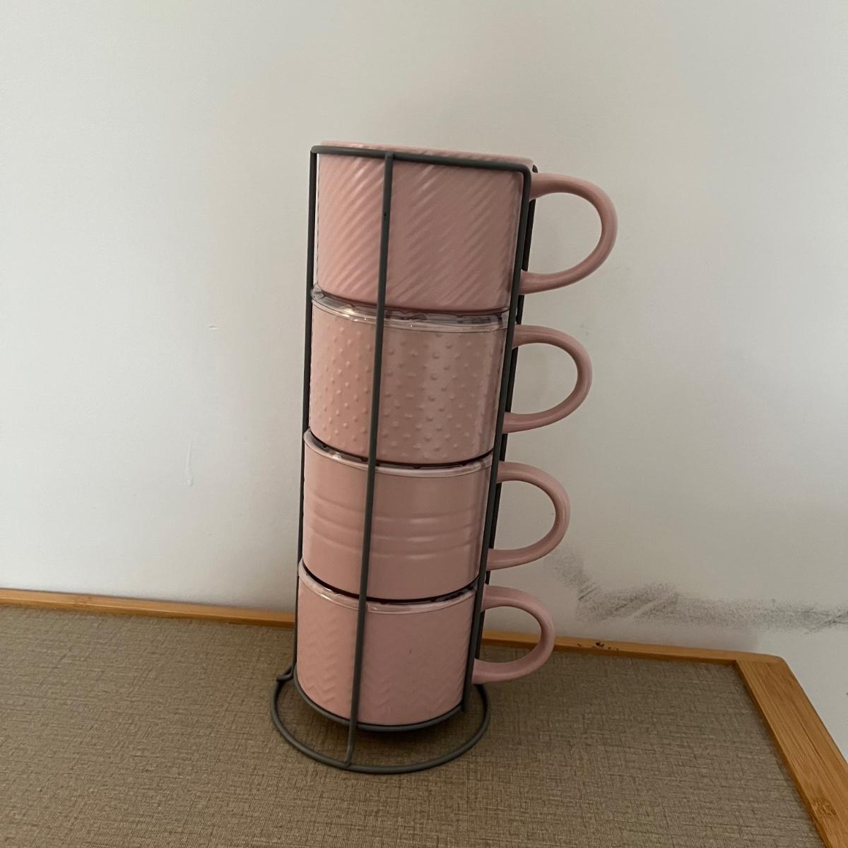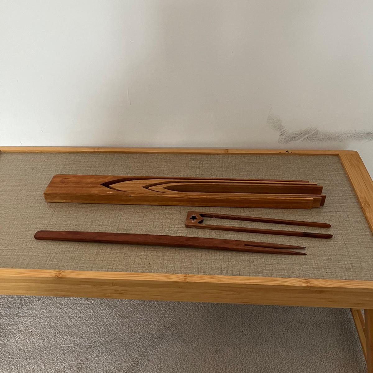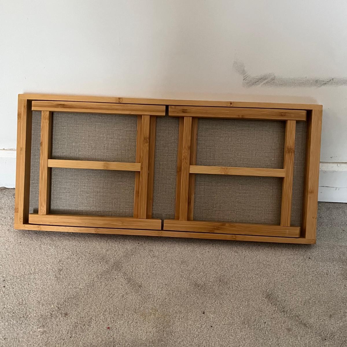 Lot contains four stackable coffee cups, breakfast in bed table, four placemats, six coasters, wooden tongs, blingy napkin n rings and more. Breakfast in bed table measures 11” x 25” x 11”.