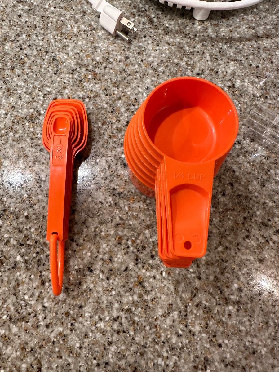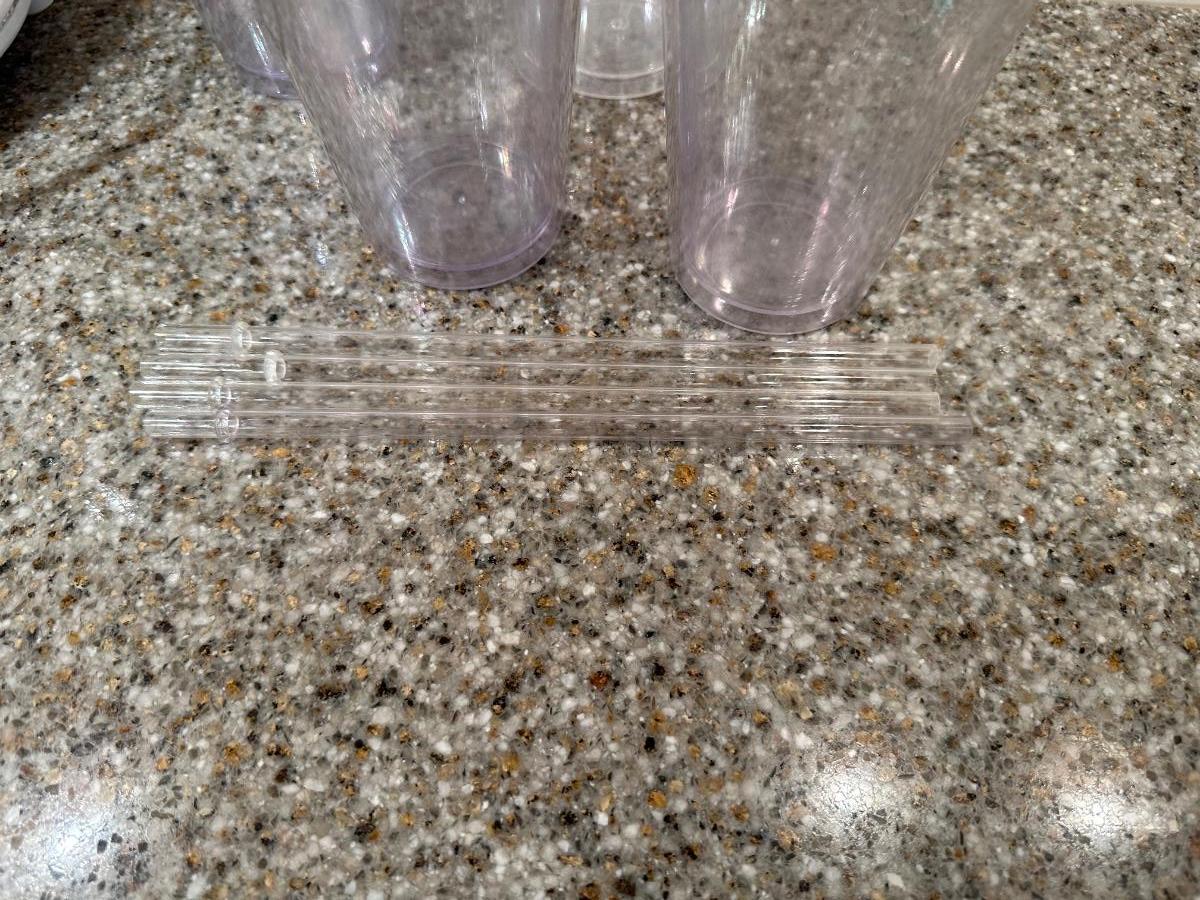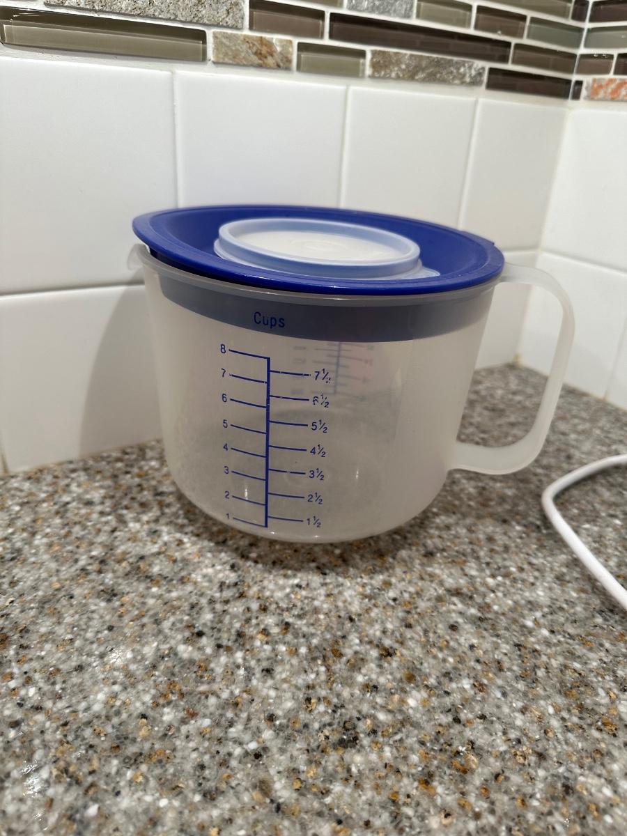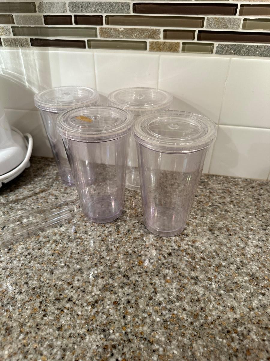 MEASURING CUPS AND PLASTIC GLASSES WITH LIDS.