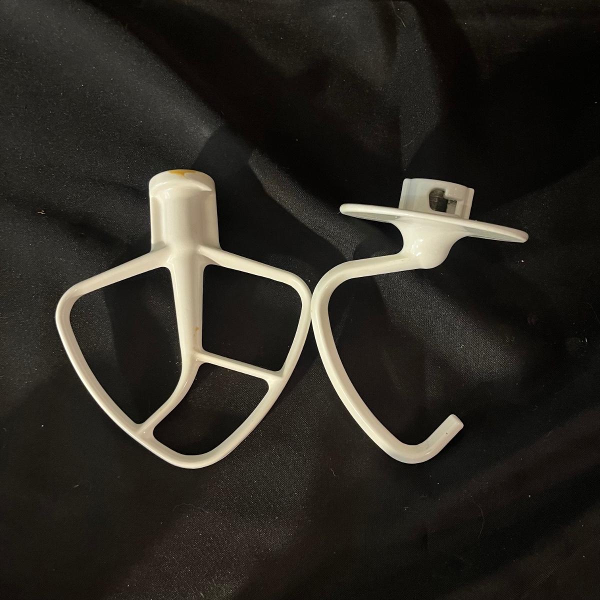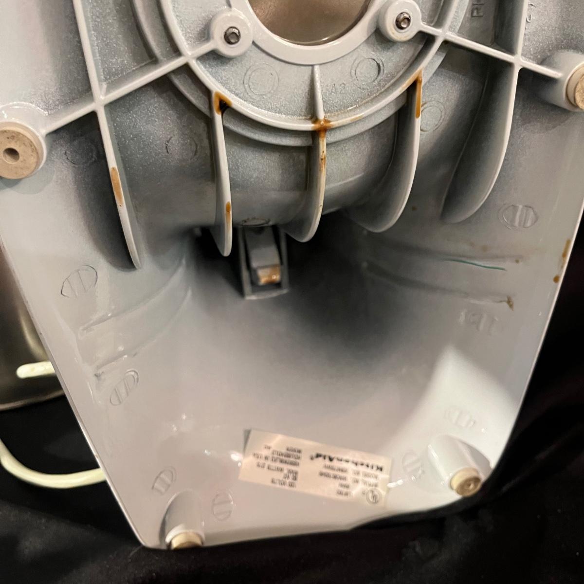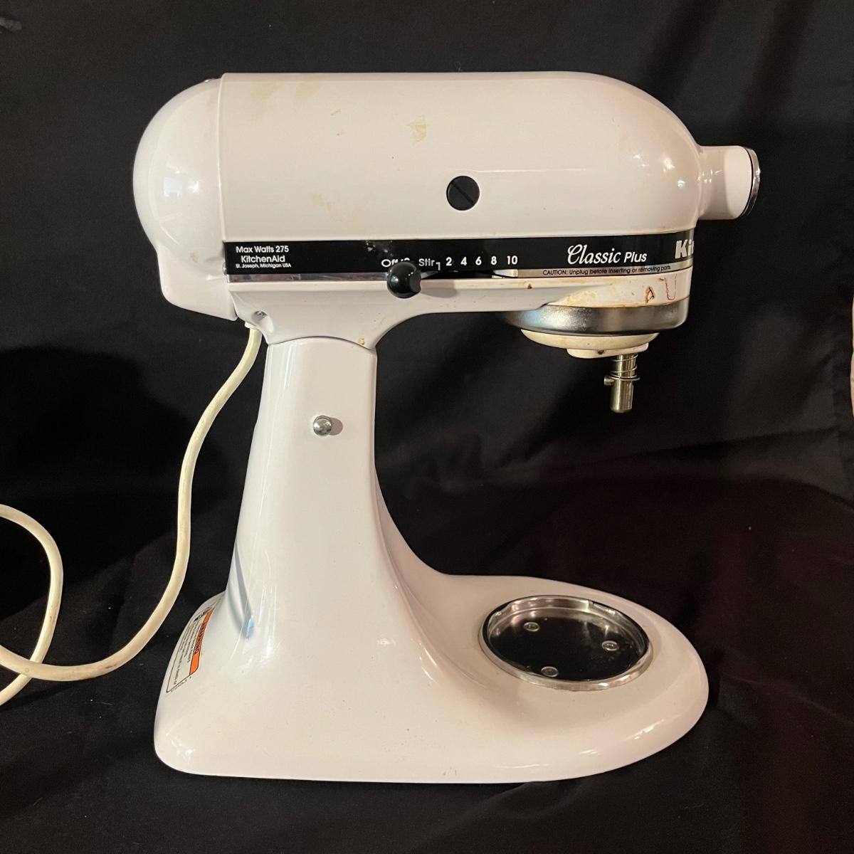 This Kitchen Aid Mixer includes stainless steel bowl with a wire whip, dough hook and flat beater. Mixer powered on when plugged in. Mixer measures 8.5” x 13” x 14”H.