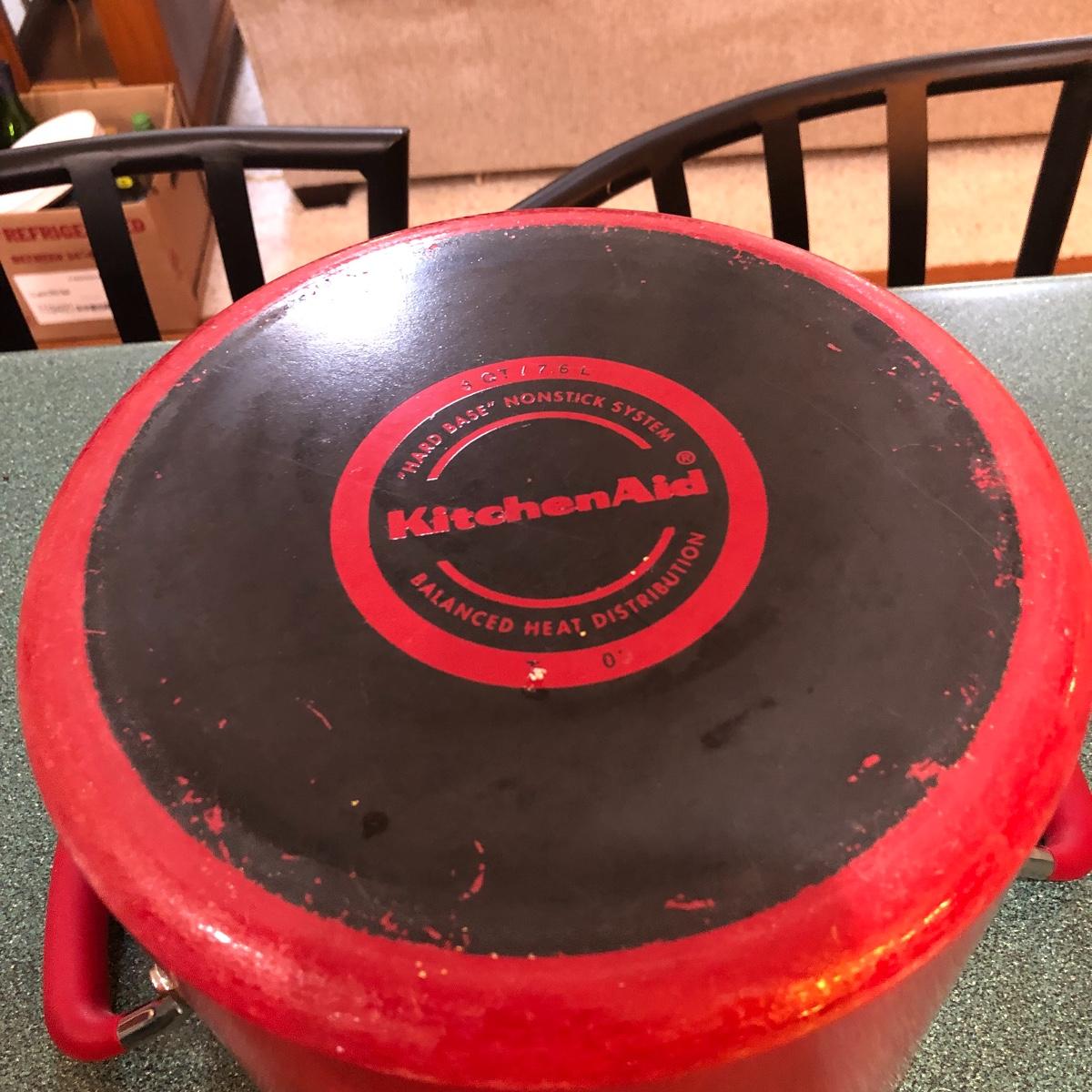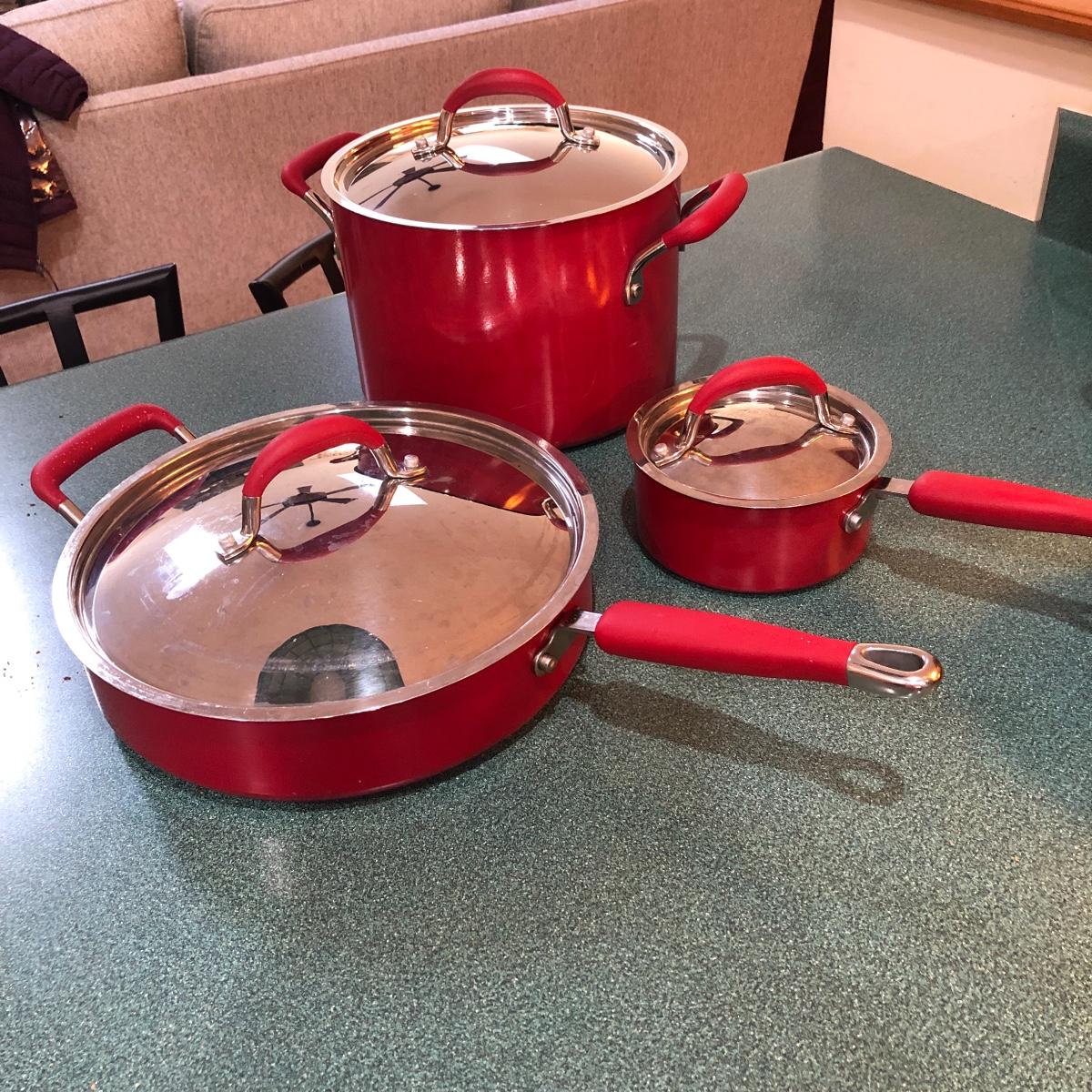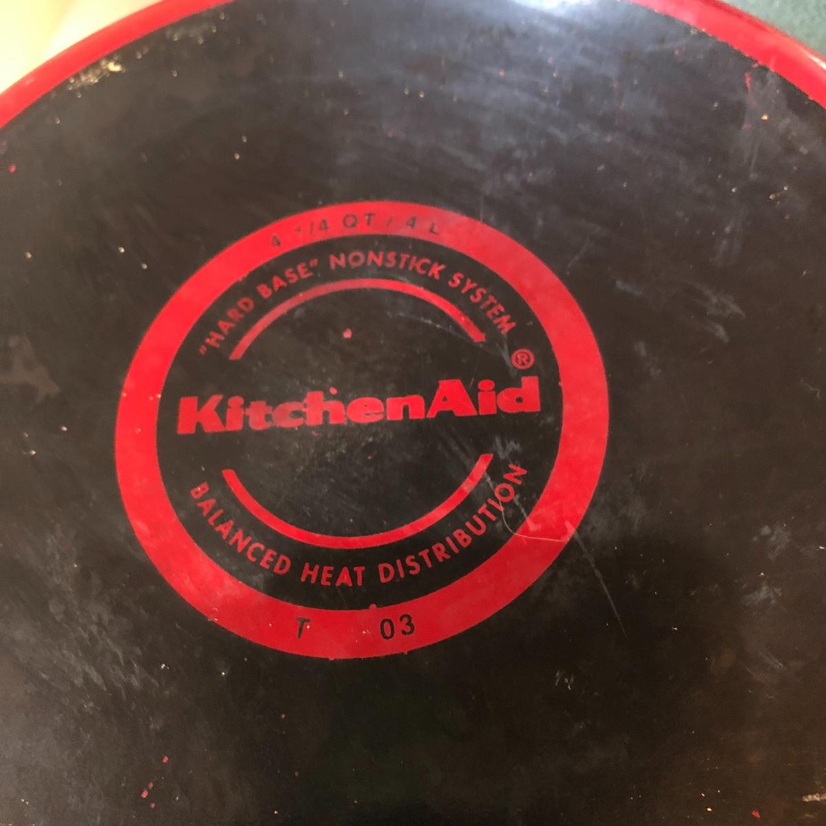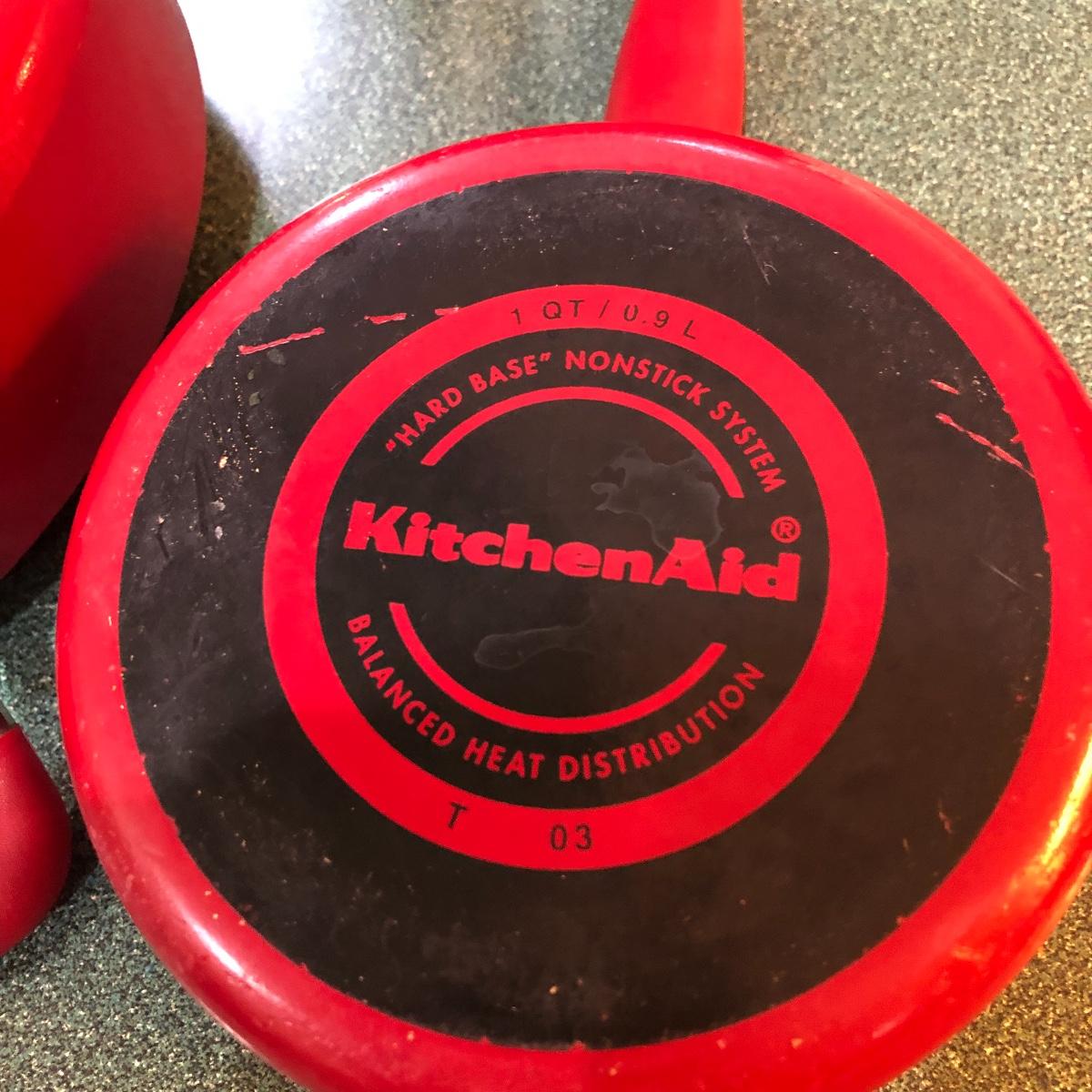 There are 3 Kitchen Aid pieces: a 4 quart pot with lid, 4 1/4 quart skillet with lid and one one quart pot with lid. There is another red pot with lid which is a 2 quart WearEver. There are four skillets - two Calphalon skillets (8” & 10”) and two Bialetti skillets (13” & 10.5”). There is one enamel stock pot and a 4 egg poacher. Lastly, there are 3 skillet grease screens. Shipping Available.
