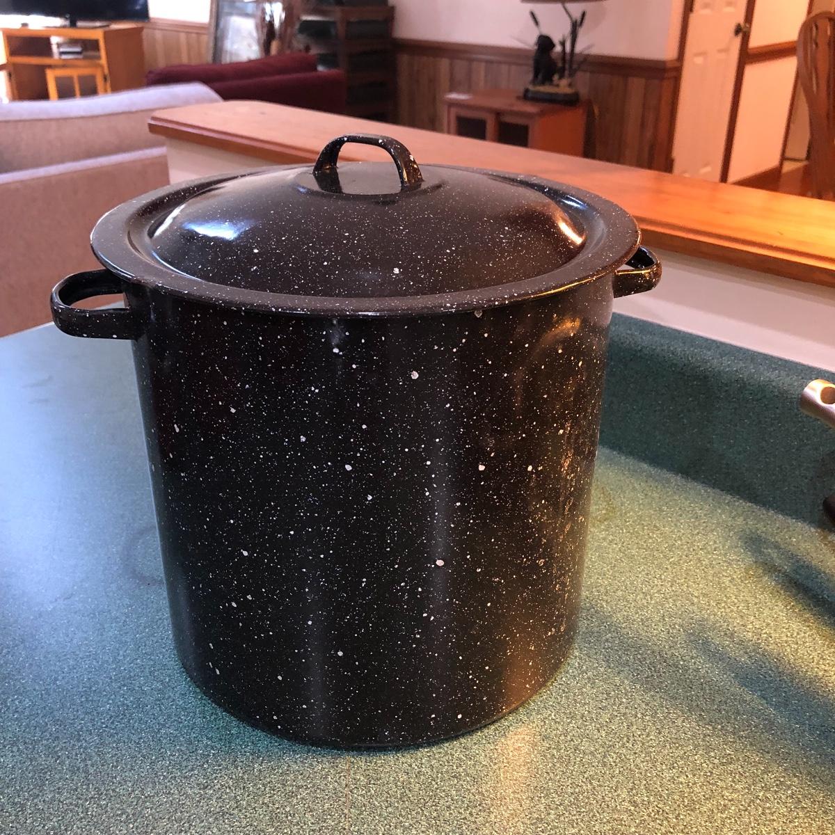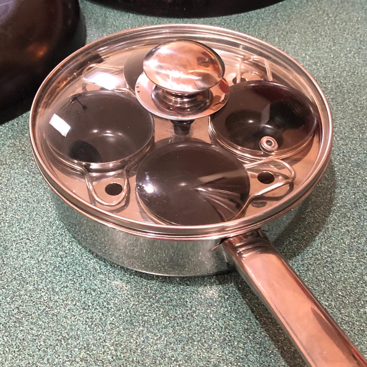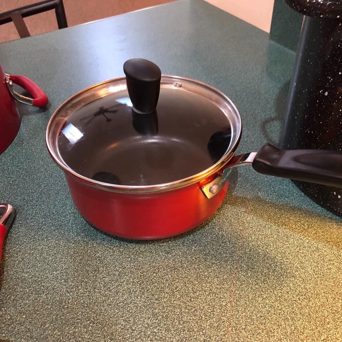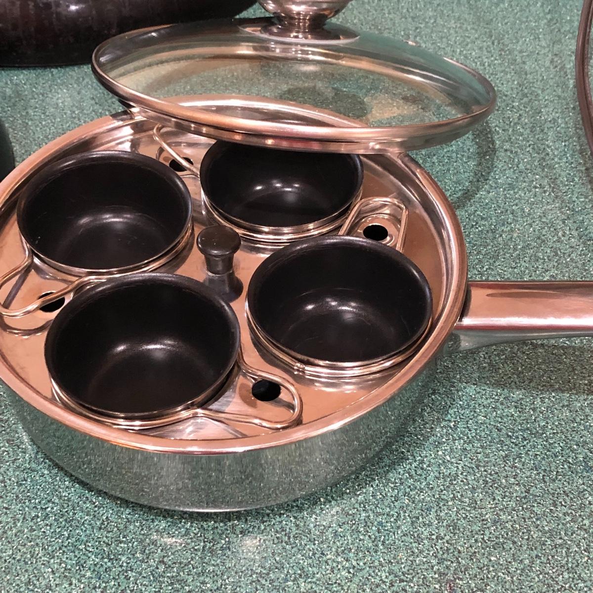There are 3 Kitchen Aid pieces: a 4 quart pot with lid, 4 1/4 quart skillet with lid and one one quart pot with lid. There is another red pot with lid which is a 2 quart WearEver. There are four skillets - two Calphalon skillets (8” & 10”) and two Bialetti skillets (13” & 10.5”). There is one enamel stock pot and a 4 egg poacher. Lastly, there are 3 skillet grease screens. Shipping Available.