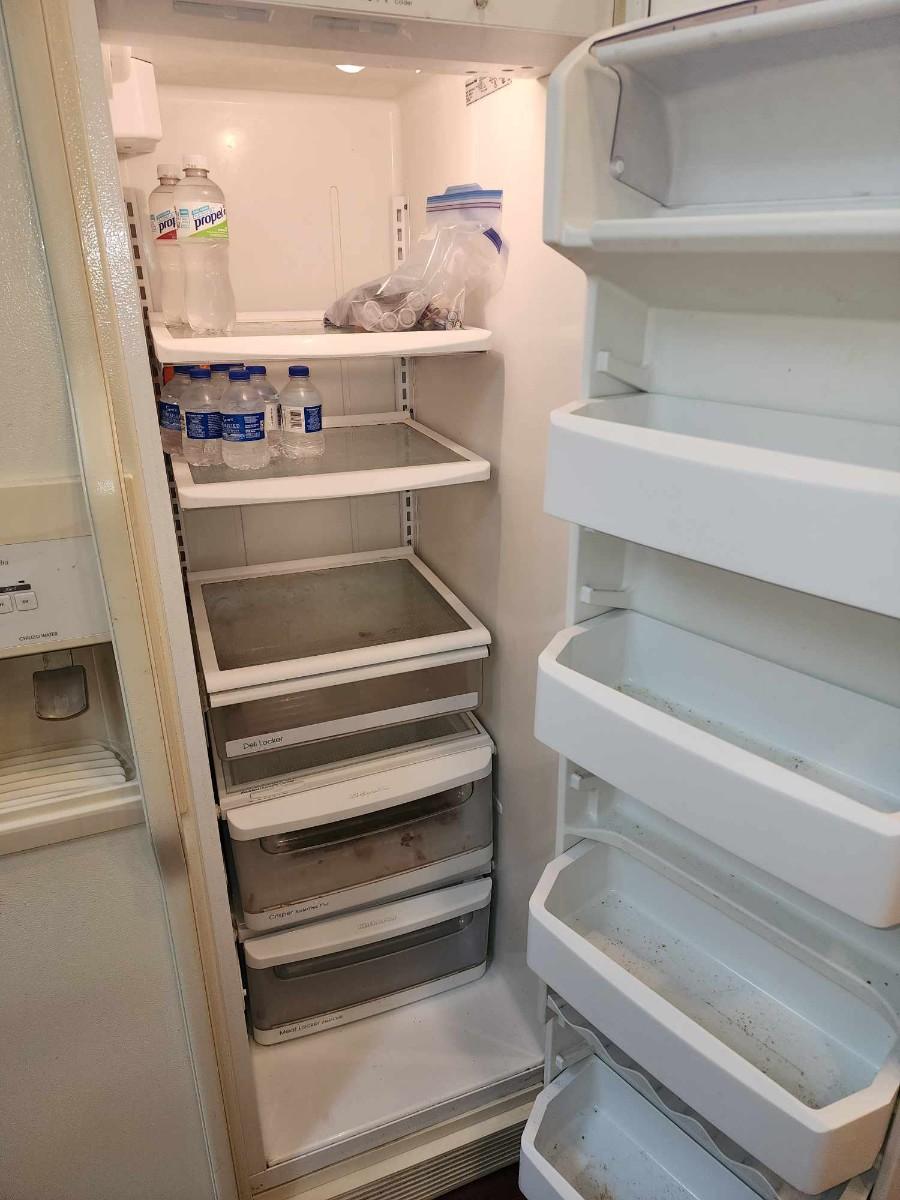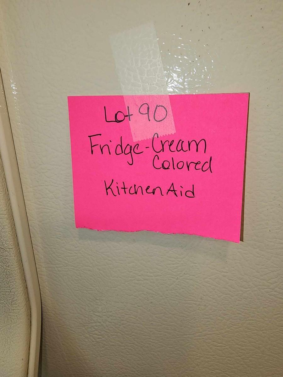 Cream colored fridge. In good working order.