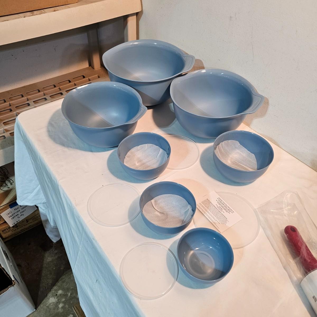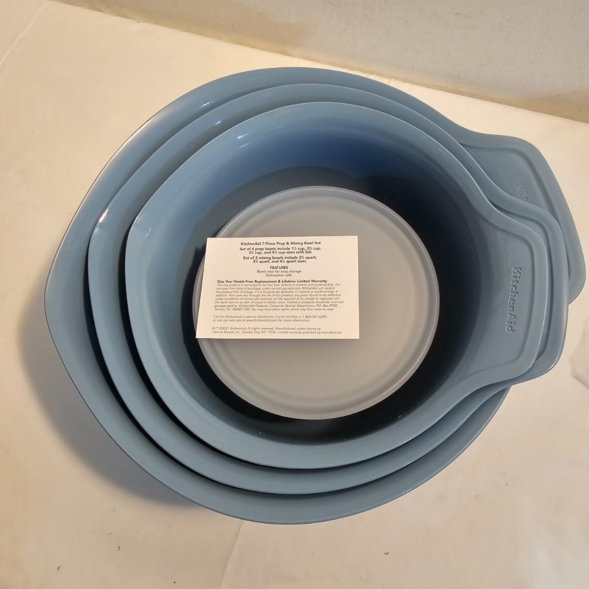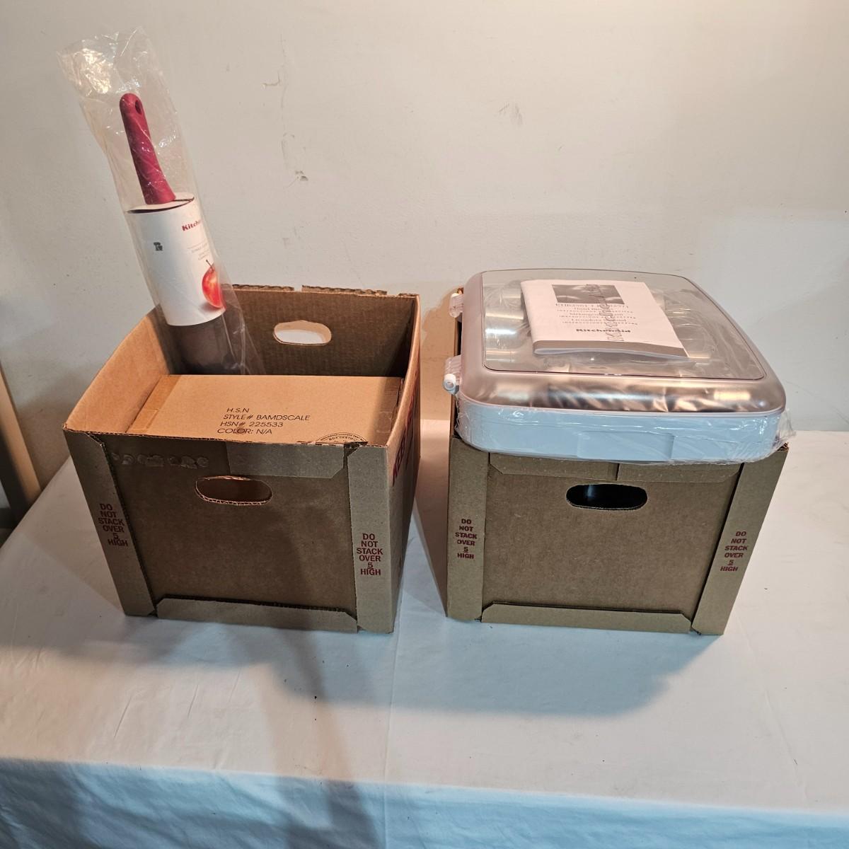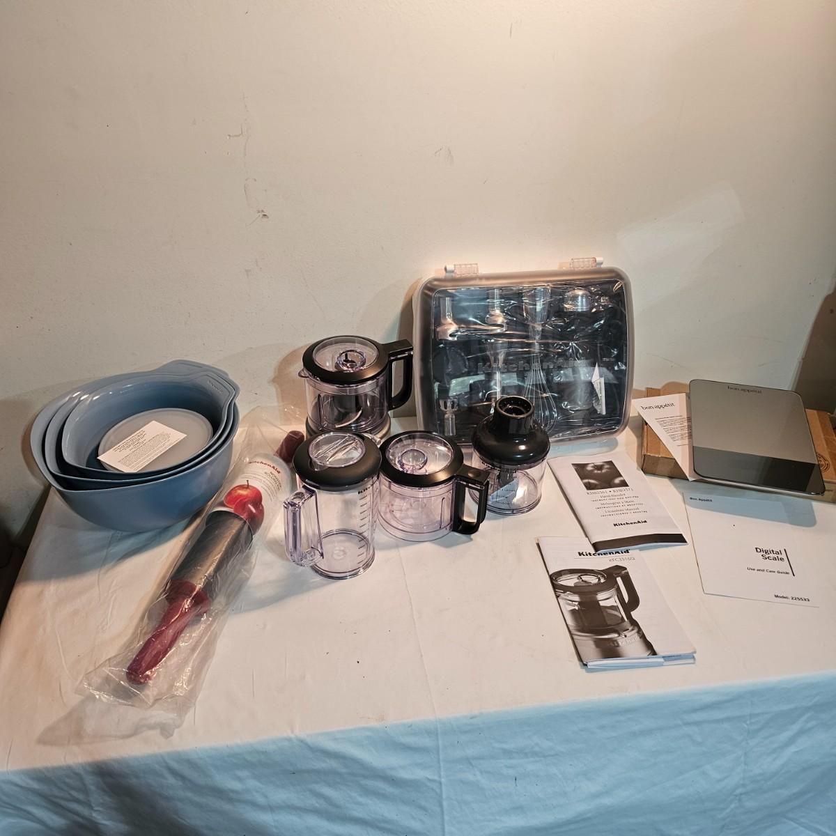 Small hand appliances by Kitchen Aid and Bon Appetit. One battery operated digital scale by Bon Appetit, not tested. One Kitchen Aid Small food processor with extra containers and a pitcher. A Kitchen Aid hand blender with several attachments in a self contained case. A Kitchen Aid 10" non stick rolling pin and a set of seven mixing bowls that all nest together, largest bowl is 12" x 11" x 6"H. Both appliances powered on when plugged in. All items appear NIB. See photos for details. Shipping available.