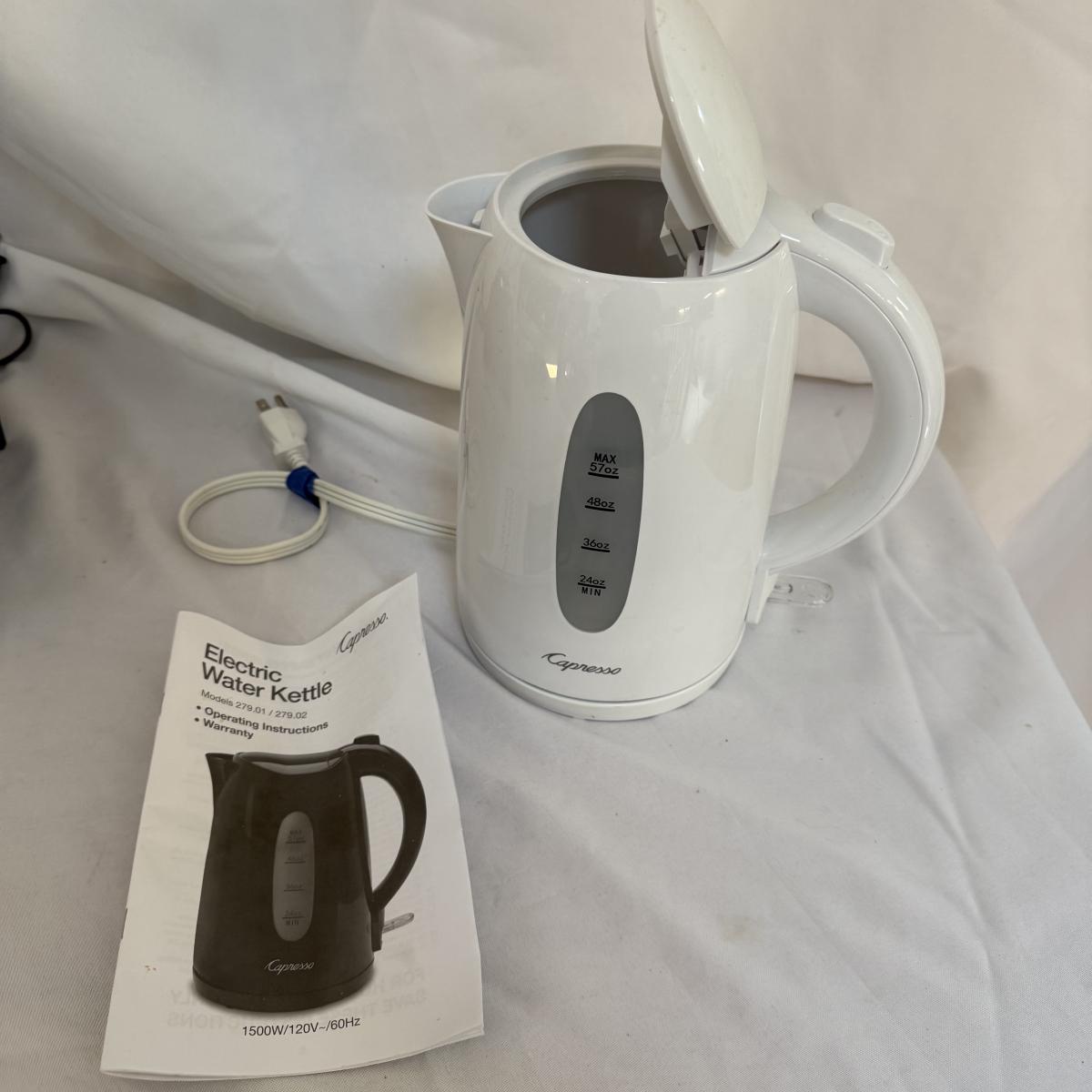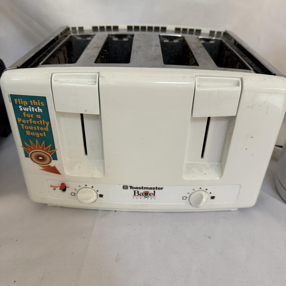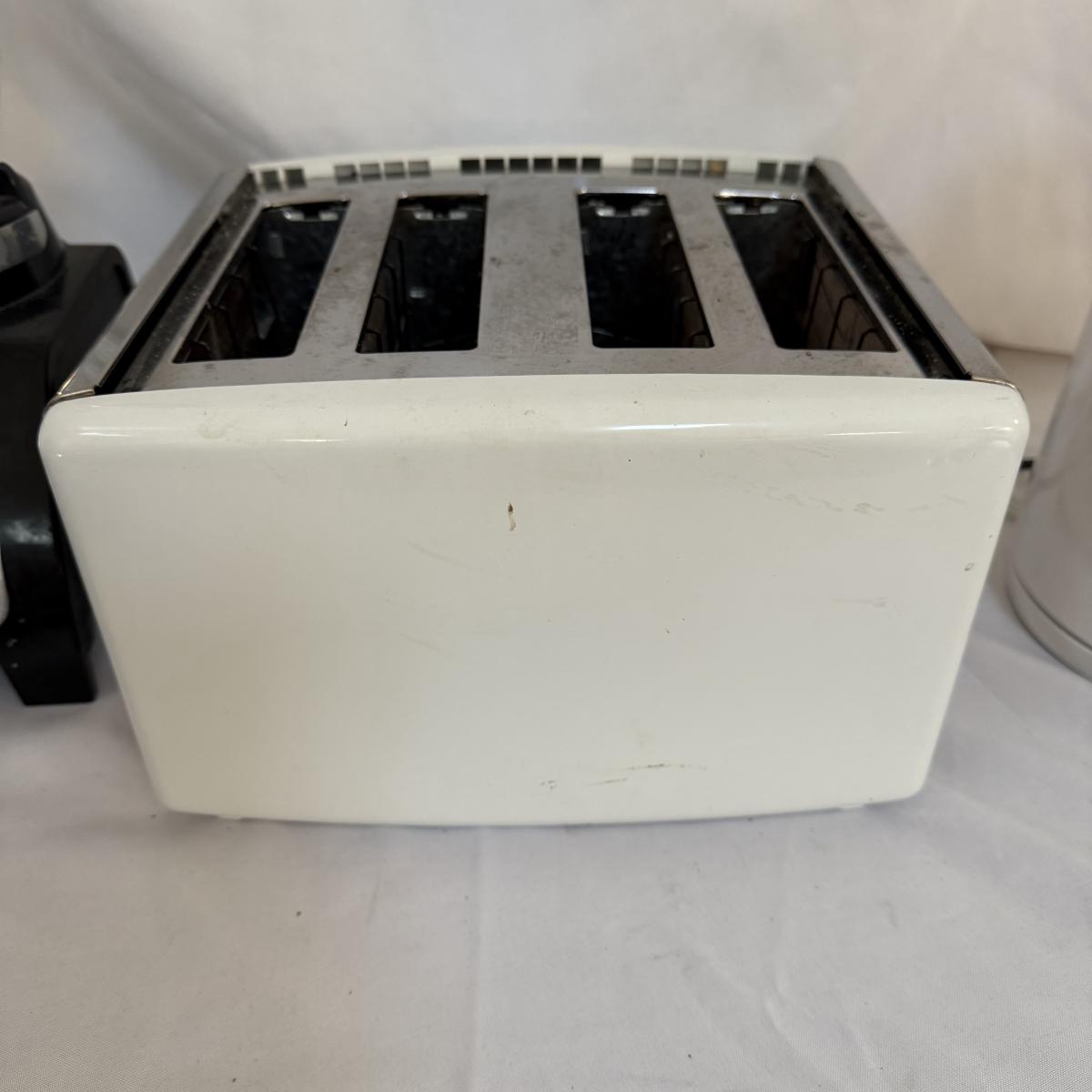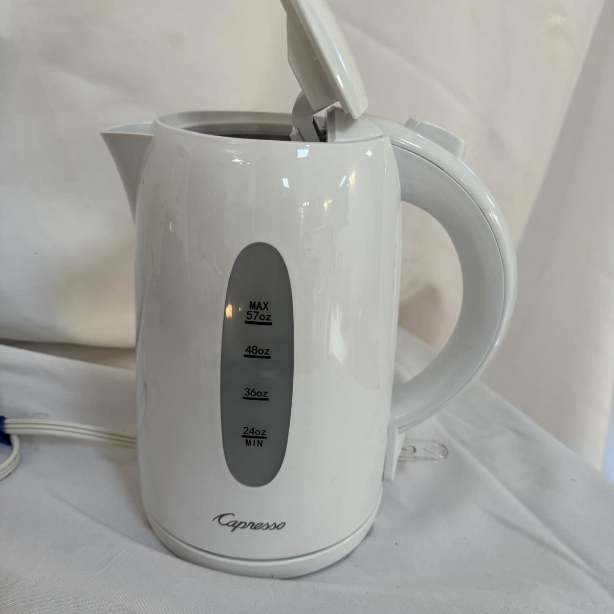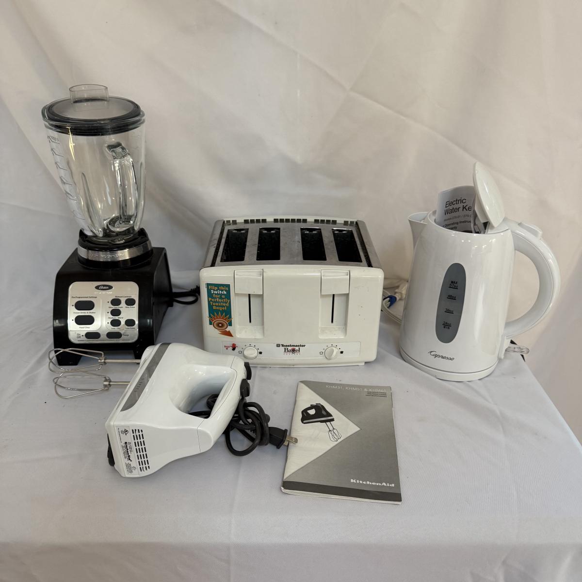 This lot contains four small kitchen appliances including an Oster blender, a toastmaster bagel toaster, a Capresso electric Kettle, and a Kitchenaid handheld mixer. All of these items power on. The toaster measures 10.5” x 9.5” x 6.5”H and the blender measures 6” x 7.5” x 14.5”H. See pictures for details. Shipping available.