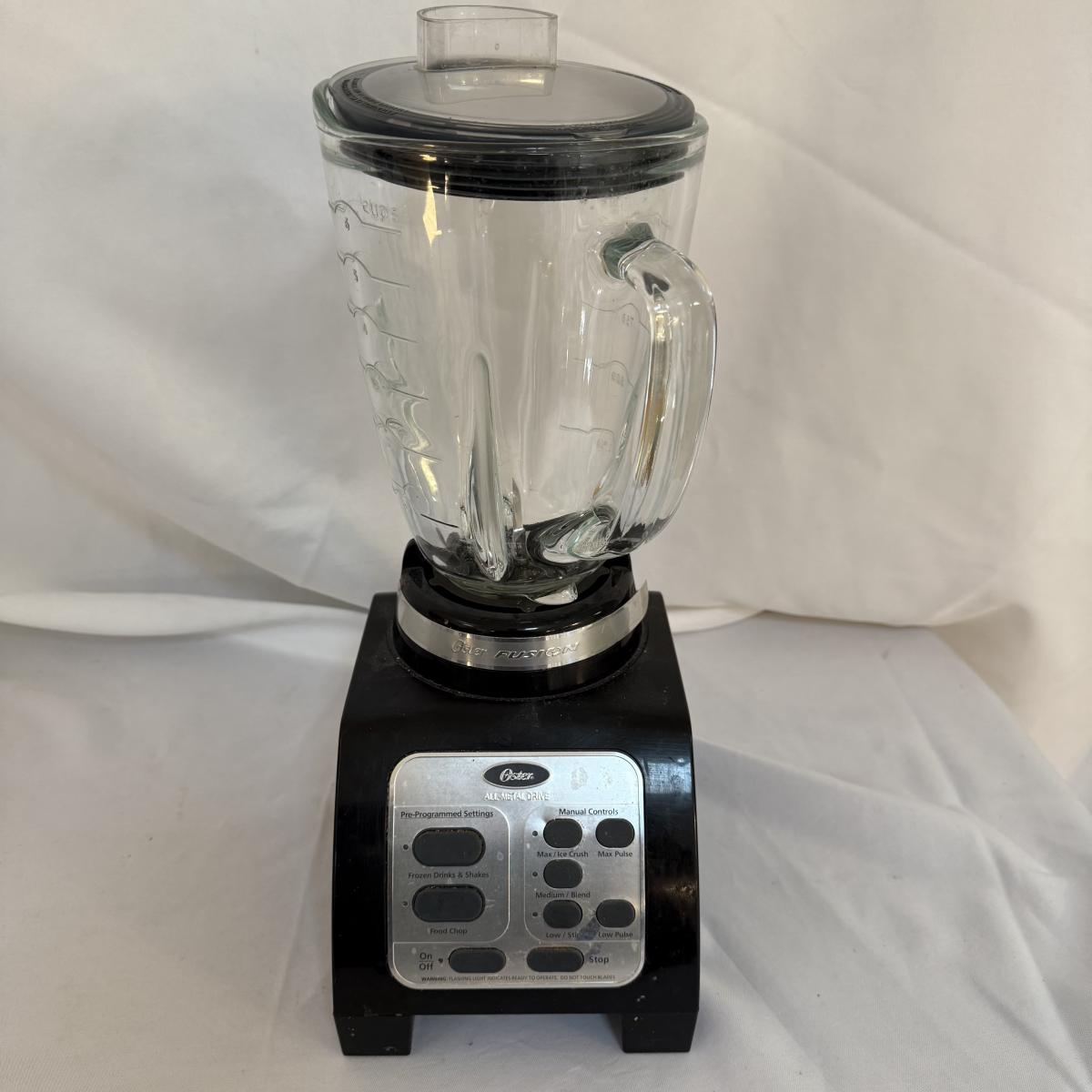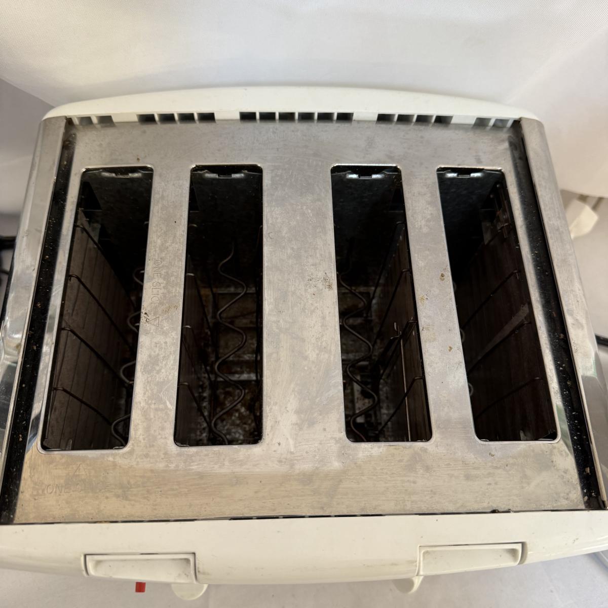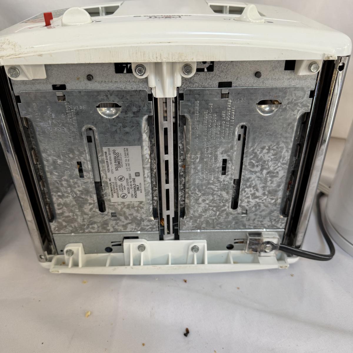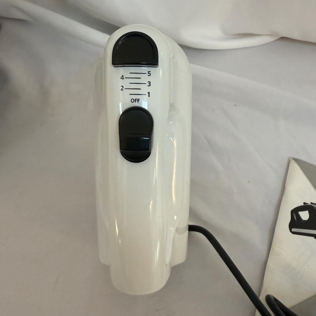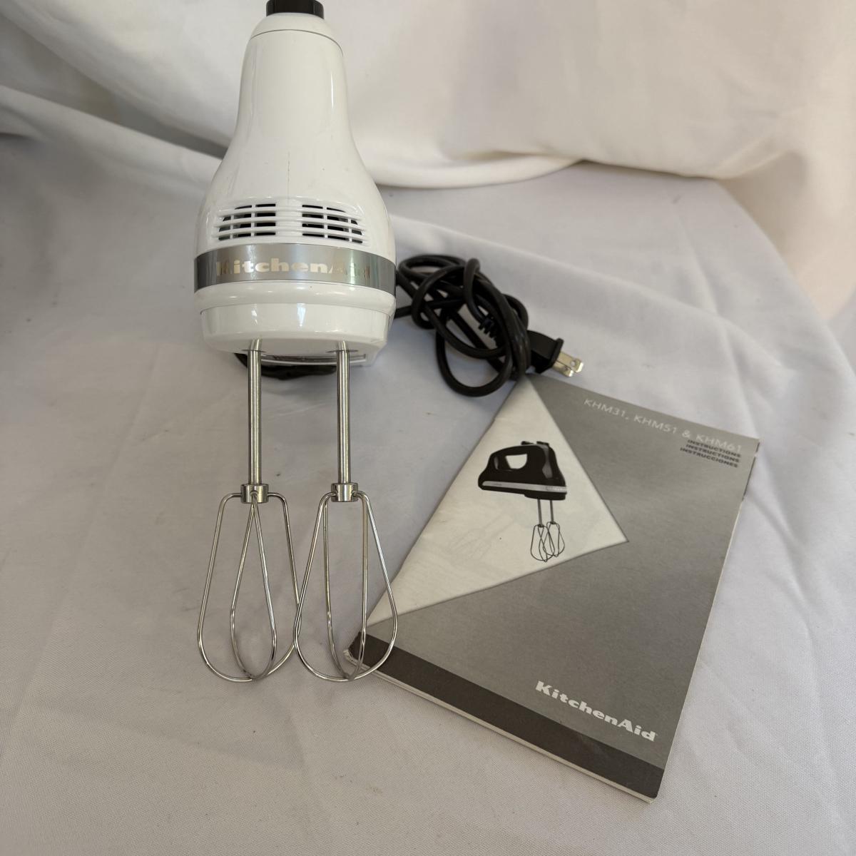 This lot contains four small kitchen appliances including an Oster blender, a toastmaster bagel toaster, a Capresso electric Kettle, and a Kitchenaid handheld mixer. All of these items power on. The toaster measures 10.5” x 9.5” x 6.5”H and the blender measures 6” x 7.5” x 14.5”H. See pictures for details. Shipping available.