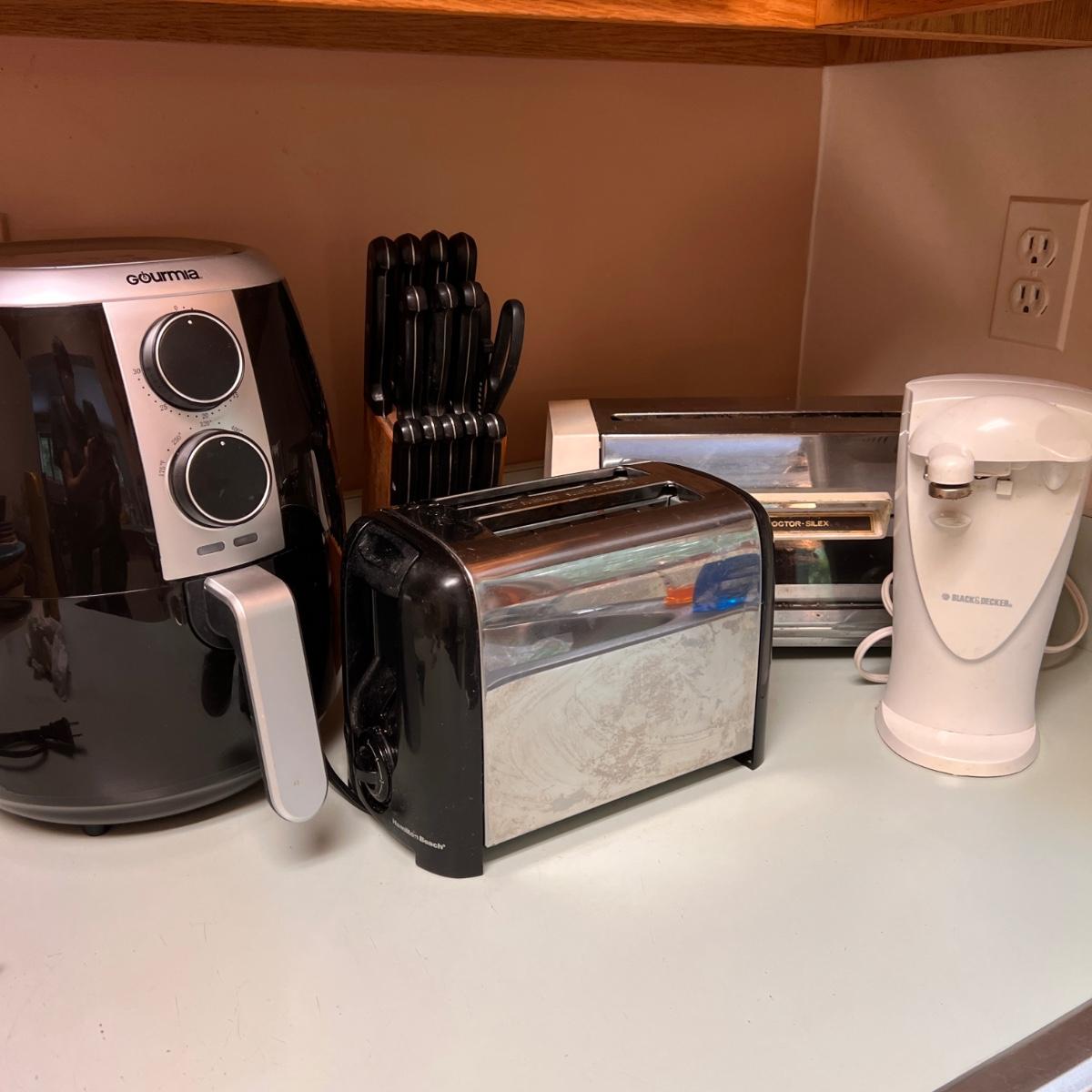 All tested and work. Gourmia air fryer in good used condition. The older model toaster is a broiler toaster oven combo. One of the knives is missing.