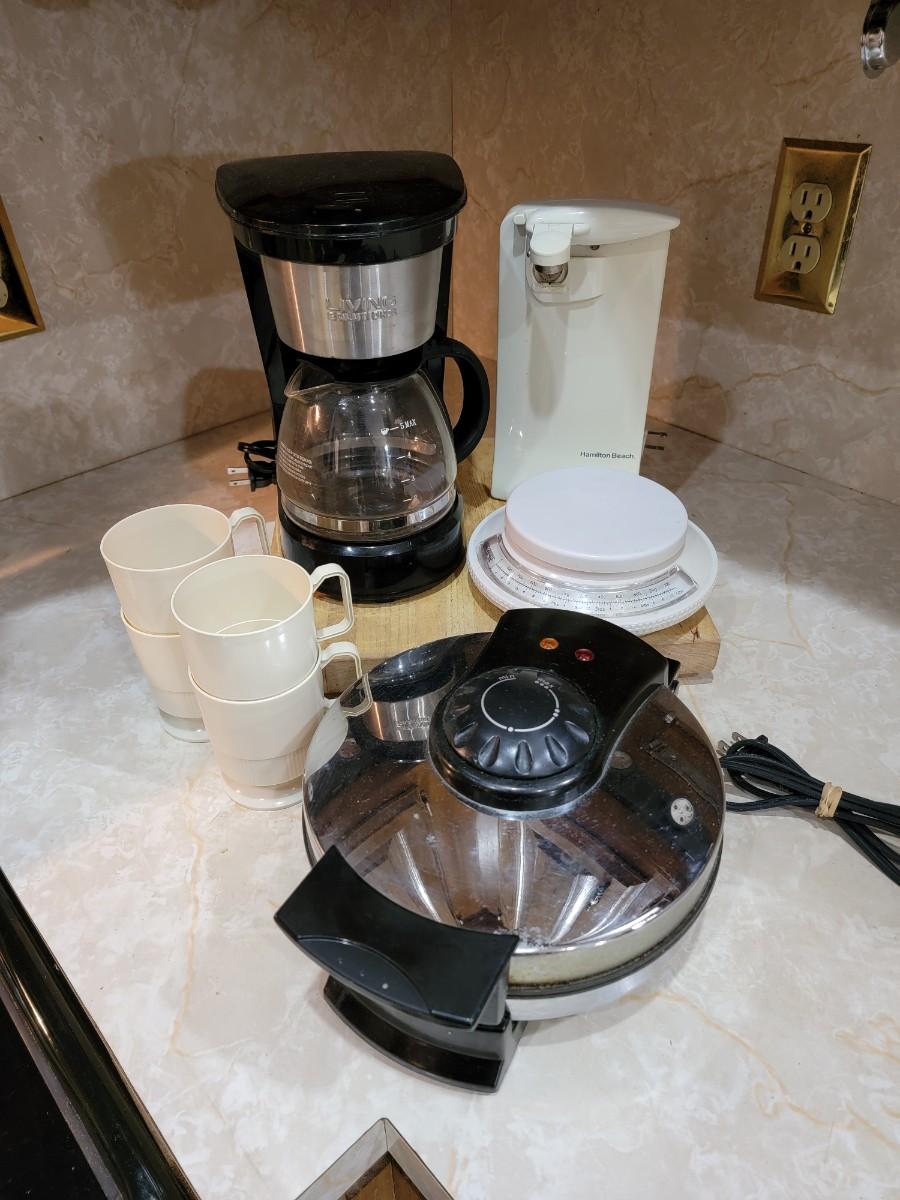 Coffee pot, can opener, food scale, waffle maker, 4vtg coffee cups